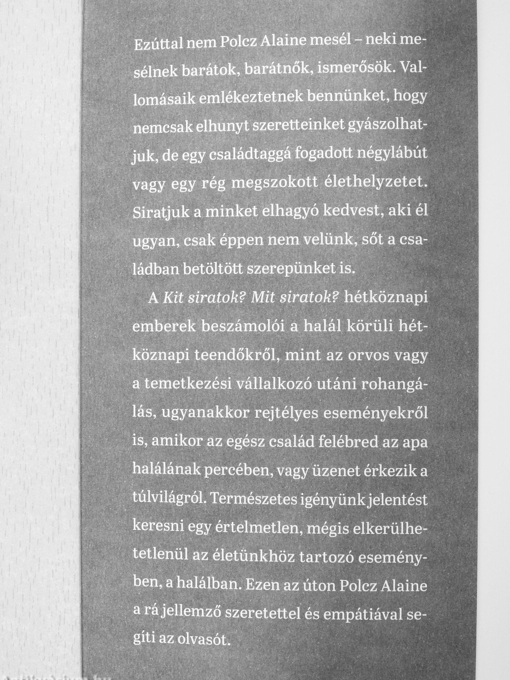 A Kit siratok? Mit siratok? hétköznapi emberek beszámolói a halál körüli hétköznapi teendőkről, mint az orvos vagy a temetkezési vállalkozó utáni rohangálás, ugyanakkor rejtélyes eseményekről is, amikor az egész család felébred az apa halálának percében, vagy üzenet érkezik a túlvilágról. Természetes igényünk jelentést keresni egy értelmetlen, mégis elkerülhetetlenül az életünkhöz tartozó eseményben, a halálban. Ezen az úton Polcz Alaine a rá jellemző szeretettel és empátiával segíti az olvasót.