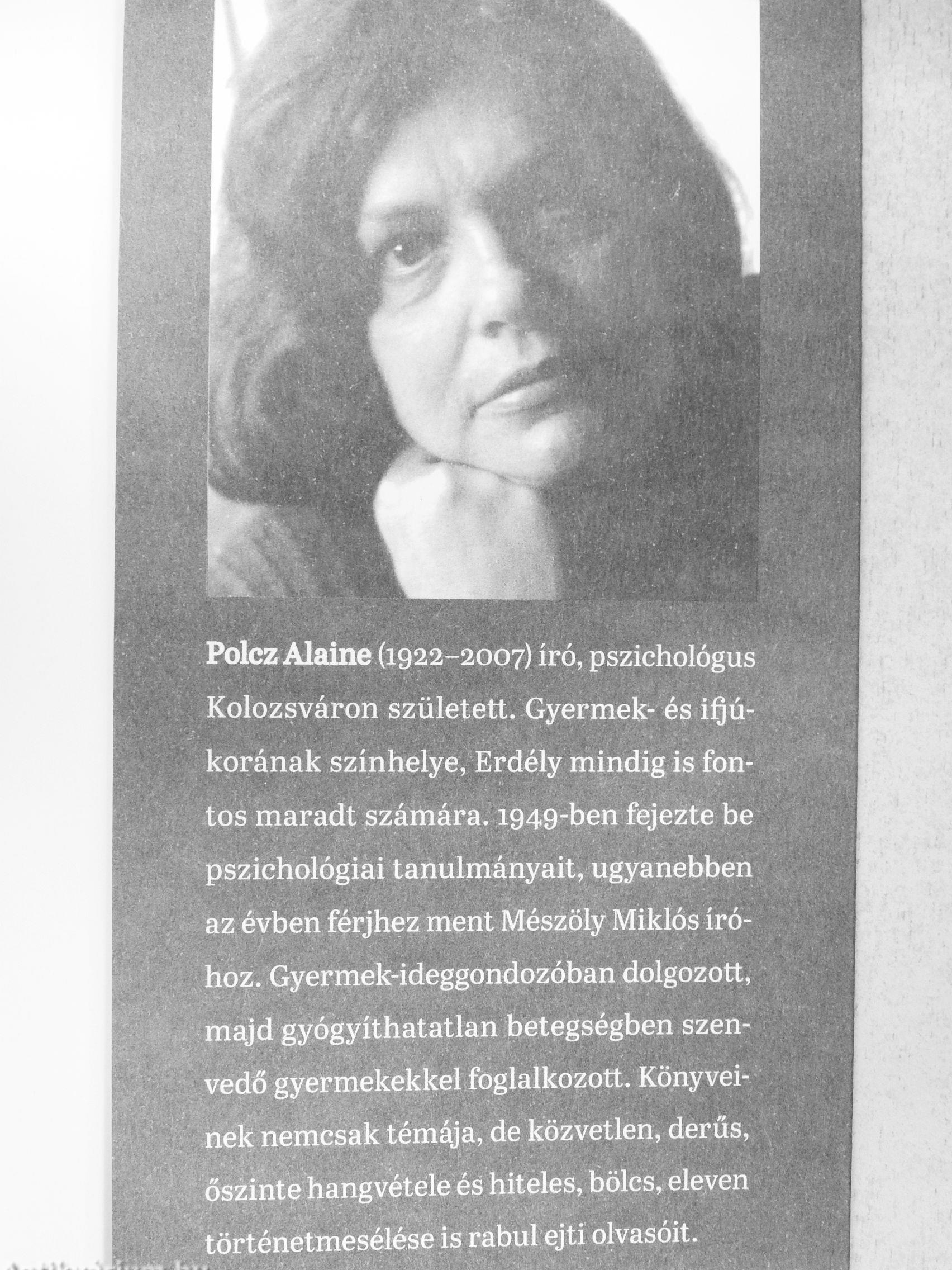 r PolczAlaine (1922-2007) író, pszichológus Kolozsváron született. Gyermek- és IQú-korának színhelye, Erdély mindig is fontos maradt számára. 1949-ben fejezte be pszichológiai tanulmányait, ugyanebben az évben férjhez ment Mészöly Miklós íróhoz. Gyermek-ideggondozóban dolgozott, majd gyógyíthatatlan betegségben szenvedő gyermekekkel foglalkozott. Könyveinek nemcsak témája, de közvetlen, derűs, őszinte hangvétele és hiteles, bölcs, eleven történetmesélése is rabul ejti olvasóit.