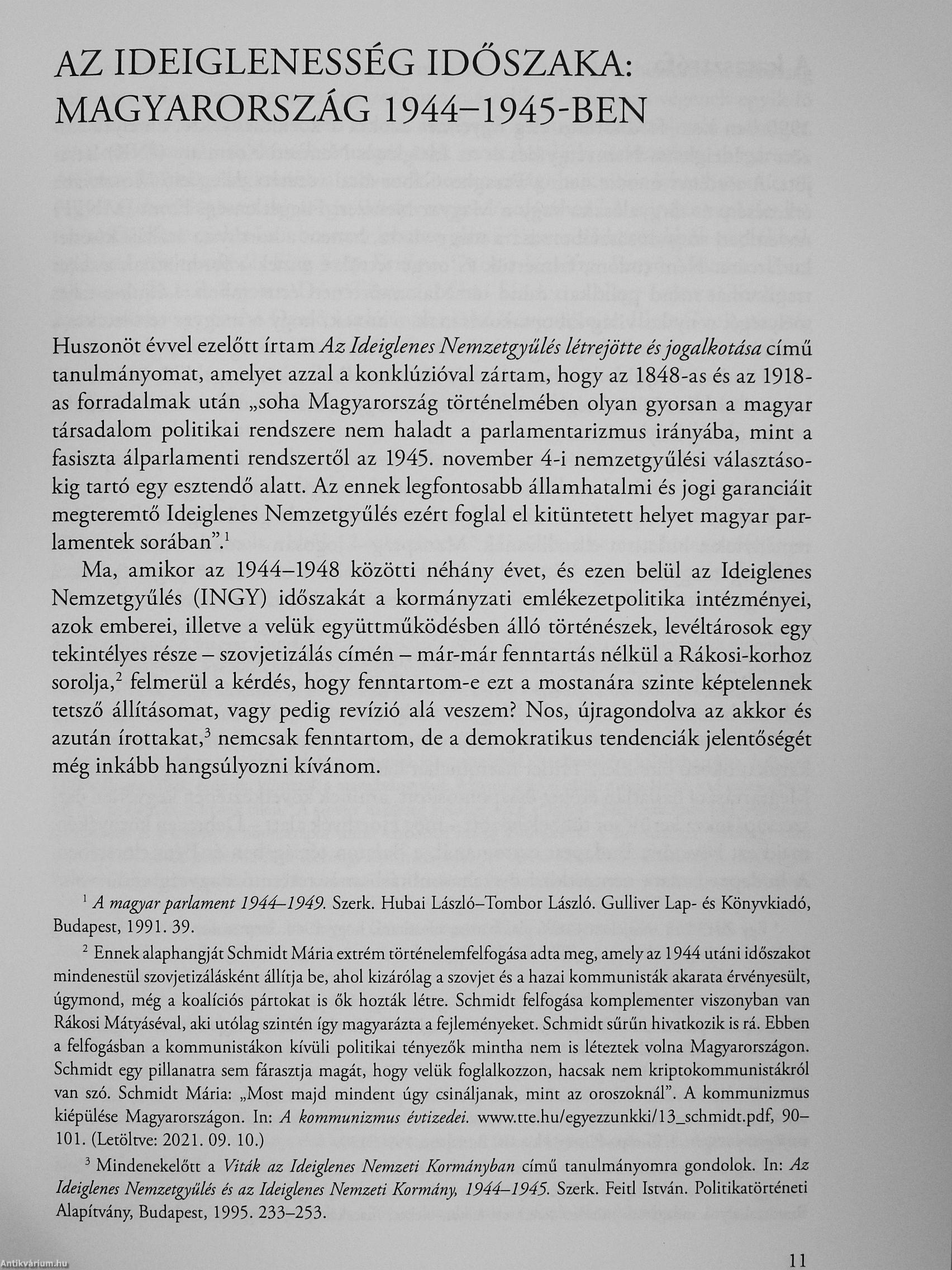 Az 1945 utáni magyar történelemmel foglalkozó tanulmányok új szempontokkal és érvekkel mutatják be a különbséget az 1944-1949 közötti többpárti parlamentarizmus és az ötvenes évek eleji proletárdiktatúra között, a Rákosi-és a Nagy Imre-kormány időszaka között, valamint a rákosista évek és a kádárizmus között. A szövegek részben a tucatszám sokasodó mainstream történetírással vitatkozó írások. Ez egészül ki Magyarország 20. századi nyitottsága kérdéseit taglaló anyagokkal, a nyelvhasználat és a politika kapcsolatát vizsgáló esettanulmánnyal, végül Rákosi Mátyás és Kádár János 1954 utáni konfliktustörténetét taglaló hosszabb, frissített kismonoqráfiával.