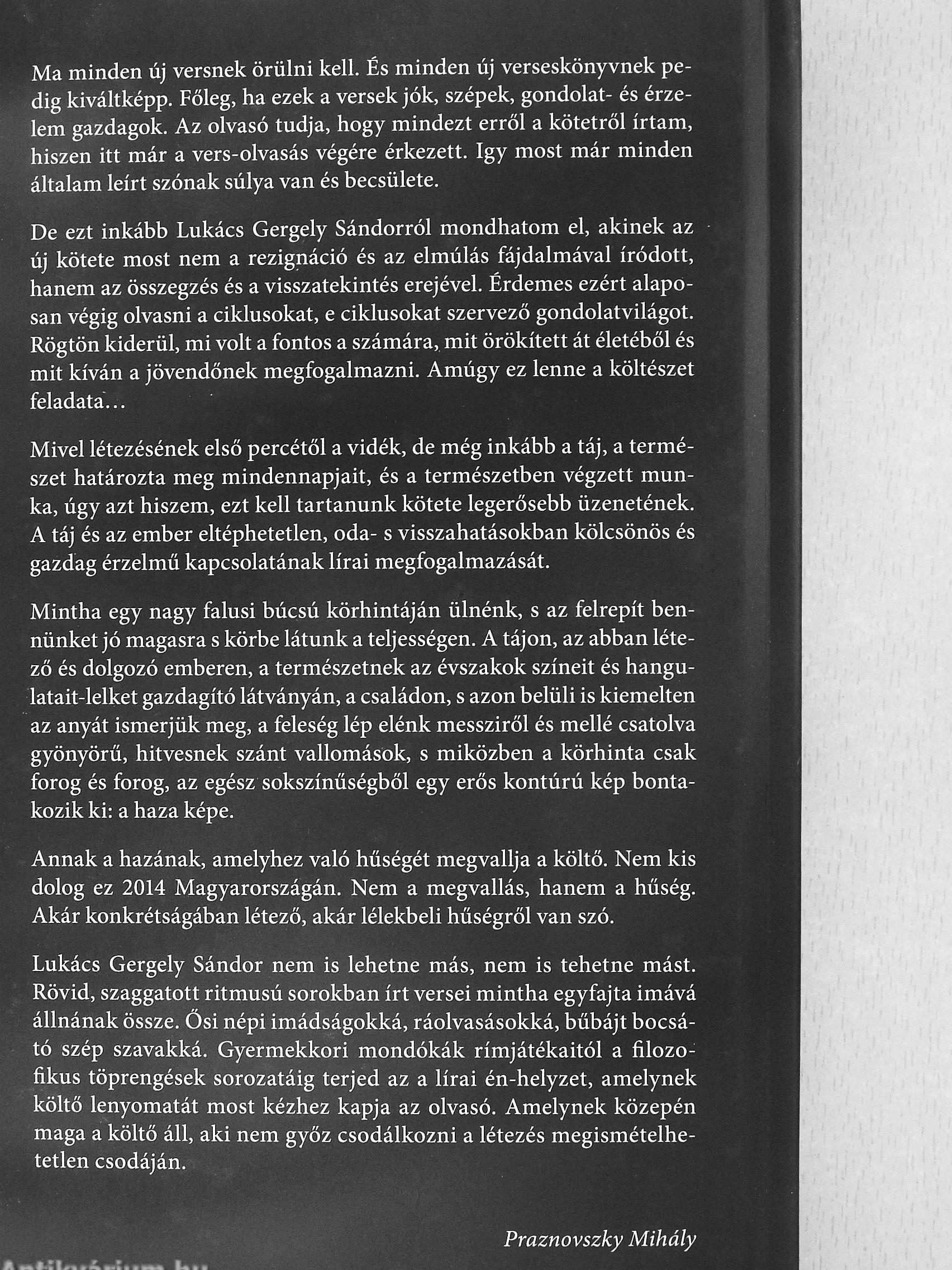 Lukács Gergely Sándor nem is lehetne más, nem is tehetne mást. Rövid, szaggatott ritmusú sorokban írt versei mintha egyfajta imává állnának össze. Ösi népi imádságokká, ráolvasásokká, bűbájt bocsátó szép szavakká. Gyermekkori mondókák rímjátékaitól a filozofikus töprengések sorozatáig terjed az a lírai én-helyzet, amelynek költő lenyomatát most kézhez kapja az olvasó. Amelynek közepén maga a költő áll, aki nem győz csodálkozni a létezés megismételhetetlen csodáján.
