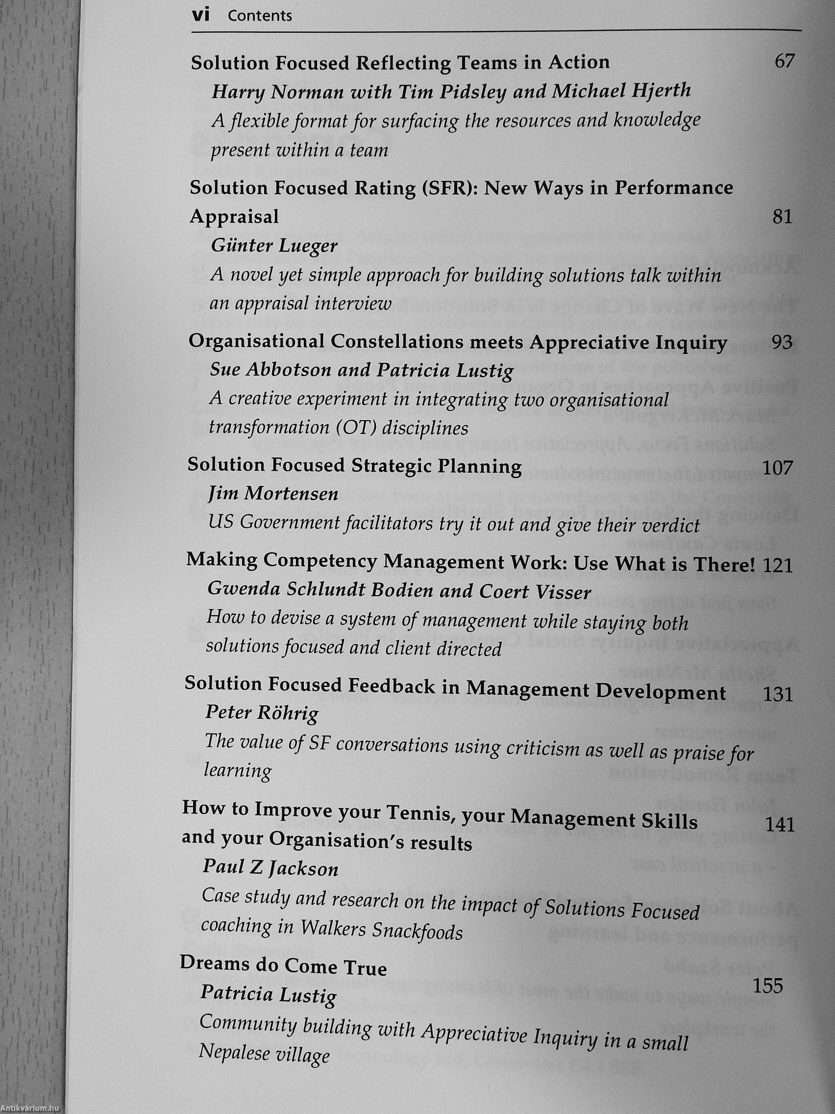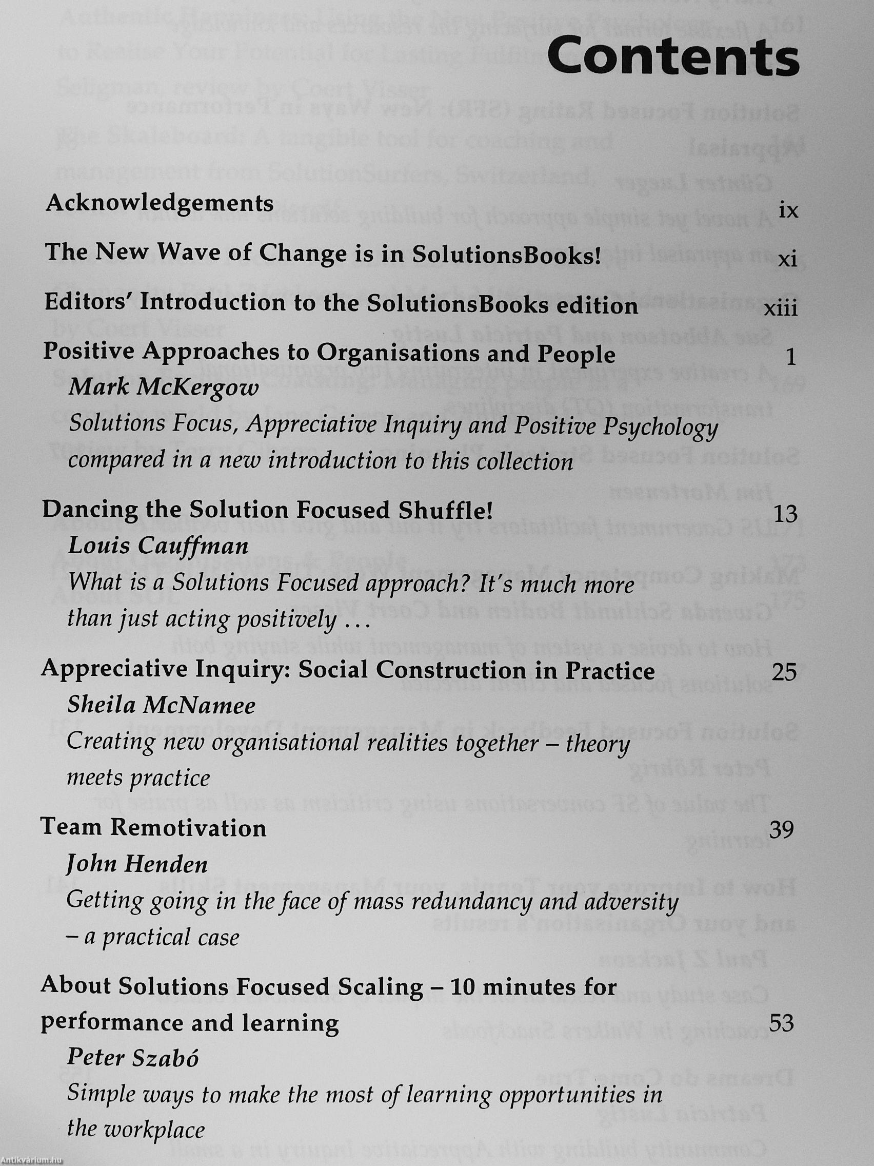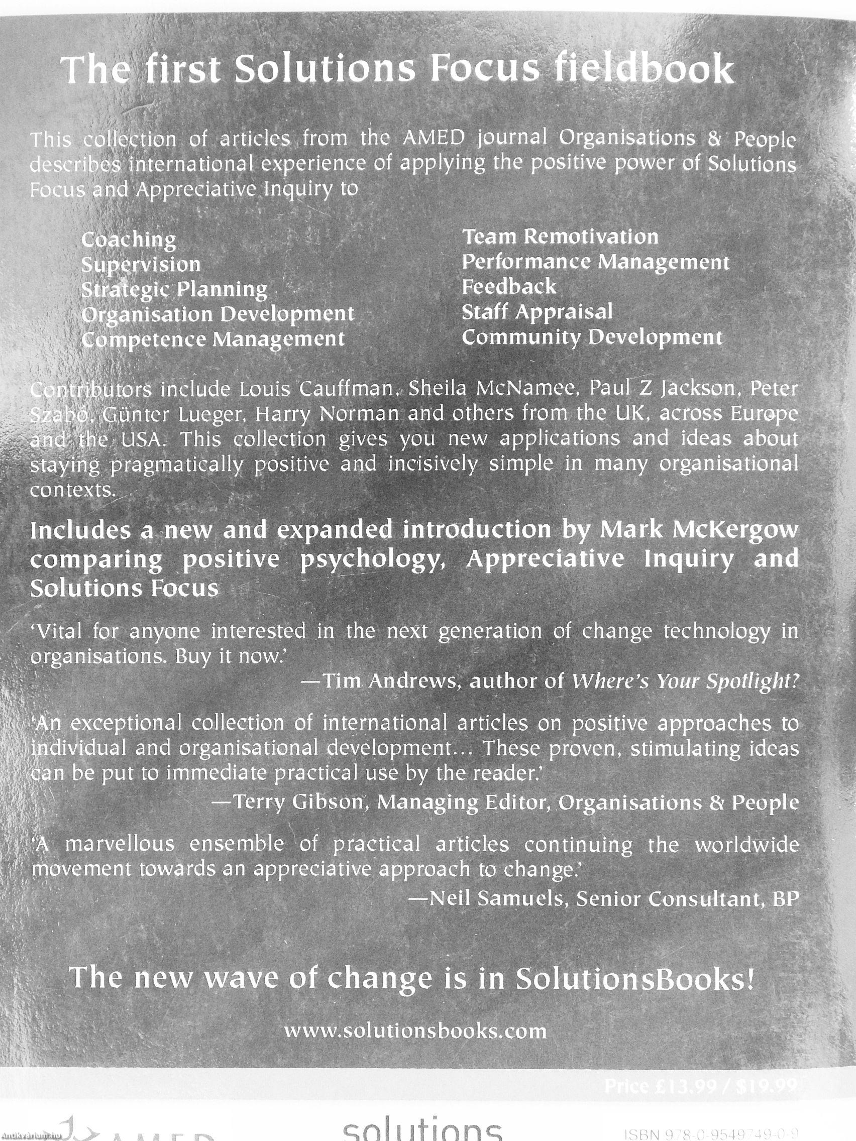 Tbis collection:of articles,from the AMED journal Organisations People describes international experience of applying the positive power of Solutions Fu(ats and Appreciative Inquiry to