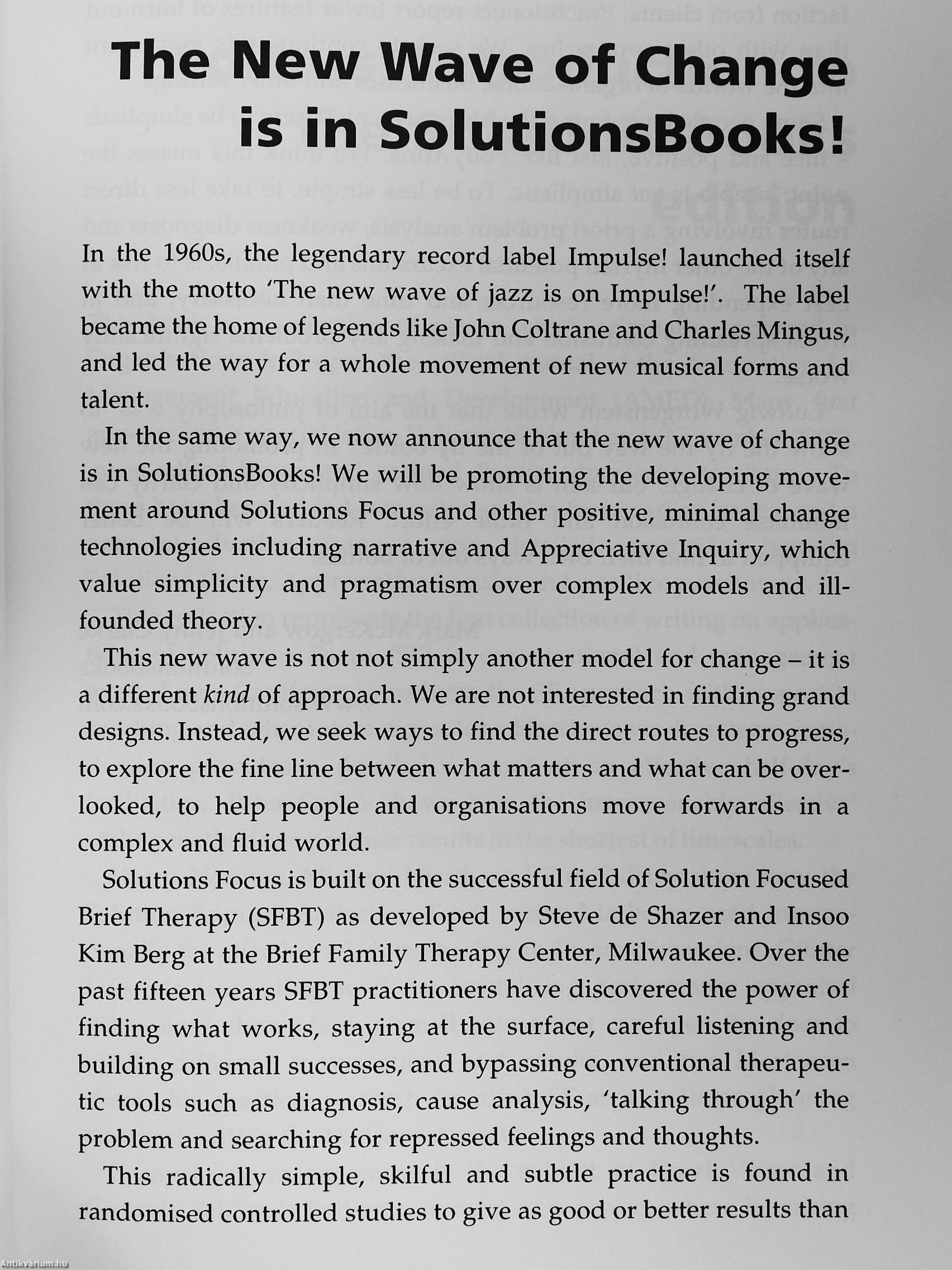 Includes a new and expanded introduction by Mark McKergow comparing positive psychology, Appreciative Inquiry and Solutions Focus ^