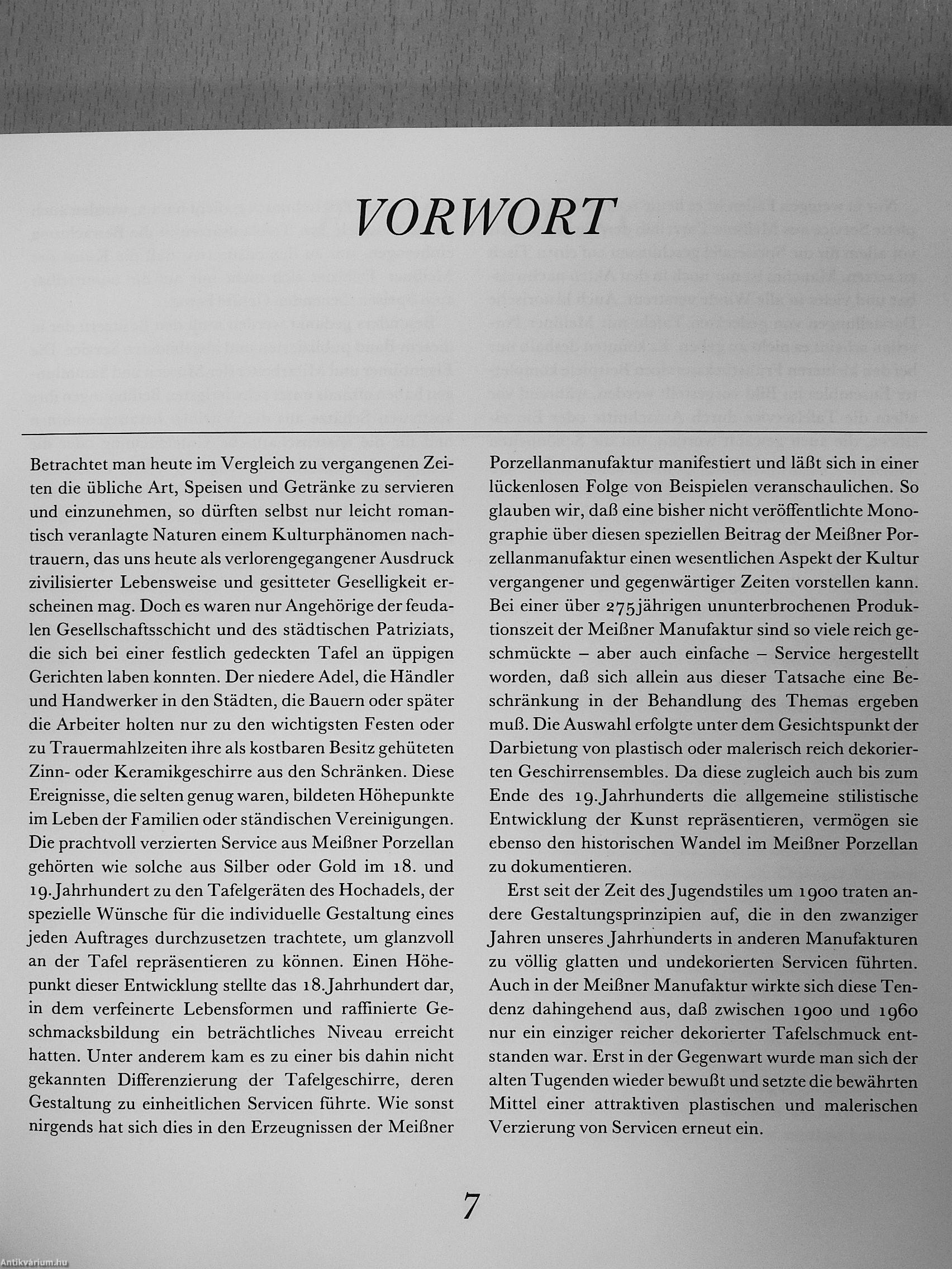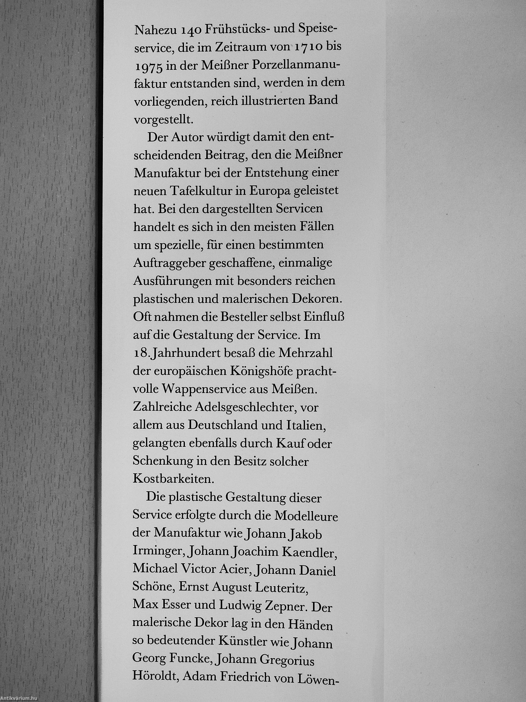 Der Autor würdigt damit den entscheidenden Beitrag, den die Meißner Manufaktur bei der Entstehung einer neuen Tafelkultur in Europa geleistet hat. Bei den dargestellten Servicen handelt es sich in den meisten Fällen um spezielle, für einen bestimmten Auftraggeber geschaffene, einmalige Ausführungen mit besonders reichen plastischen und malerischen Dekoren. Oft nahmen die Besteller selbst Einfluß auf die Gestaltung der Service. Im 1 S.Jahrhundert besaß die Mehrzahl der europäischen Königshöfe prachtvolle Wappenservice aus Meißen. Zahlreiche Adelsgeschlechter, vor allem aus Deutschland und Italien, gelangten ebenfalls durch Kauf oder Schenkung in den Besitz solcher Kostbarkeiten.