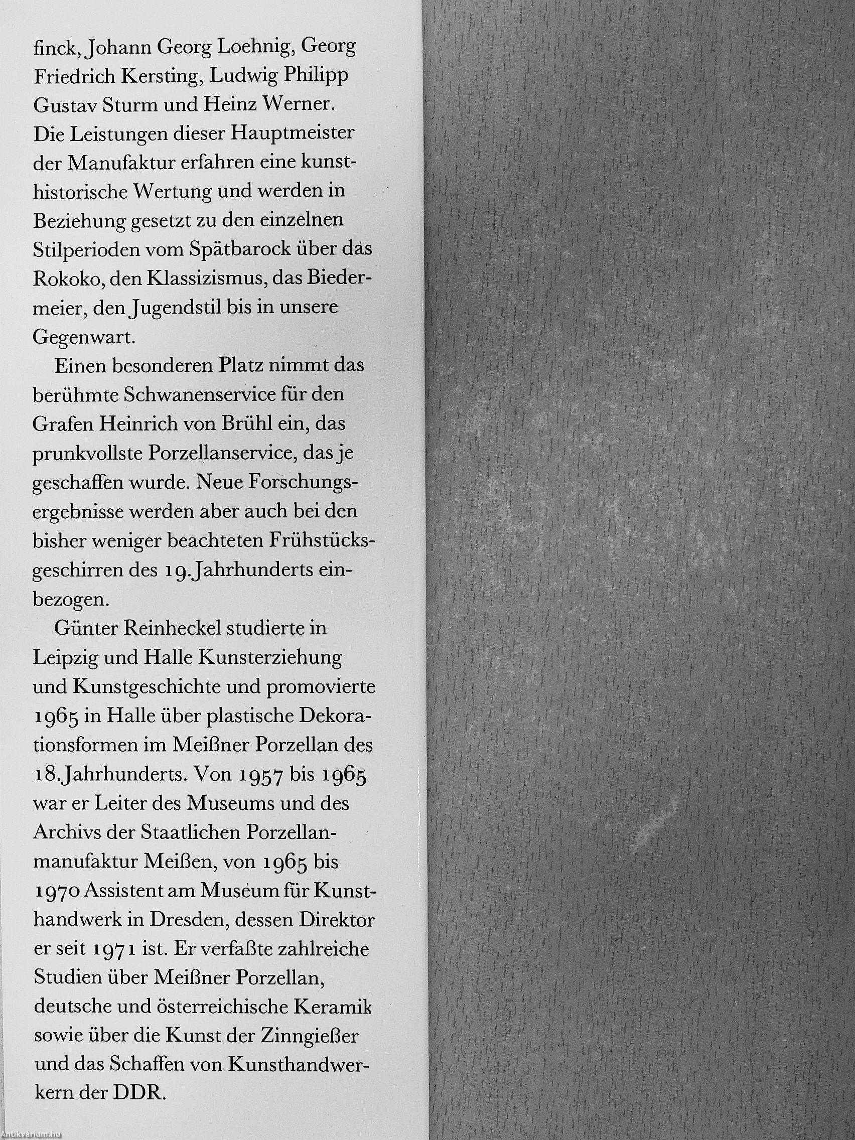 finck, Johann Georg Loehnig, Georg Friedrich Kersting, Ludwig Philipp Gustav Sturm und Heinz Werner. Die Leistungen dieser Hauptmeister der Manufaktur erfahren eine kunsthistorische Wertung und werden in Beziehung gesetzt zu den einzelnen Stilperioden vom Spätbarock über däs Rokoko, den Klassizismus, das Biedermeier, den Jugendstil bis in unsere Gegenwart.