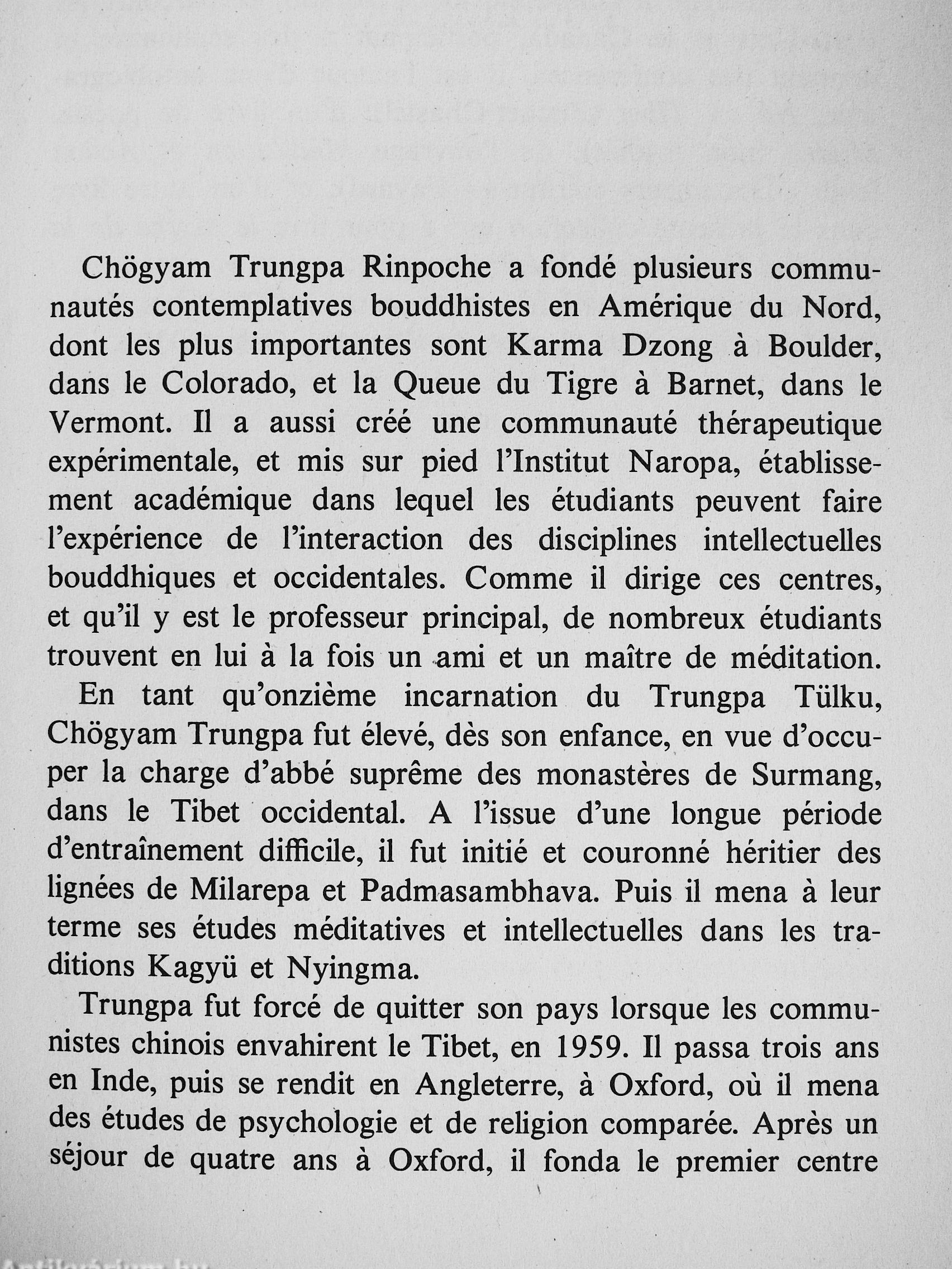 est une série de causeries données par Chôgyam Trungpa Rimpoché, la seule haute autorité spirituelle tibétaine a résider de façon permanente en Occident; il est considéré, dans le bouddhisme tibétain, comme la onzieme incarnation du Trungpa Tulku, A l'issue d'une éducation longue et difficile, il fut initié et couronné comme héritier des lignées de Milarépa et de Padmasambhava. Apres l'arrivée des troupes chinoises au Tibet, en 1959, il étudie trois ans en Inde et quatre ans a Oxford. Il fonde ensuite le premier centre bouddhiste tibétain d'étude et de méditation dans l'hémisphere occidental, a Samye-Ling, en Écosse, En 1970, Trungpa visite les États-Unis et décide d'y fixer sa résidence. Il enseigne a l'Université du Colorado.