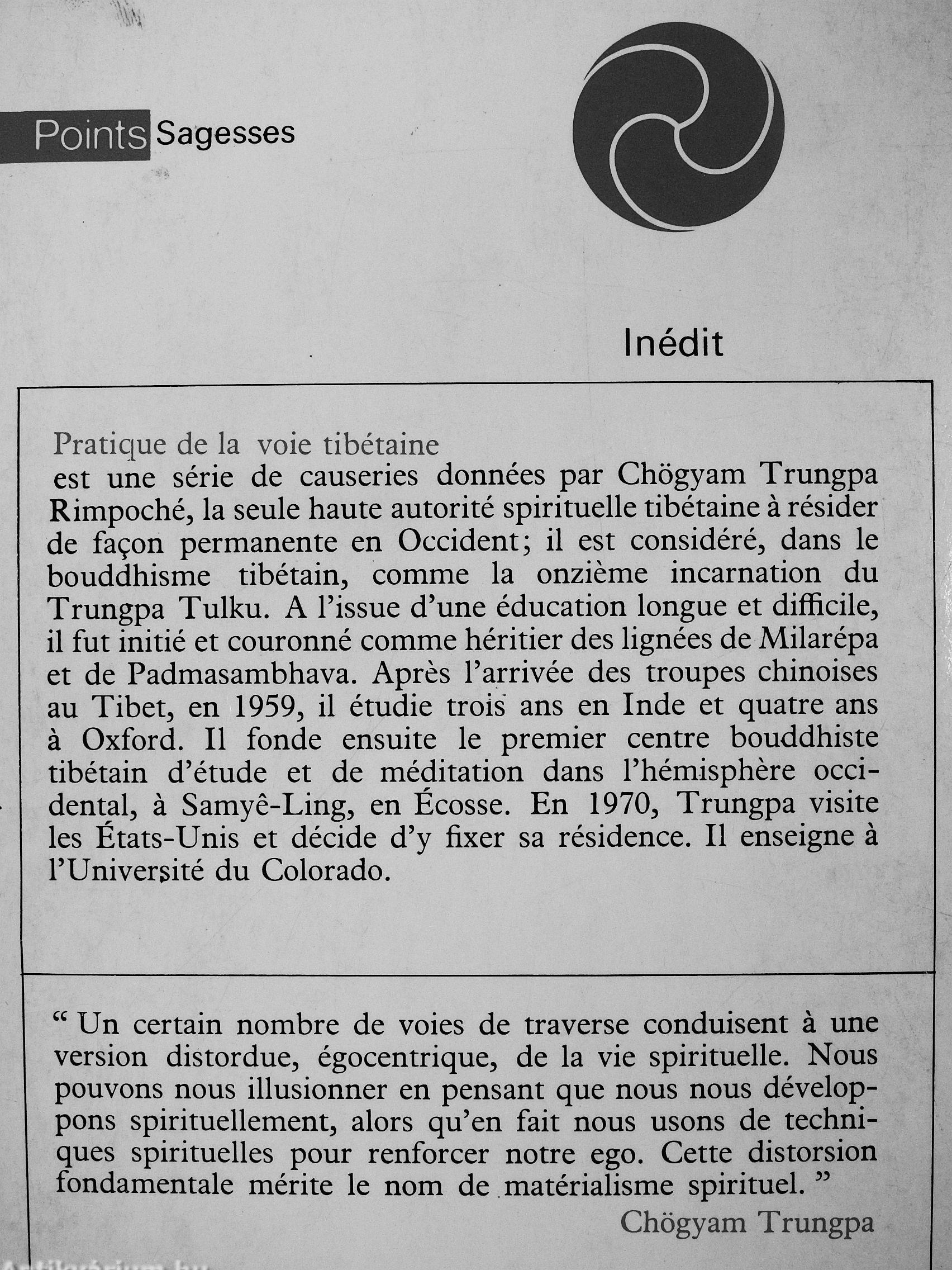" Un certain nombre de voies de traverse conduisent a une version distordue, égocentrique, de la vie spirituelle. Nous pouvons nous illusionner en pensant que nous nous développons spirituellement, alors qu'en fait nous usons de techniques spirituelles pour renforcer notre ego. Cette distorsion fondamentale mérite le nom de matérialisme spirituel."