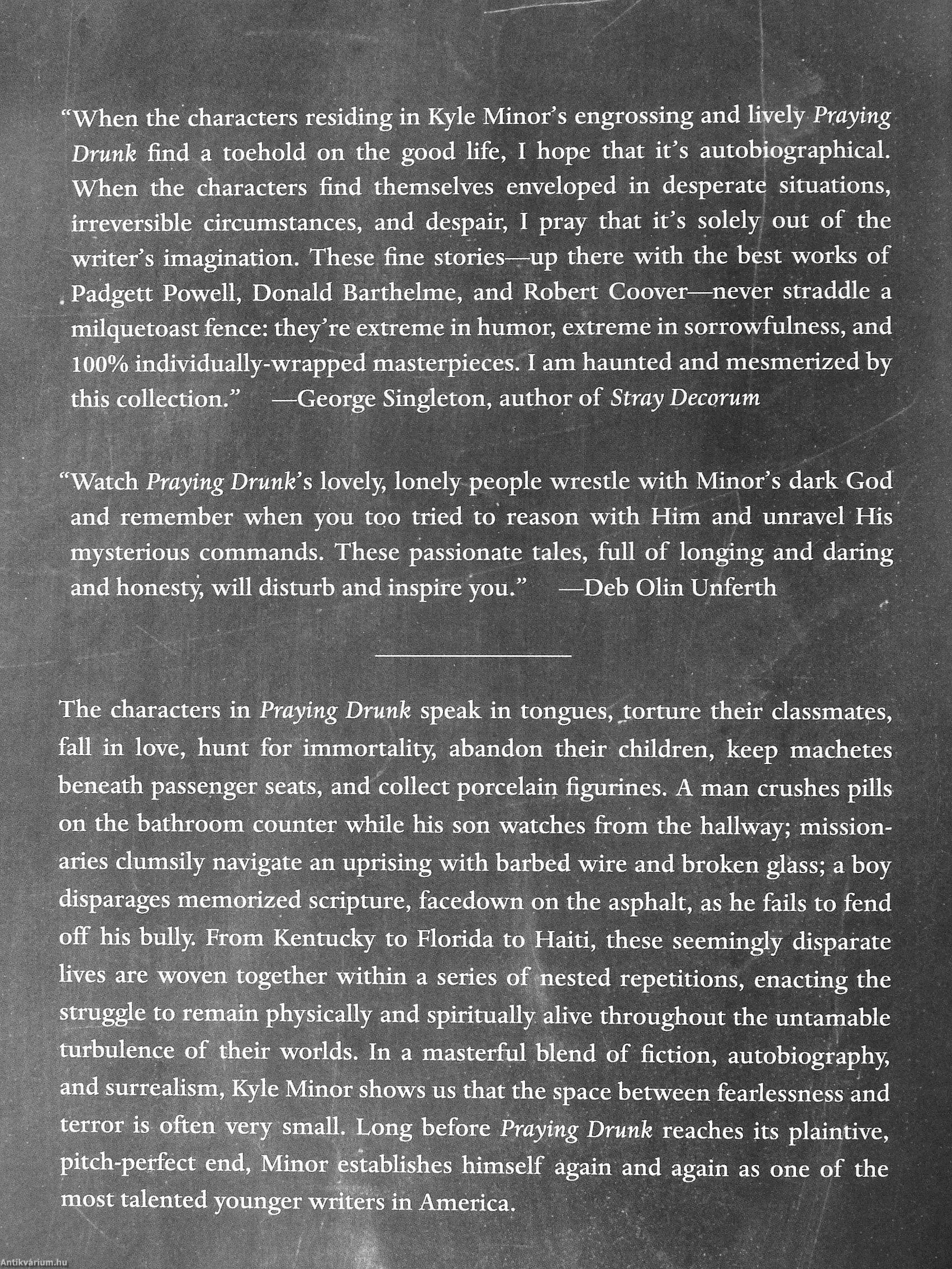 "When the characters residing in Kyle Minor's engrossing and Hvely Praying Drunk find a toehold on the good life, I hope that it's autobiographical, when the characters find themselves enveloped in desperate situations, irreversible circumstances, and despair, I pray that it's solely out of the writer's imagination. These fine stories—up there with the best works of , Padgett Powell, Donald Barthelme, and Robert Coover—never straddle a milquetoast fence: they're extreme in humor, extreme in sorrowfulness, and 100% individually-wrapped masterpieces. I am haunted and mesmerized by this collection." —George Singleton, author of Stray Decorum