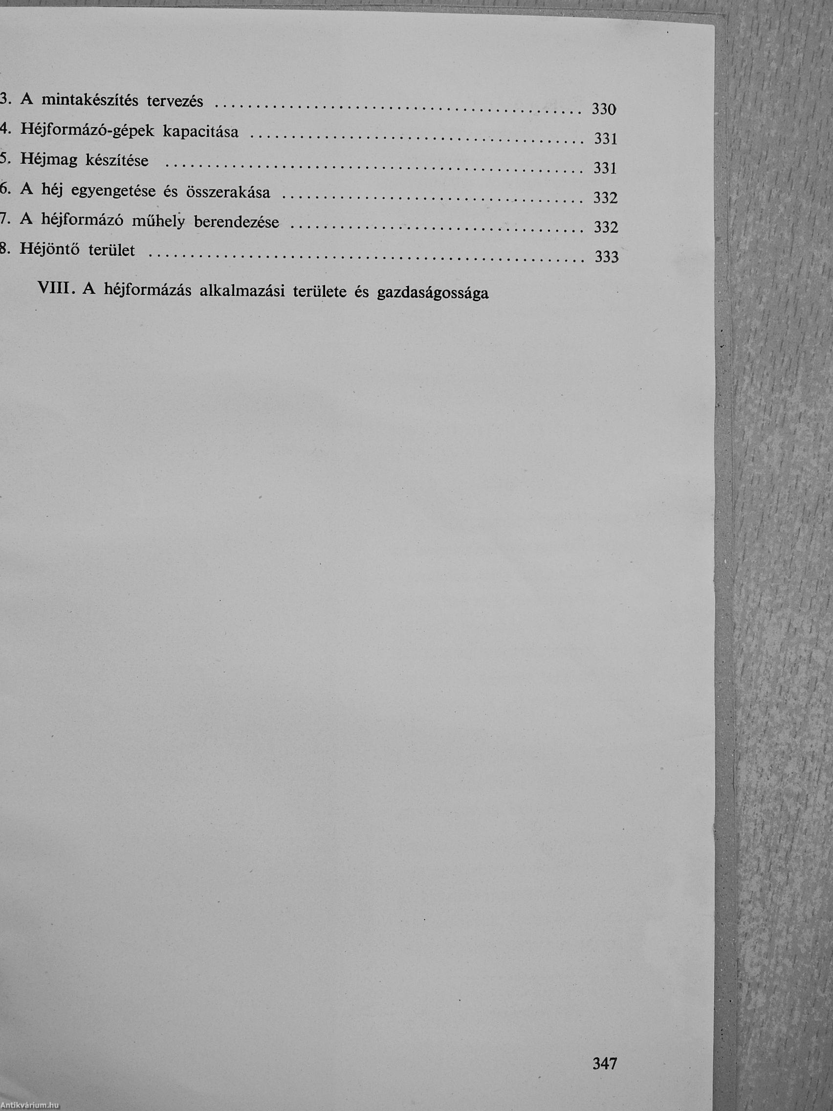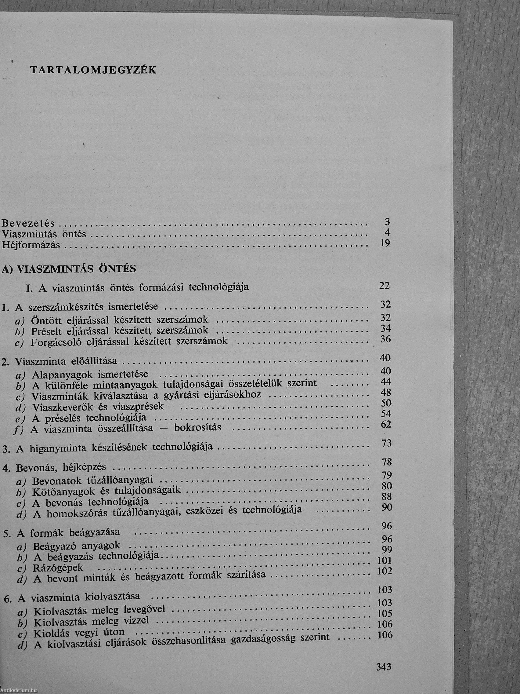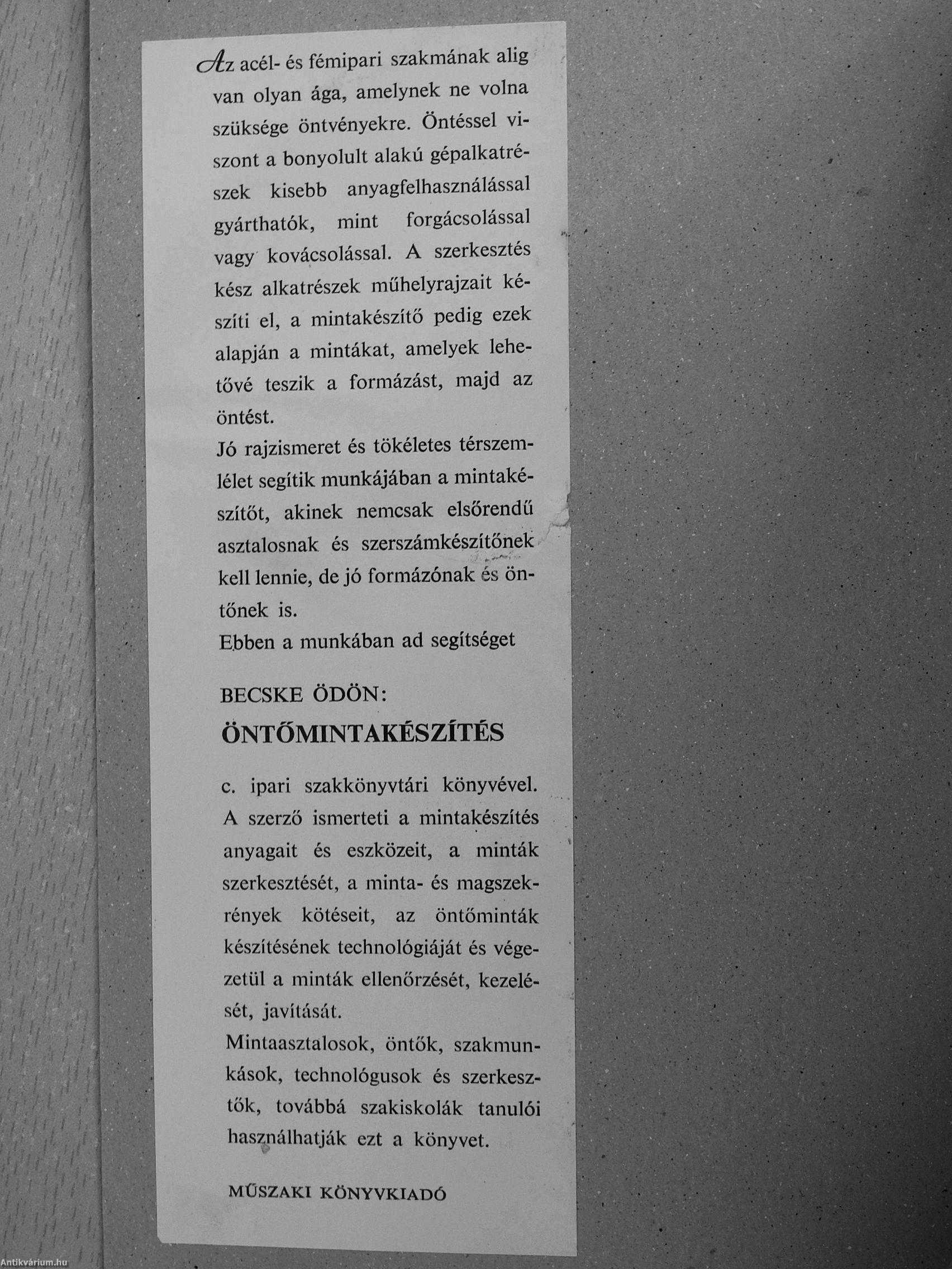 c. ipari szakkönyvtári könyvével. A szerző ismerteti a mintakészítés anyagait és eszközeit, a minták szerkesztését, a minta- és magszekrények kötéseit, az öntőminták készítésének technológiáját és végezetül a minták ellenőrzését, kezelé-•sét, javítását.