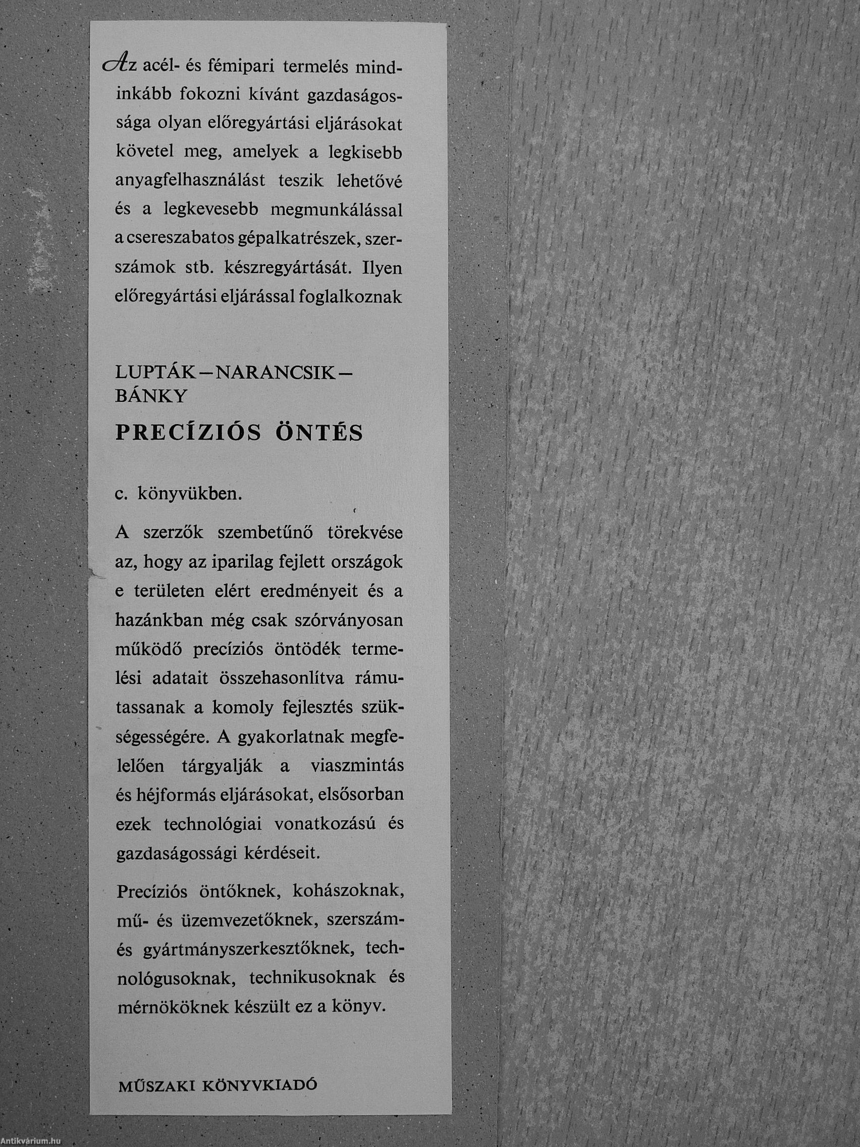 Precíziós öntőknek, kohászoknak, mű- és üzemvezetőknek, szerszám-és gyártmányszerkesztőknek, technológusoknak, technikusoknak és mérnököknek készült ez a könyv.