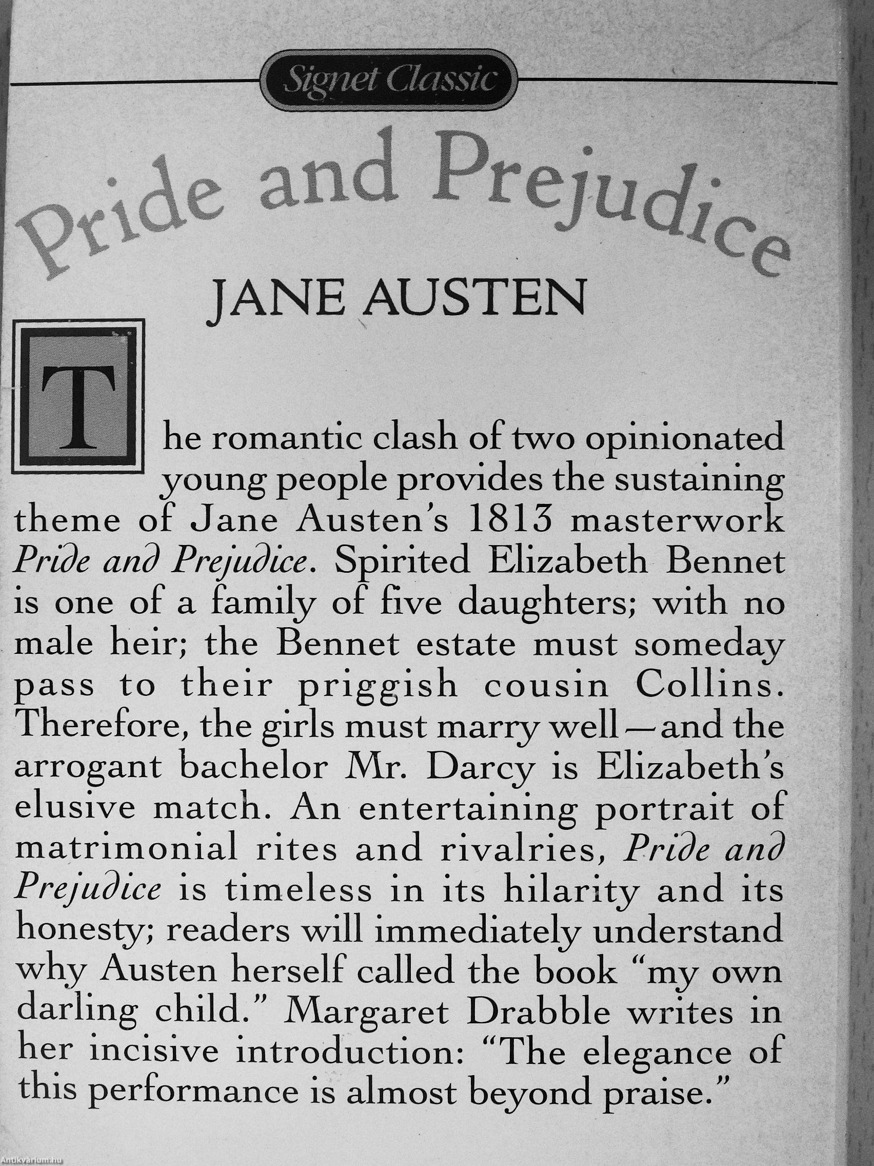he romantic clash of two opinionated young people provides the sustaining theme of Jane Austen's 1813 masterwork Fride and Prejudice. Spirited Elizabeth Bennet is one of a family of five daughters; with no male heir; the Bennet estate must someday pass to their priggish cousin Collins. Therefore, the girls must many well — and the arrogant bachelor Mr. Darcy is Elizabeth s elusive match. An entertaining portrait of matrimonial rites and rivalries, Pride and Prejudice is timeless in its hilarity and its honesty; readers will immediately understand why Austen herself called the book "my own darling child." Margaret Drabble writes in her incisive introduction: "The elegance of this performance is almost beyond praise."