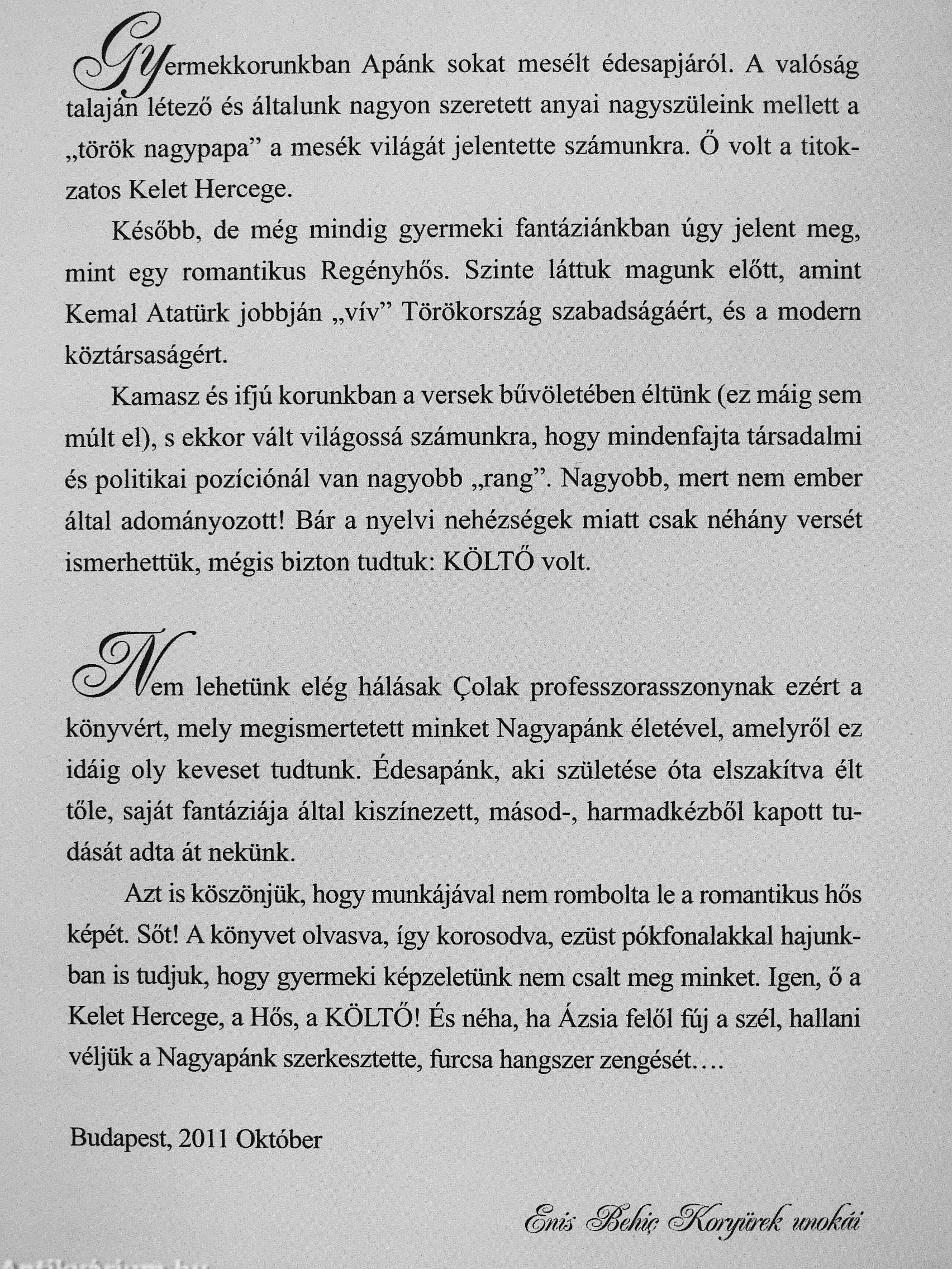Azt is köszönjük, hogy munkájával nem rombolta le a romantikus hős képét. Sőt! A könyvet olvasva, így korosodva, ezüst pókfonalakkal hajunkban is tudjuk, hogy gyermeki képzeletünk nem csalt meg minket. Igen, ő a Kelet Hercege, a Hős, a KÖLTŐ! És néha, ha Ázsia felől fúj a szél, hallani véljük a Nagyapánk szerkesztette, furcsa hangszer zengését