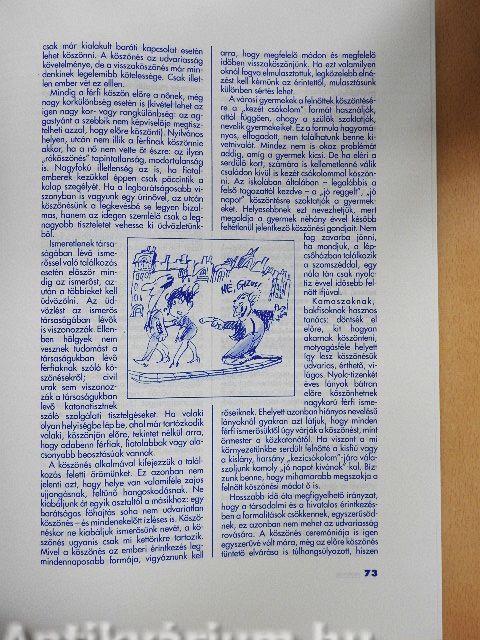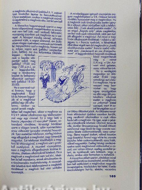 | Alkohol, ápoltság, asztalfoglalás, asztaltársaságban, autóban, ásítás, baráti körben, bálok, bocsánatkérés, borkóstoló, botrányok kezelése, búcsúzás, credo (céghűség), csók, díszebéd, divat, dohányzás, előreengedés, evőeszköz-használat, éjjeli zene, étkezés étteremben, felszolgálás, a vendégek elhelyezése, az italárlap, a felszolgáló felszerelése, a rendelés felvétele, a sörök felszolgálása, a borok felszolgálása, egyéb italok felszolgálása, általános felszolgálási szabályok, az elhasznált edények leszedése, a felszolgáló feladata az eltávozott vendég után, fénykép, fizetés, fogak ápoltsága, gyümölcsevés, hajviselet, hallgatás, hangverseny, házimulatságban, idegenforgalom, illedelmesség, illetlenség, jelmezbál, kalap, kesztyűviselet, képeslapok, kéz- és körömápolás, kirándulás, koktélparti, kölcsön, környezetvédelem és viselkedés, közlekedés, kutya, lakáskultúra, lazítás, lábápolás, látogatás, levelezés hivatalból, magánélet, make up, munkahely, munkahelyi villongások, művészet, műkedvelés, nevelés, nyaralás, nyelvismeret, nyilvános helyiségek, olvasmány, orvosi etikett, otthon, paróka, pénz, pletyka, pohárköszöntő, rágógumi, rákiáltás, rend, részegség, részvétnyilvánítás, ruhatárban, ruházkodás, sértés, sport, strandon, szállodában, személyzet, szenvedélyek, szerencsejáték, színházban, szórakozás, szurkolás, születés, szülők, tánciskola, táncos szórakozóhelyen, táska, tekintélytisztelet, telefonkonferencia, televíziózás, testápolás, titkárnő, toalett, tökmag, tudás (műveltség), tukmálás, utcán, ügyfelek és vevők, üzleti étkezések, vadászat, vakarózás, vendégségben, vendégkönyv, vezetés, viccmesélés, VIP-vendég, viselkedés, vita | |