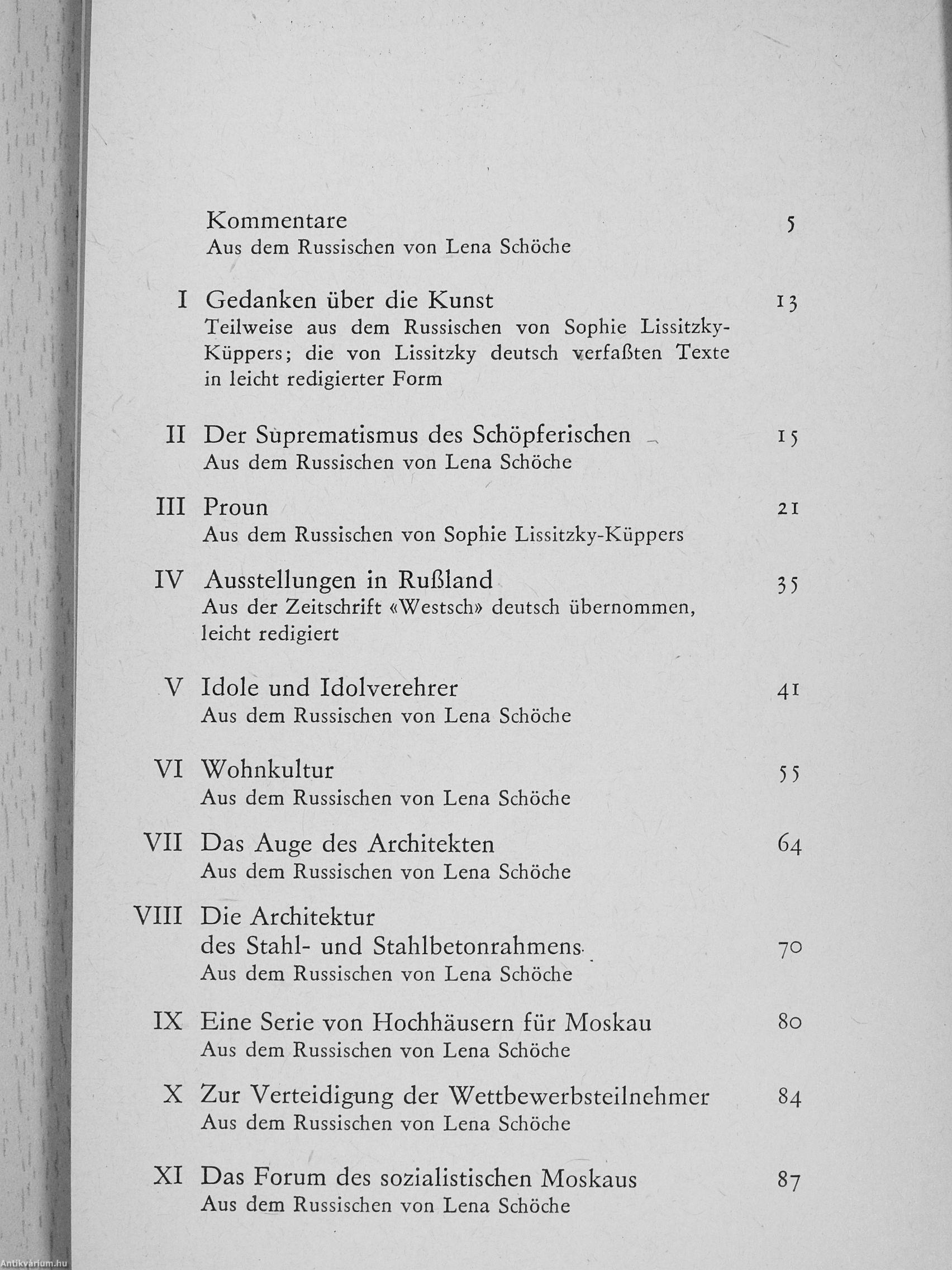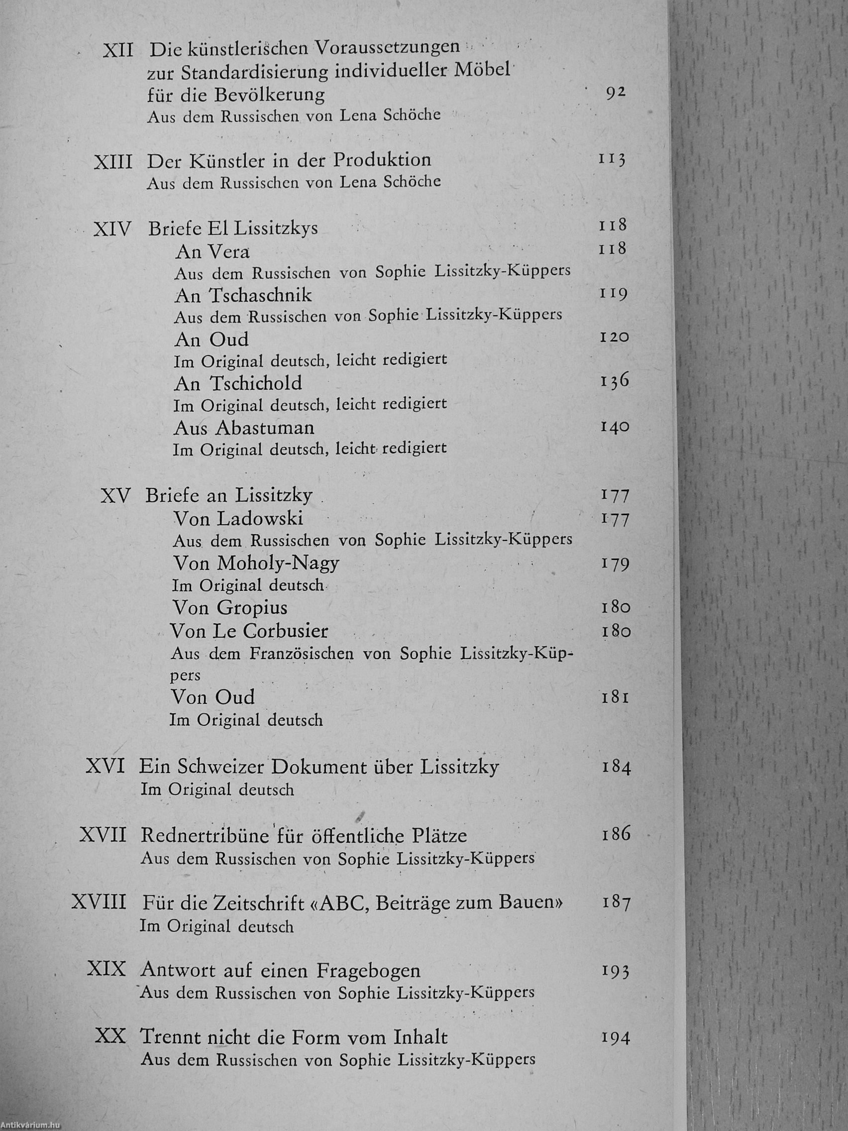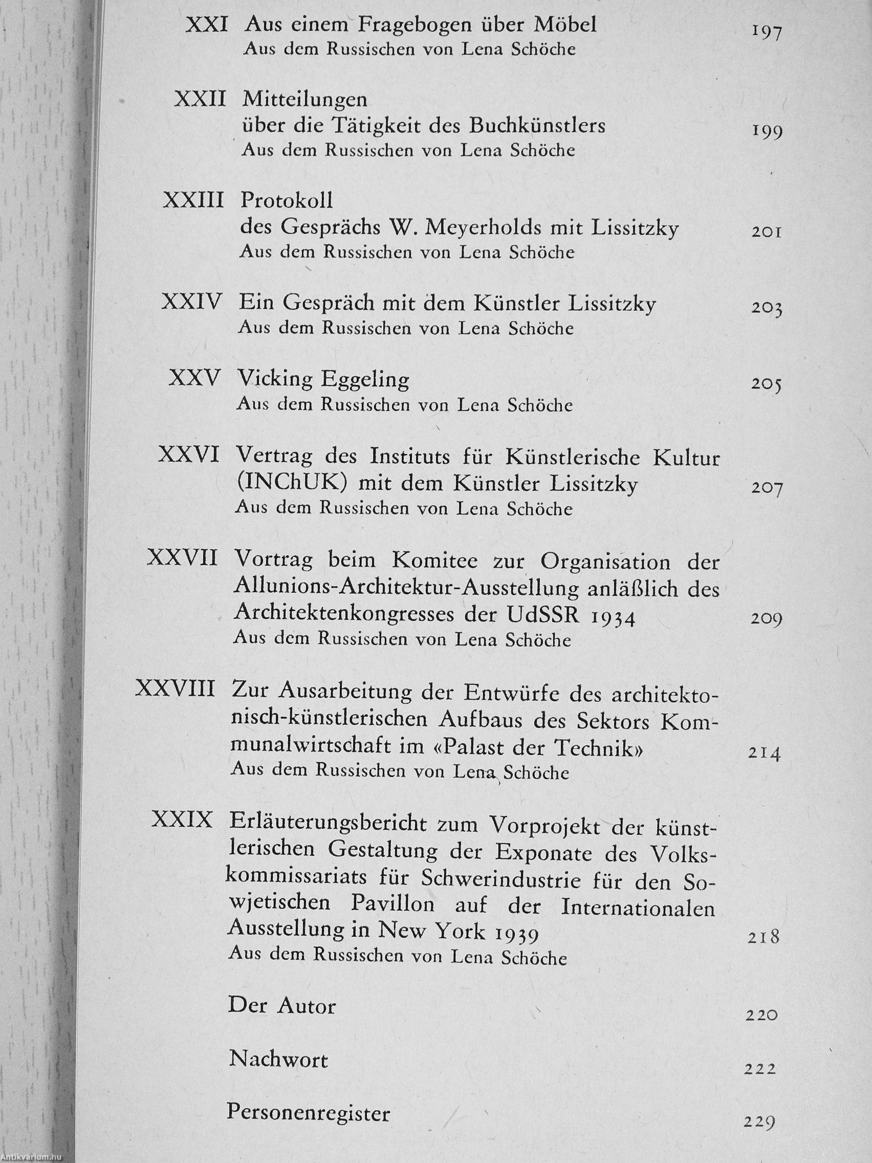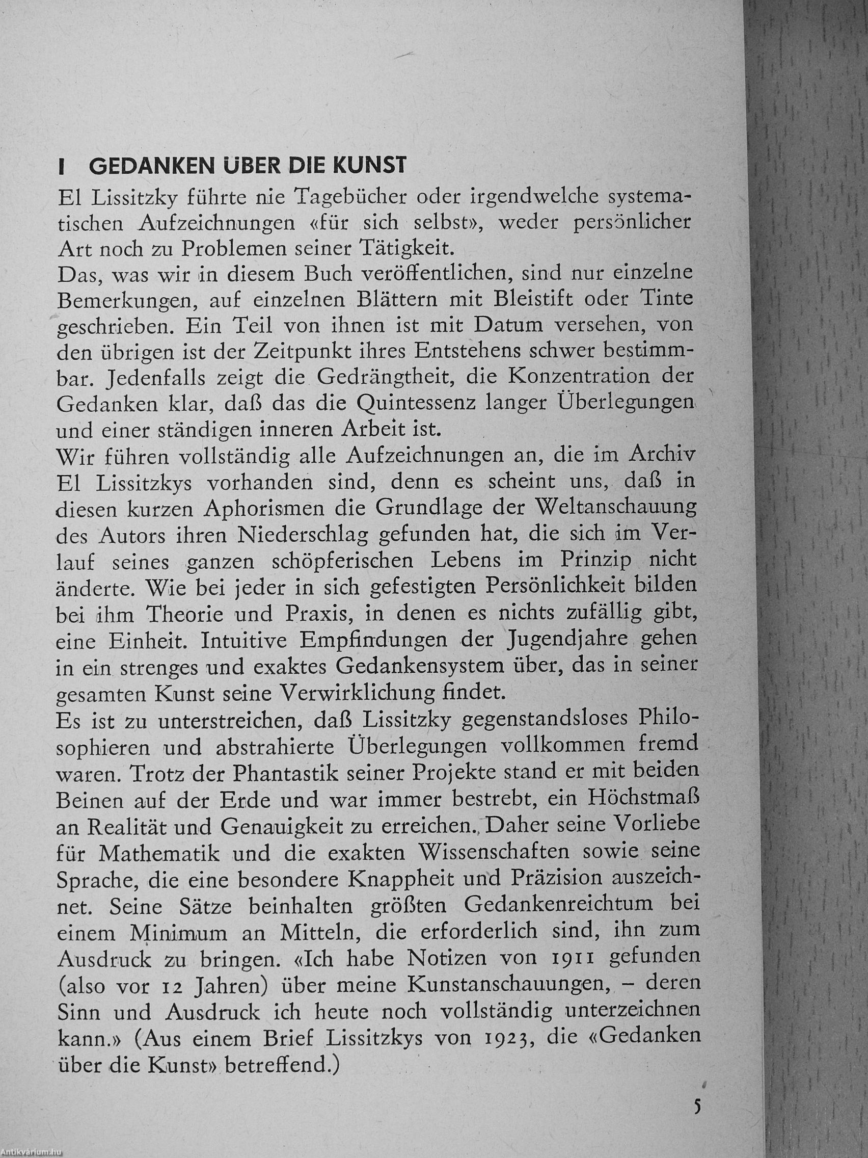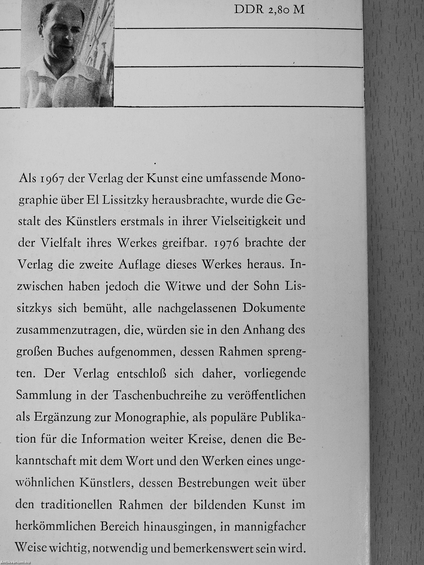 Als 1967 der Verlag der Kunst eine umfassende Monographie über El Lissitzky herausbrachte, wurde die Gestalt des Künstlers erstmals in ihrer Vielseitigkeit und der Vielfalt ihres Werkes greifbar. 1976 brachte der Verlag die zweite Auflage dieses Werkes heraus. Inzwischen haben jedoch die Witwe und der Sohn Lis-sitzkys sich bemüht, alle nachgelassenen Dokumente zusammenzutragen, die, würden sie in den Anhang des großen Buches aufgenommen, dessen Rahmen sprengten. Der Verlag entschloß sich daher, vorliegende Sammlung in der Taschenbuchreihe zu veröffentlichen als Ergänzung zur Monographie, als populäre Publikation für die Information weiter Kreise, denen die Bekanntschaft mit dem Wort und den Werken eines ungewöhnlichen Künstlers, dessen Bestrebungen weit über den traditionellen Rahmen der bildenden Kunst im herkömmlichen Bereich hinausgingen, in mannigfacher Weise wichtig, notwendig und bemerkenswert sein wird.