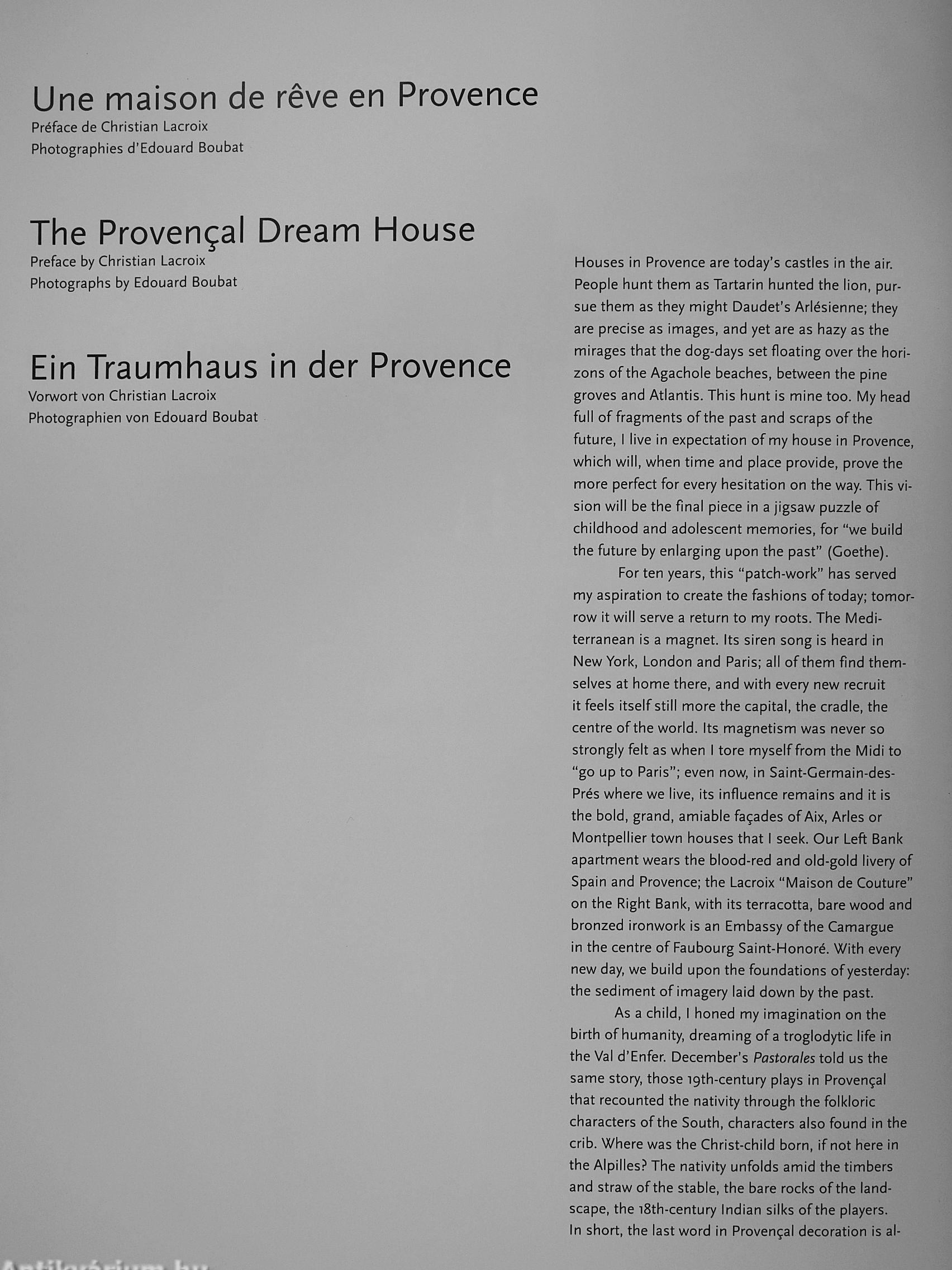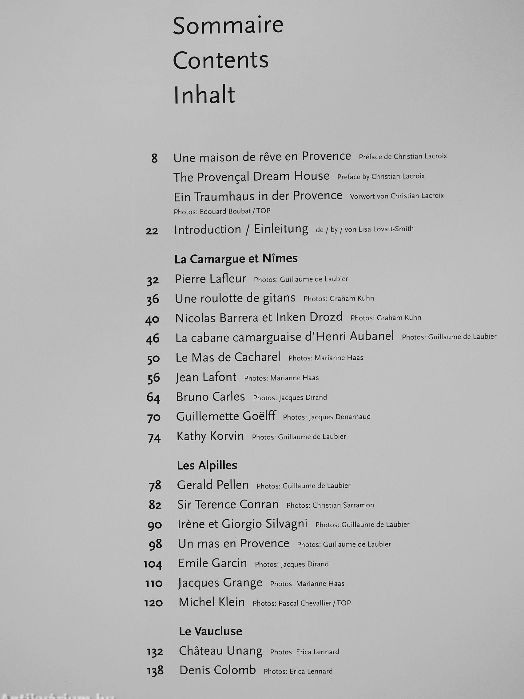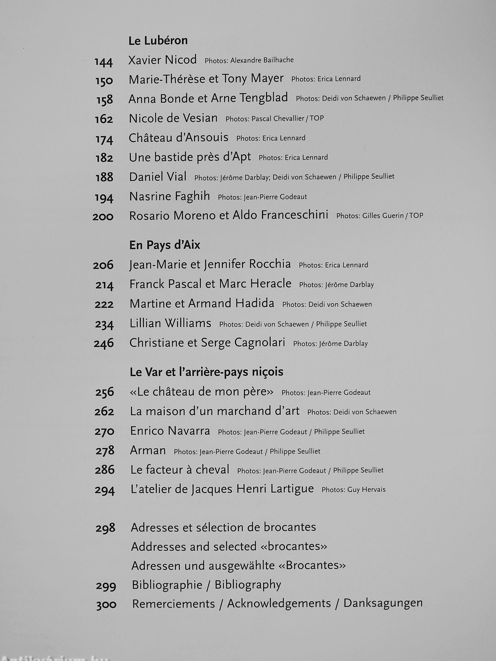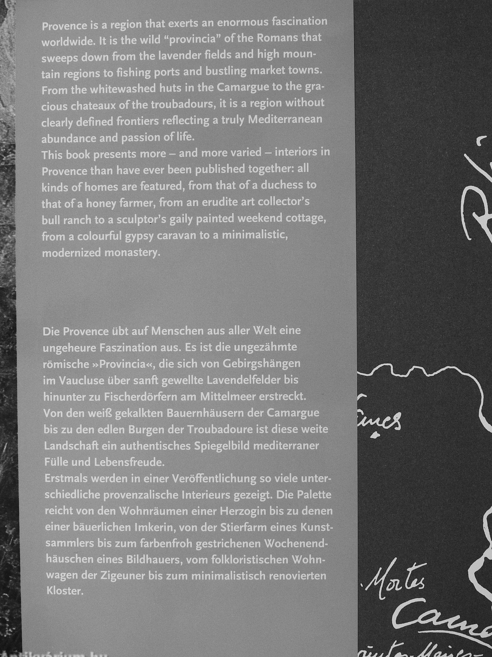Erstmals werden in einer Veröffentlichung so viele unterschiedliche provenzalische Interieurs gezeigt. Die Palette reicht von den Wohnräumen einer Herzogin bis zu denen einer bäuerlichen Imkerin, von der Stierfarm eines Kunstsammlers bis zum farbenfroh gestrichenen Wochenendhäuschen eines Bildhauers, vom folkloristischen Wohnwagen der Zigeuner bis zum minimalistisch renovierten Kloster.
