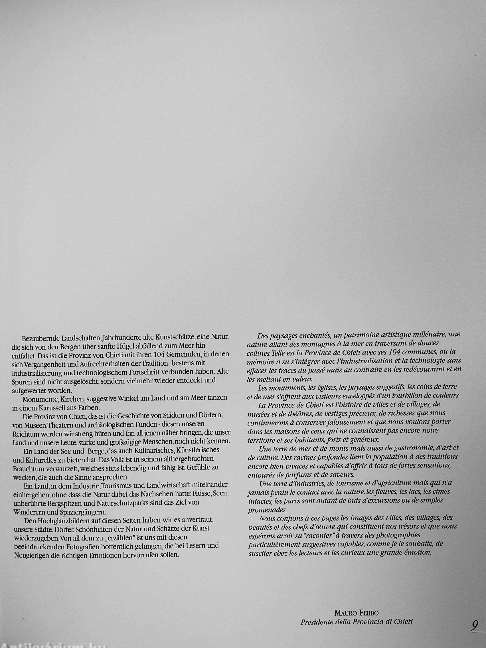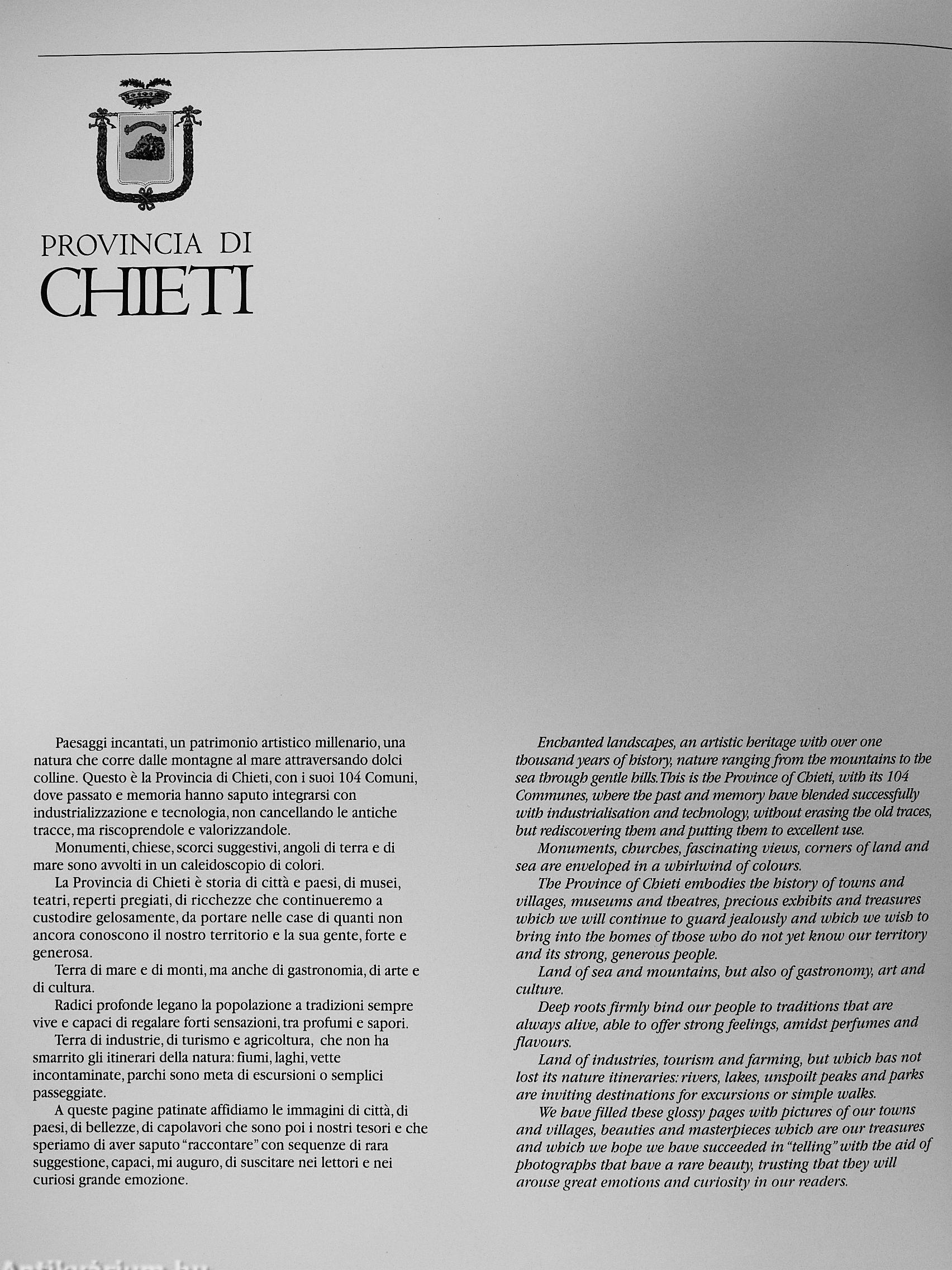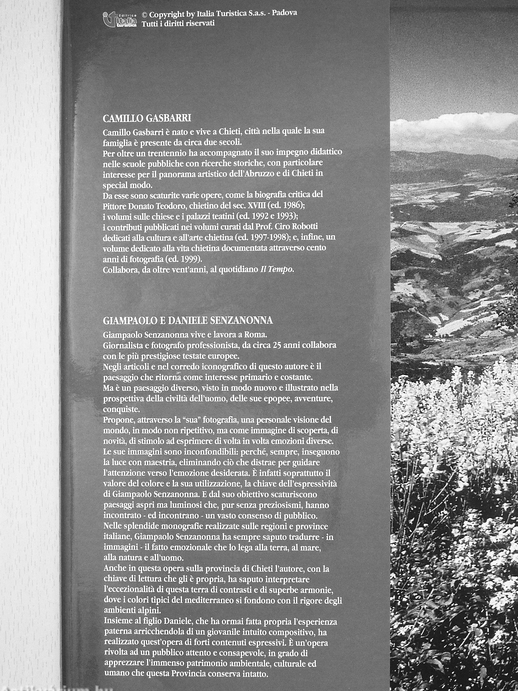 Anche in questa opera sulla provincia di Chieti l'autore, con la chiave di lettura che gli é propria, ha saputo interpretare l'eccezlonalita di questa terra di contrasti e di superbe armonie, dove i colori tipici del mediterráneo si fondono con 11 rigore degli ambienti alpini.