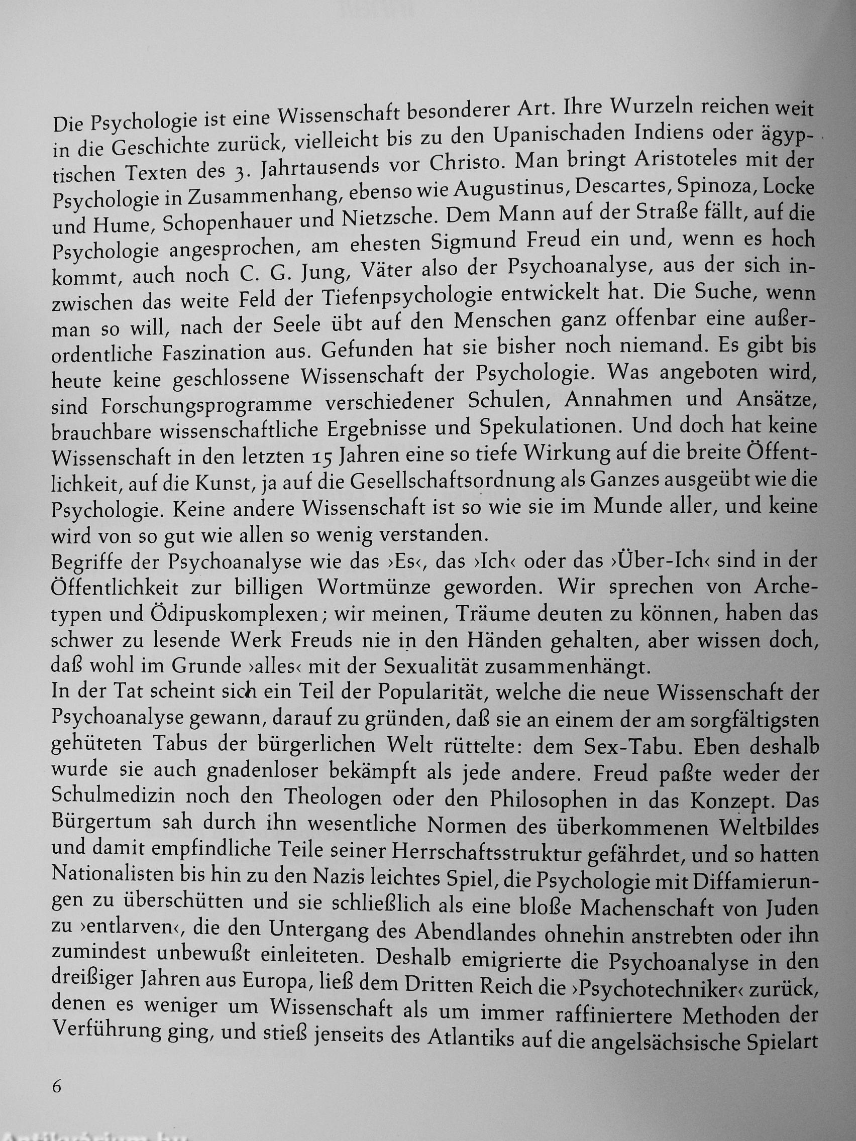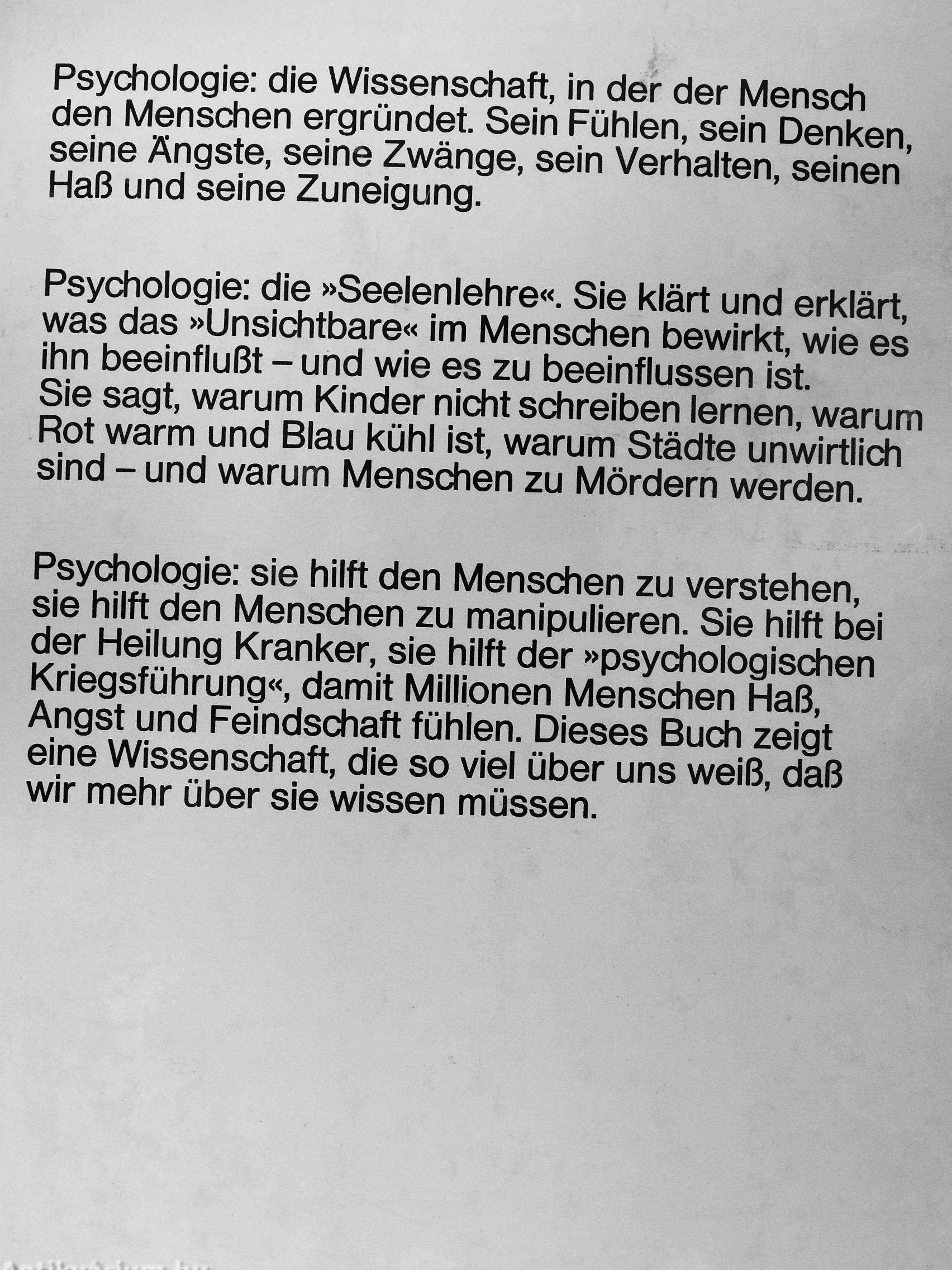 Psychologie: die Wissenschaft, in der der IVIensch den Menschen ergründet. Sein Fühlen, sein Denken, seine Ängste, seine Zwänge, sein Verhalten, seinen Haß und seine Zuneigung.