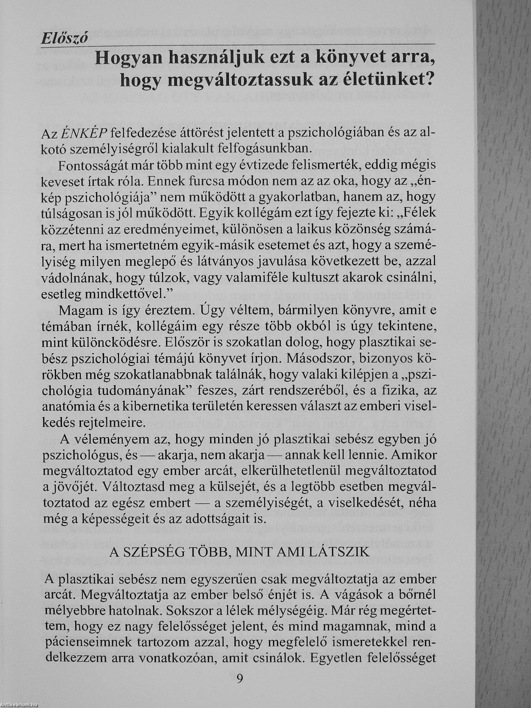 Maxwell Maltz több nyelvre lefordított klasszikus műve - magyarul először. A híres plasztikai sebész figyelemre méltó felfedezése segít, hogy legyőzzük kishitűségünket, megőrizzük szellemi és érzelmi függetlenségünket, alkotó megoldásokat találjunk problémáinkra és „szokásunkká" tegyük a boldogságot.