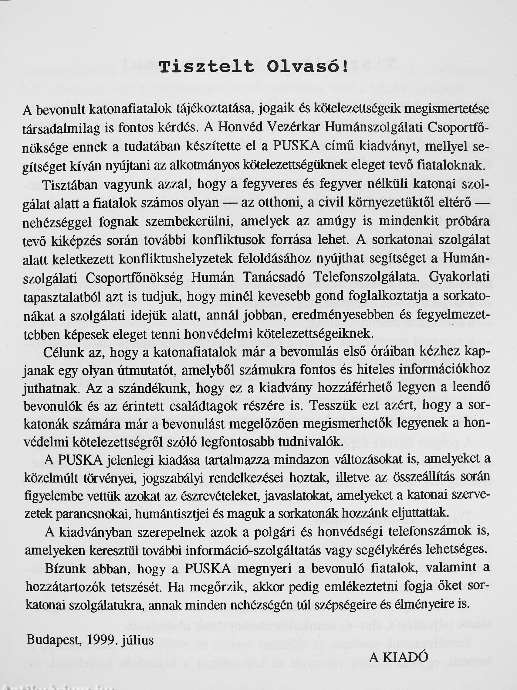 | Kiadó: | Honvéd Vezérkar Humán Főcsoportfőnökség Humánszolgálati Csoportfőnökség |