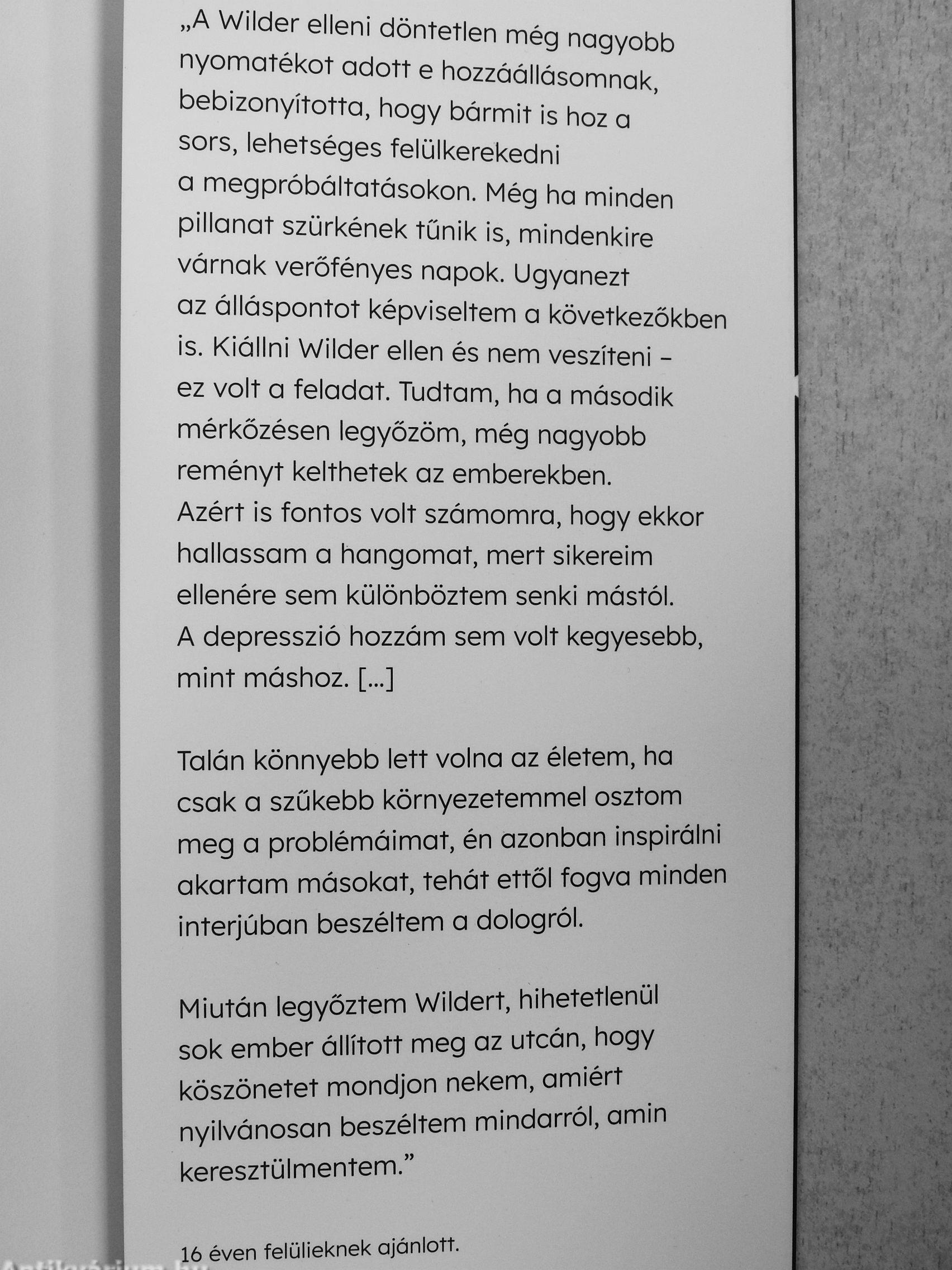 „A Wilder elleni döntetlen még nagyobb nyomatékot adott e hozzáállásomnak, bebizonyította, hogy bármit is hoz a sors, lehetséges felülkerekedni a megpróbáltatásokon. Még ha minden pillanat szürkének tűnik Is, mindenkire várnak verőfényes napok. Ugyanezt az álláspontot képviseltem a következőkben is. Kiállni Wilder ellen és nem veszíteni -ez volt 0 feladat. Tudtam, ha a második mérkőzésen legyőzöm, még nagyobb reményt kelthetek az emberekben. Azért is fontos volt számomra, hogy ekkor hallassam a hangomat, mert sikereim ellenére sem különböztem senki mástól. A depresszió hozzám sem volt kegyesebb, mint máshoz. [ ]