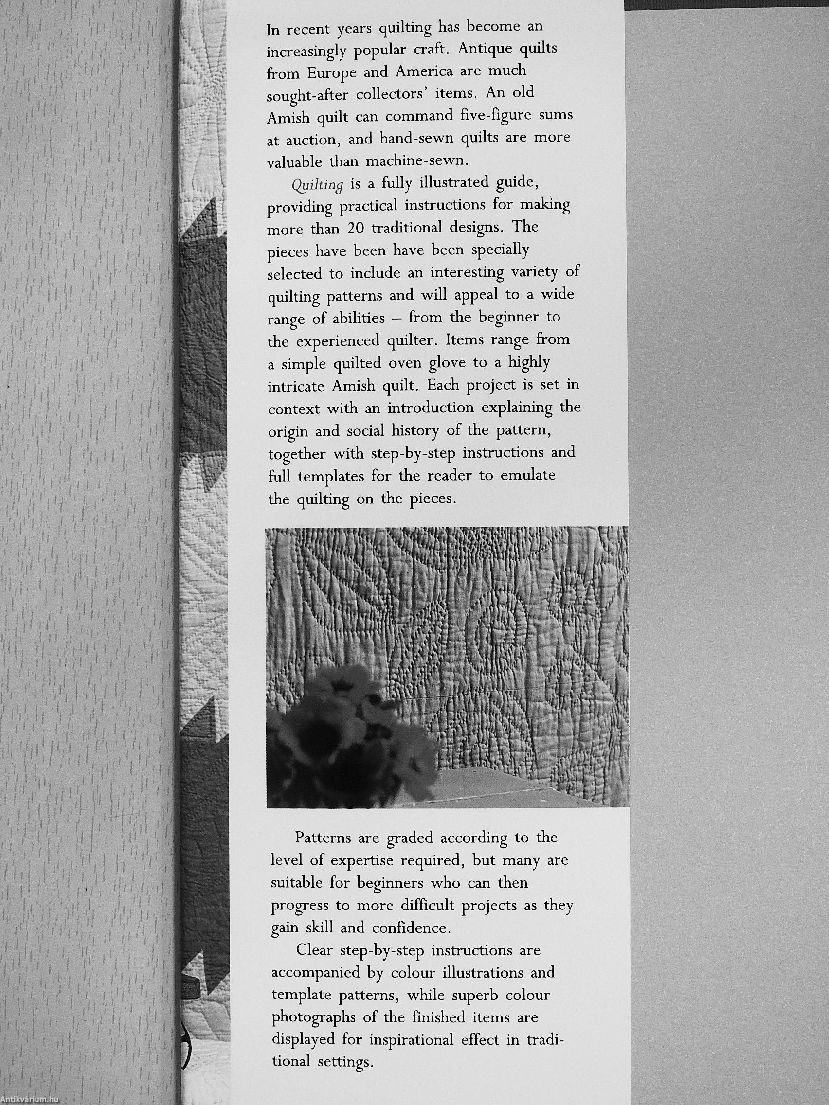 Quilting is a fully illustrated guide, providing practical instructions for making more than 20 traditional designs. The pieces have been have been specially selected to include an interesting variety of quilting patterns and will appeal to a wide range of abilities - from the beginner to the experienced quilter. Items range from a simple quilted oven glove to a highly intricate Amish quilt. Each project is set in context with an introduction explaining the origin and social history of the pattern, together with step-by-step instructions and full templates for the reader to emulate the quilting on the pieces.