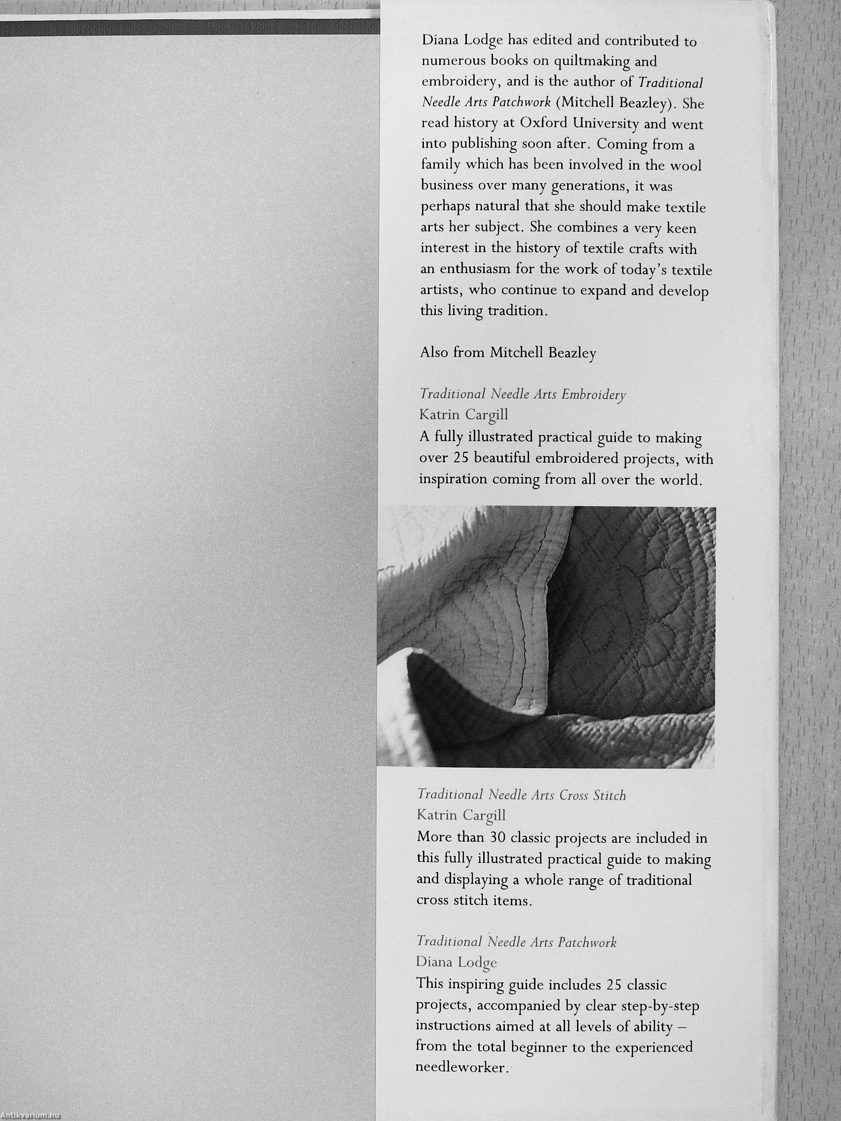 Diana Lodge has edited and contributed to numerous books on quiltmaking and embroidery, and is the author of Traditional Needle Arts Patchwork (Mitchell Beazley). She read history at Oxford University and went into publishing soon after. Coming from a family which has been involved in the wool business over many generations, it was perhaps natural that she should make textile arts her subject. She combines a very keen interest in the history of textile crafts with an enthusiasm for the work of today's textile artists, who continue to expand and develop this living tradition.