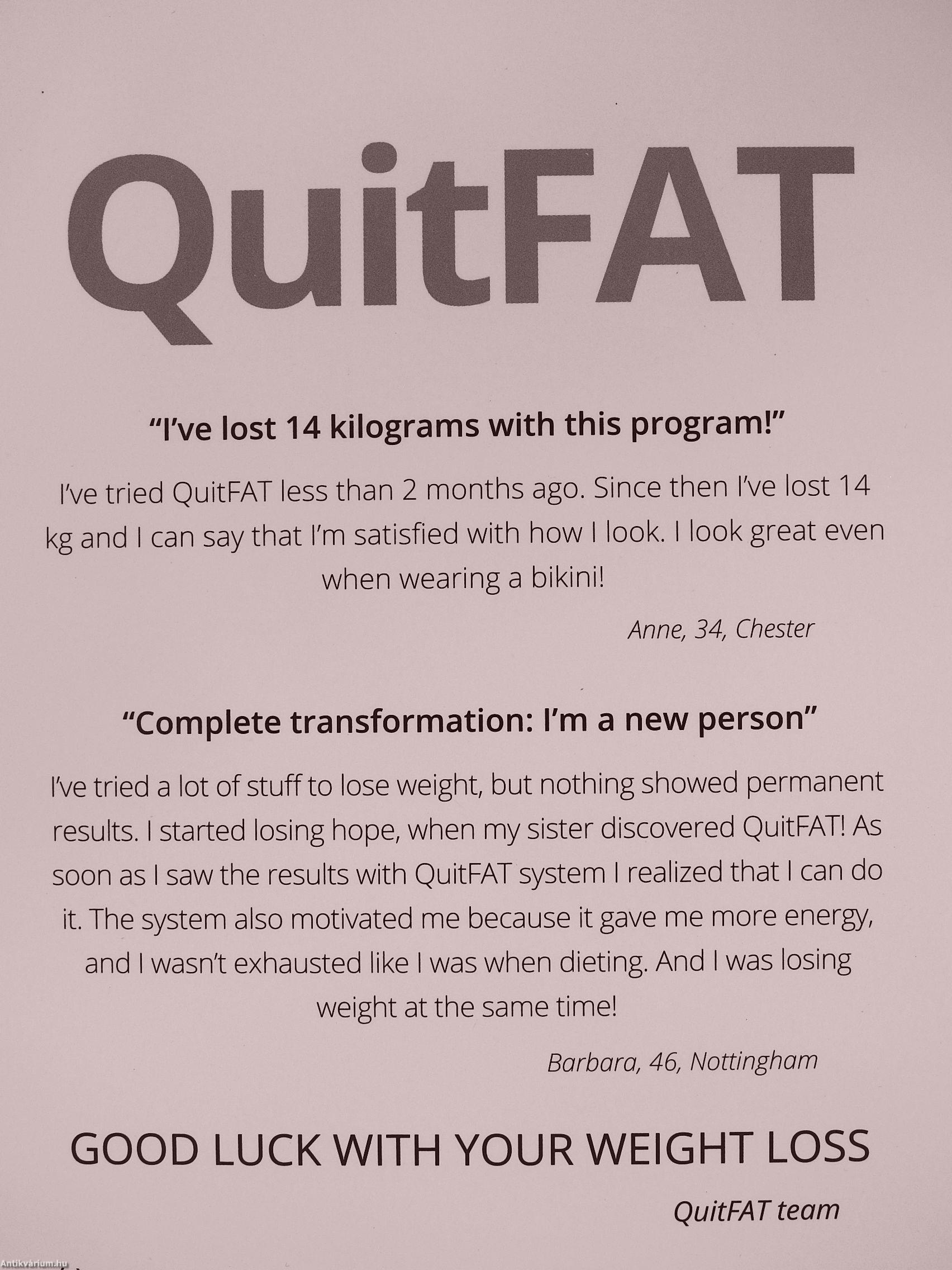 I've tried QuitFAT less than 2 months ago. Since then I've lost 14 kg and I can say that I'm satisfied with how I look. I look great even