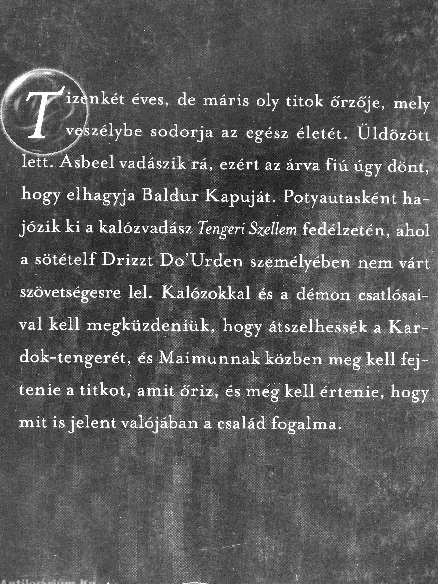 r ^^i^nkét éves, de máris oly titok őrzője, mely K a. vplzélybe sodorja az egész életét. Üldözött lett. Asbeel vadászik rá, ezért az árva fiú úgy dőnt, hogy elhagyja Baldur Kapuját. Potyautasként hajózik ki a kalózvadász tengeri Szellem fedélzetén, ahol a sötételf Drizzt Do'Urden személyében nem várt szövetségesre lel. Kalózokkal és a démon csatlósaival kell megküzdeniük, hogy átszelhessék a Kardok-tengerét, és Maimunnak közben meg kell fejtenie a titkot, amit őriz, és meg kell értenie, hogy mit is jelent valójában a család fogalma.