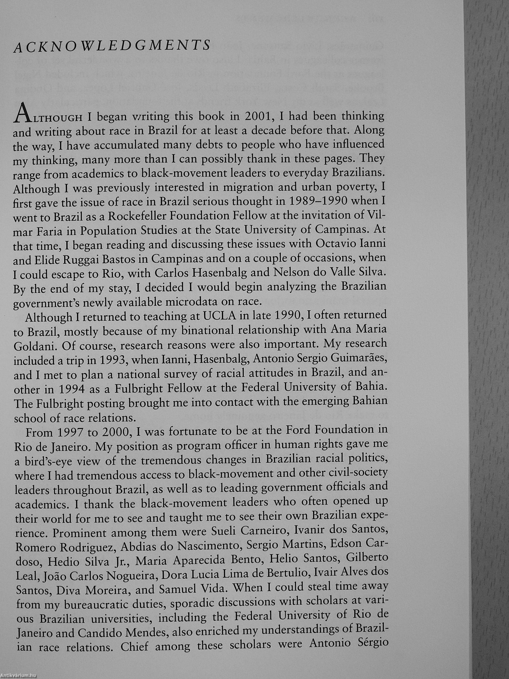 "This is a blockbuster of a book. To a topic—Brazilian race relations—historically fraught with ambiguity, uncertainty, and disagreement, it brings clarity, logic, and lucidity, not to mention several truckloads of data. The result is the most important work on race in Brazil since Gilberto Freyre's seminal The Masters and the Slaves (1933)."
