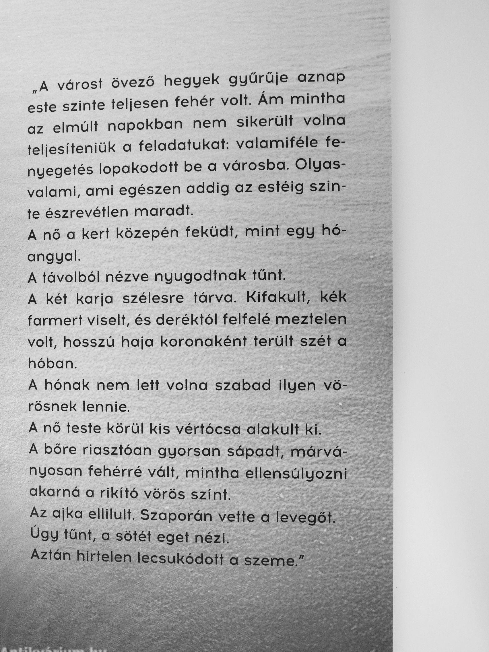 „A várost övező hegyek gyűrűje aznap este szinte teljesen fehér volt. Ánn mintha az elmúlt napokban nem sikerült volna teljesíteniük a feladatukat: valamiféle fenyegetés lopakodott be a városba. Olyasvalami, ami egészen addig az estéig szinte észrevétlen maradt. A nő a kert közepén feküdt, mint egy hó-angyal.