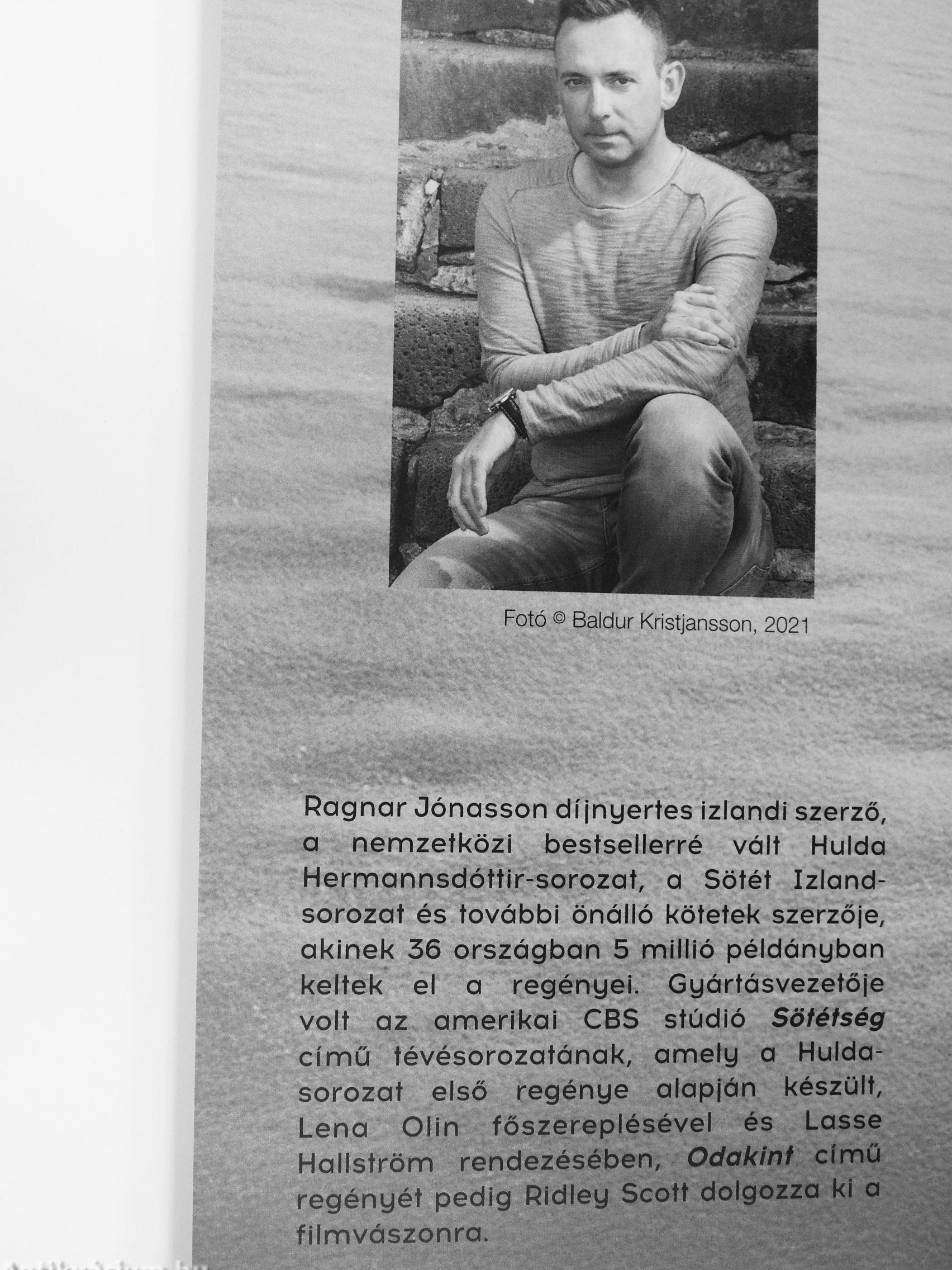 Ragnar Jónasson díjnyertes izlandi szerző, a nennzetközi bestsellerré vált Hulda Hermannsdóttir-sorozat, a Sötét Izland-sorozat és további önálló kötetek szerzője, akinek 36 országban 5 millió példányban keltek el a regényei. Gyártásvezetője volt az amerikai CBS stúdió Sötétség című tévésorozatának, amely a Hulda-sorozat első regénye alapján készült, Lena Olin főszereplésével és Lasse Hallström rendezésében. Odakint című regényét pedig Ridley Scott dolgozza kl a filmvászonra.