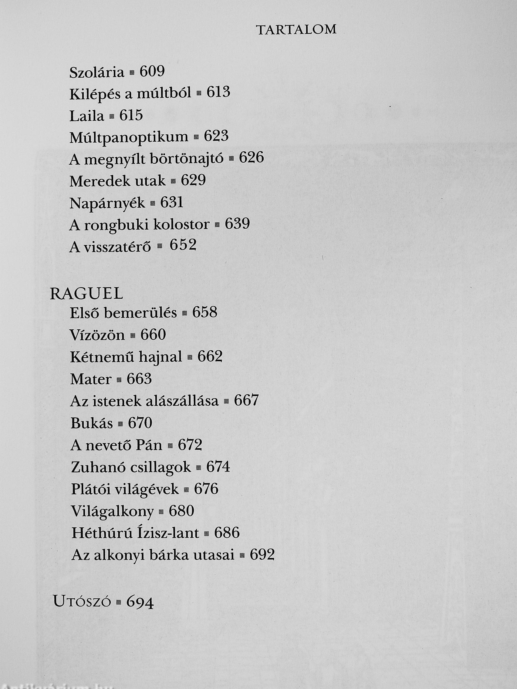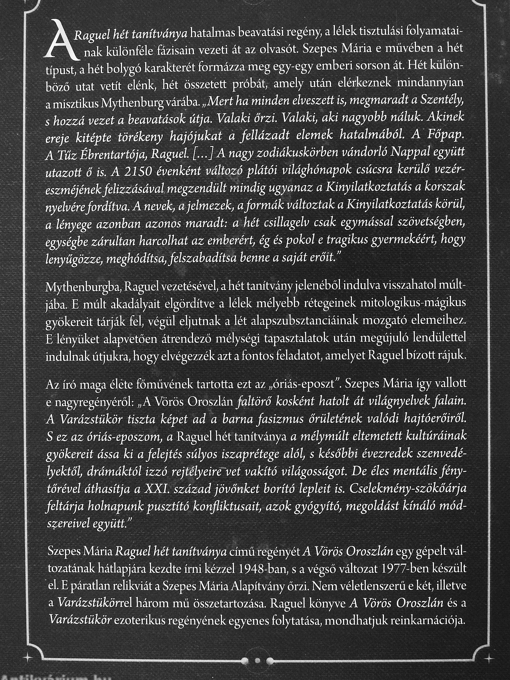 ÁRaguéi hét tanítványa hatalmas beavatási regény, a lélek tisztulási folyamatai-I nak különféle fázisain vezeti át az olvasót. Szepes Mária e művében a hét típust, a hét bolygó karakterét formázza meg egy-egy emberi sorson át. Hét különböző utat vetít elénk, hét összetett próbát, amely után elérkeznek mindannyian a misztikus Mythenburg várába. „Mert ha minden elveszett is, megmaradt a Szentély, s hozzá vezet a beavatások útja. Valaki őrzi. Valaki, aki nagyobb náluk. Akinek ereje kitépte törékeny hajójukat a fellázadt elemek hatalmából. A Főpap. A Tűz Ébrentartója, Raguéi. [ ] A nagy zodiákuskörben vándorló Nappal együtt utazott ő is. A 2150 évenként változó plátói világhónapok csúcsra kerülő vezéreszméjének felizzásával megzendült mindig ugyanaz a Kinyilatkoztatás a korszak nyelvére fordítva. A nevek, a jelmezek, a formák változtak a Kinyilatkoztatás körül, a lényege azonban azonos maradt: a hét csillagelv csak egymással szövetségben, egységbe zárultan harcolhat az emberért, ég és...