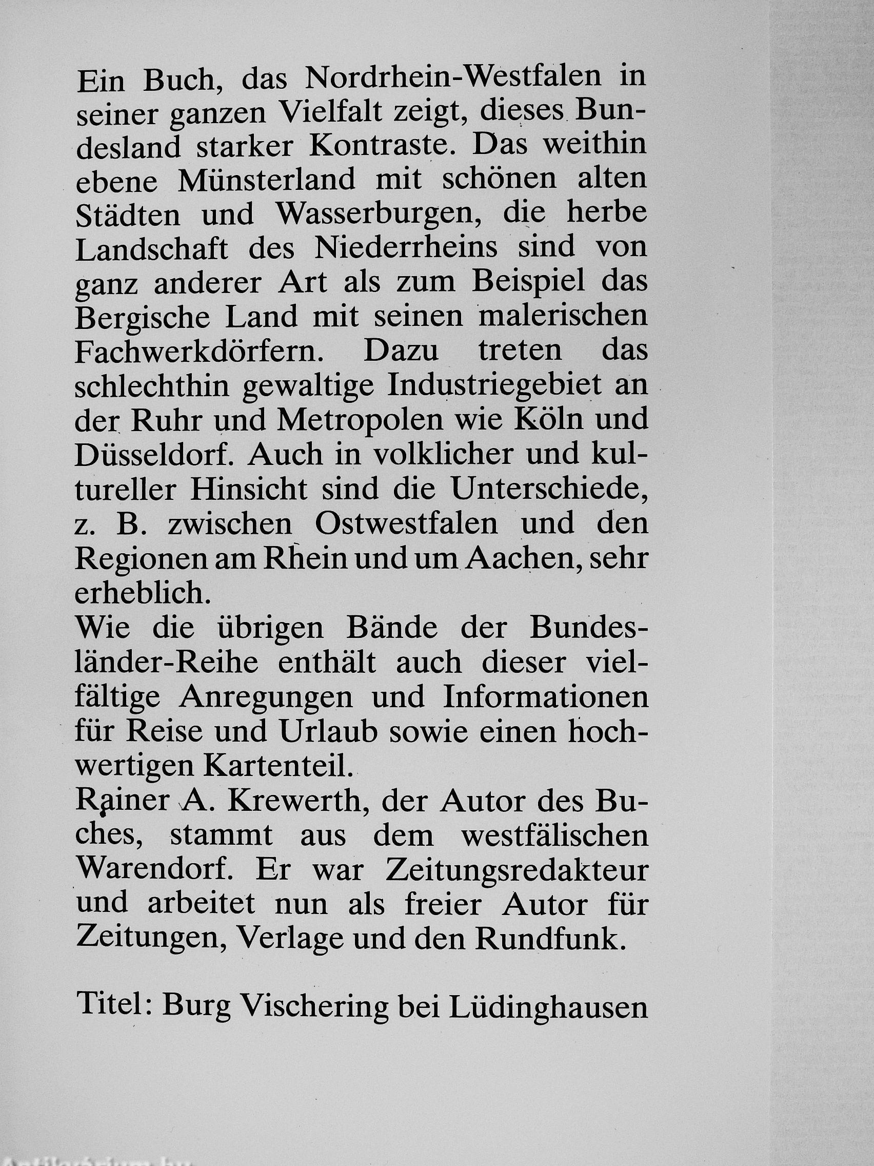 Ein Buch, das Nordrhein-Westfalen in seiner ganzen Vielfalt zeigt, dieses Bundesland starker Kontraste. Das weithin ebene Münsterland mit schönen alten Städten und Wasserburgen, die herbe Landschaft des Niederrheins sind von ganz anderer Art als zum Beispiel das Bergische Land mit seinen malerischen Fachwerkdörfern. Dazu treten das schlechthin gewaltige Industriegebiet an der Ruhr und Metropolen wie Köln und Düsseldorf. Auch in volklicher und kultureller Hinsicht sind die Unterschiede, z. B. zwischen Ostwestfalen und den Regionen am Rhein und um Aachen, sehr erheblich.