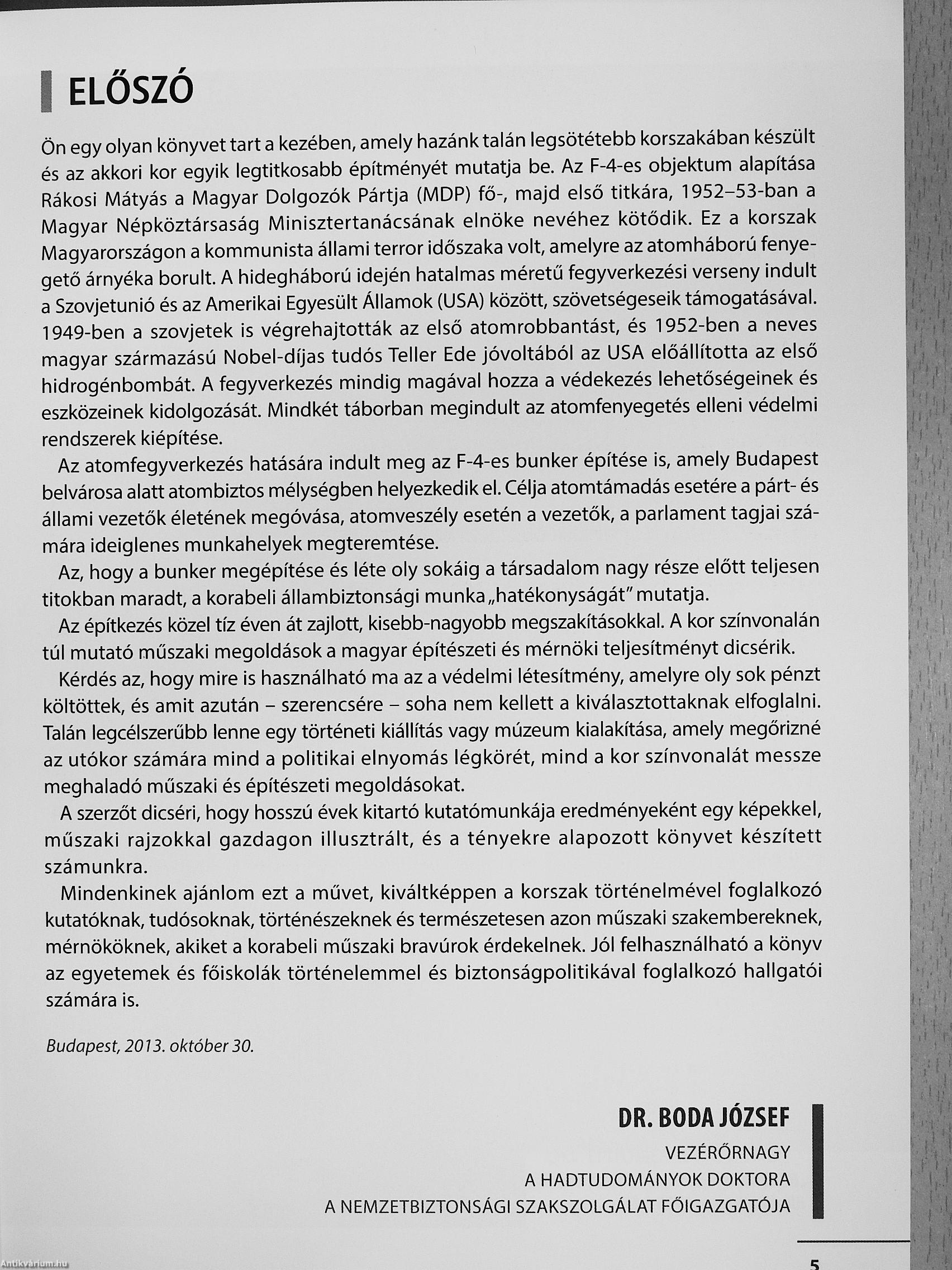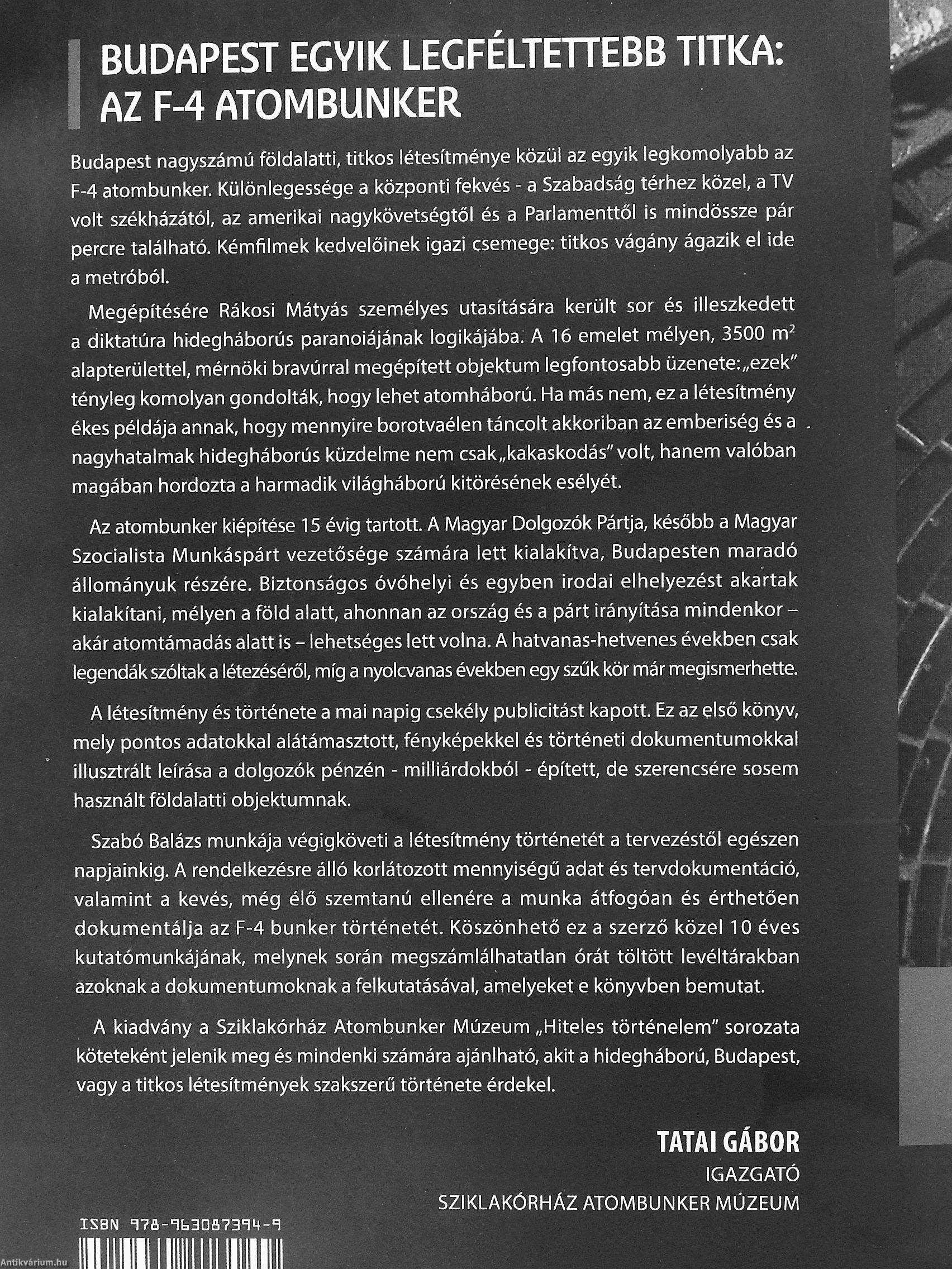 Szabó Balázs munkája végigköveti a létesítmény történetét a tervezéstől egészen napjainkig. A rendelkezésre álló korlátozott mennyiségű adat és tervdokumentáció, valamint a kevés, még élő szemtanú ellenére a munka átfogóan és érthetően dokumentálja az F-4 bunker történetét. Köszönhető ez a szerző közel 10 éves kutatómunkájának, melynek során megszámlálhatatlan órát töltött levéltárakban azoknak a dokumentumoknak a felkutatásával, amelyeket e könyvben bemutat.