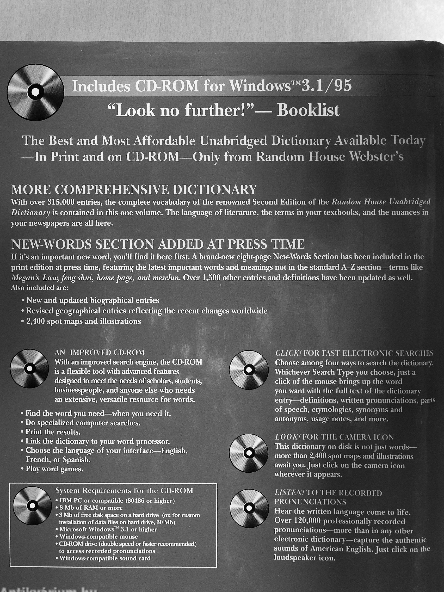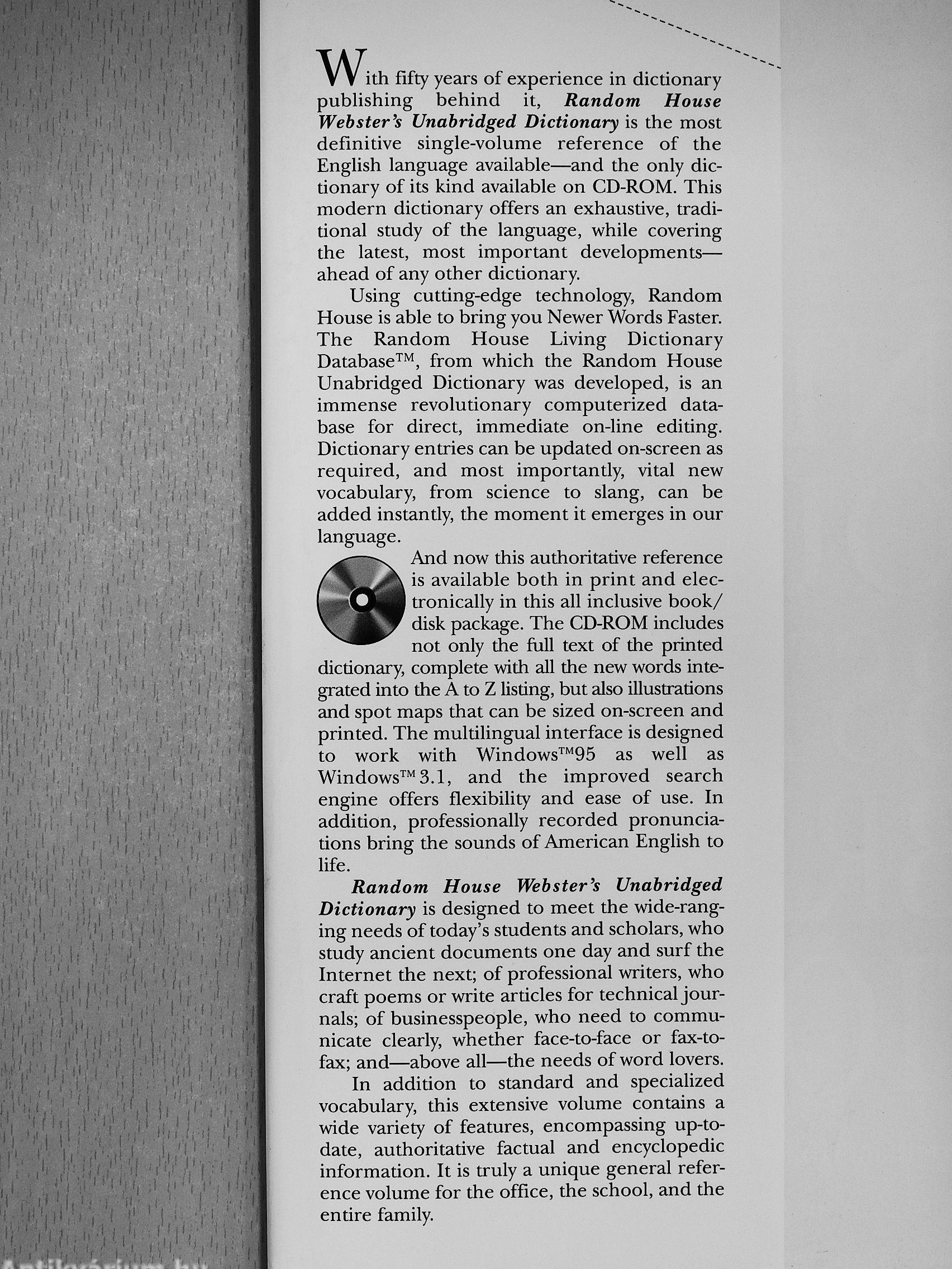 ith fifty years of experience in dictionary publishing behind it, Random House Webster's Unabridged Dictionary is the most definitive single-volume reference of the English language available—and the only dictionary of its kind available on CD-ROM. This modern dictionary offers an exhaustive, traditional study of the language, while covering I ,1' 1' n the latest, most important developments— ahead of any other dictionary.