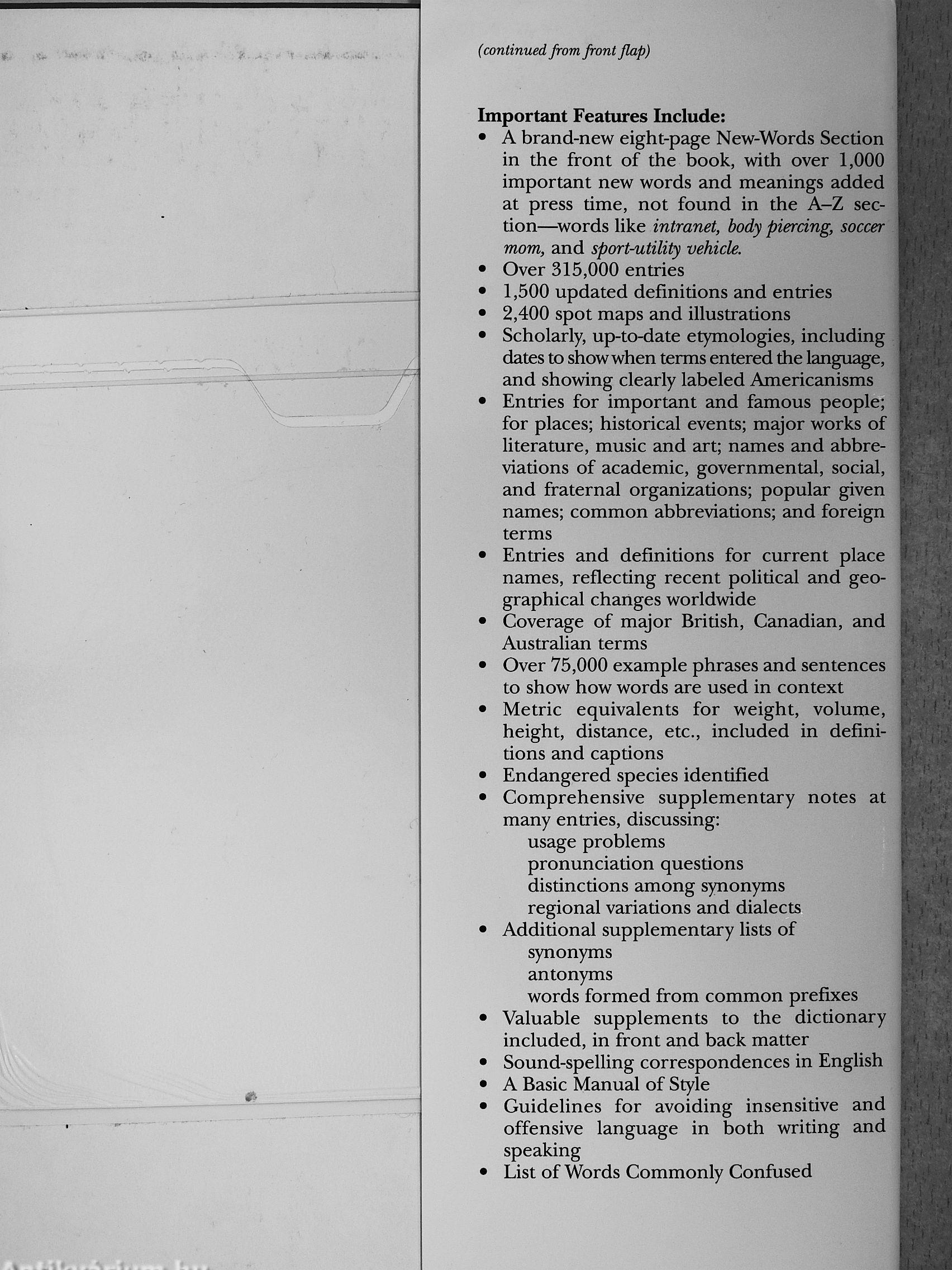 • A brand-new eight-page New-Words Section in the front of the book, with over 1,000 important new words and meanings added at press time, not found in the A-Z section—^words like intranet, body pierang, soccer mom, and sport-utility vehicle.