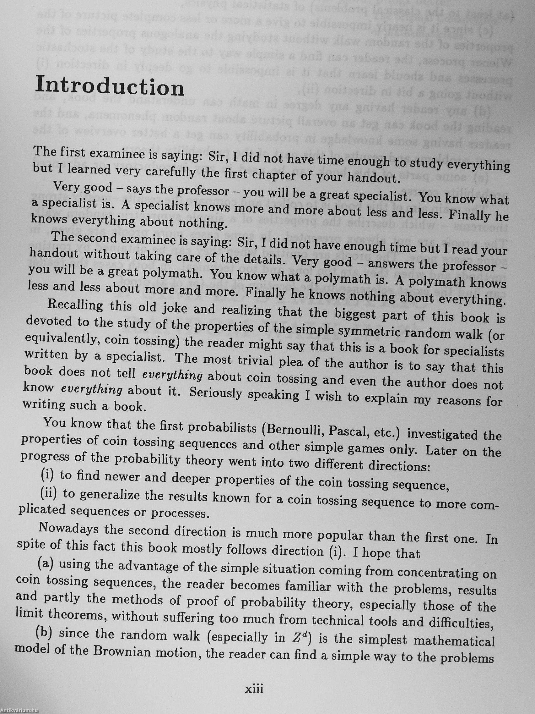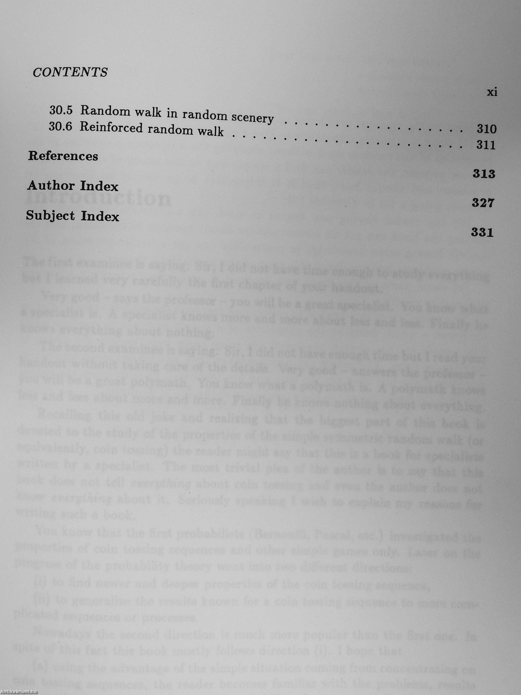 A basic attitude of the author is that most of the ideas of modern probability theory can be well described and understood by coin-tossing sequences and the Wiener process. This elementary approach gives the reader a chance to become familiar with many of the fundamental concepts and results of the theory, especially in limit theorems, without the headache of paying too much attention to technical difficulties. This very approach can also be argued as an elementary introduction to many notions of statistical physics. A large part of the material covered here has not appeared in any other book so far. Vissza