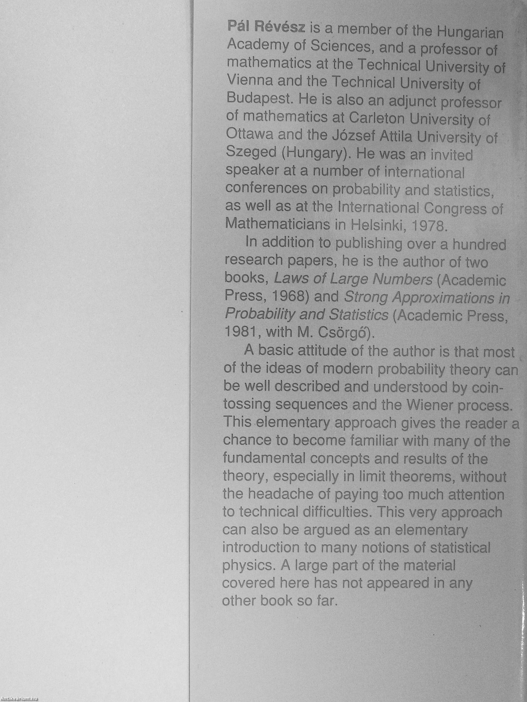 Pál Révész is a member of the Hungarian ' Academy of Sciences, and a professor of mathematics at the Technical University of . Vienna and the Technical University of Budapest. He is also an adjunct professor of mathematics at Carleton University of Ottawa and the József Attila University of Szeged (Hungary). He was an invited speaker at a number of international conferences on probability and statistics, as well as at the International Congress of Mathematicians in Helsinki, 1978.