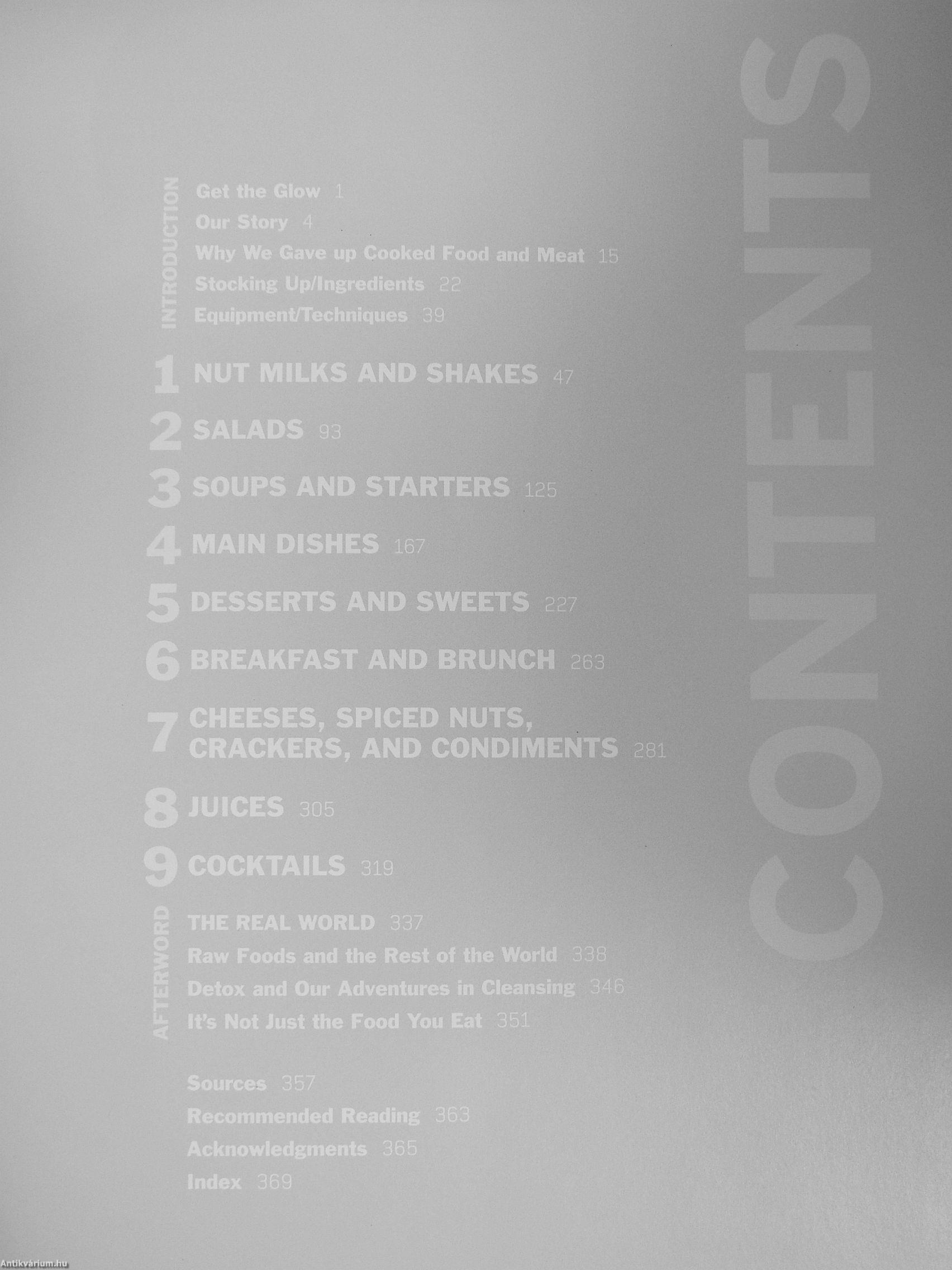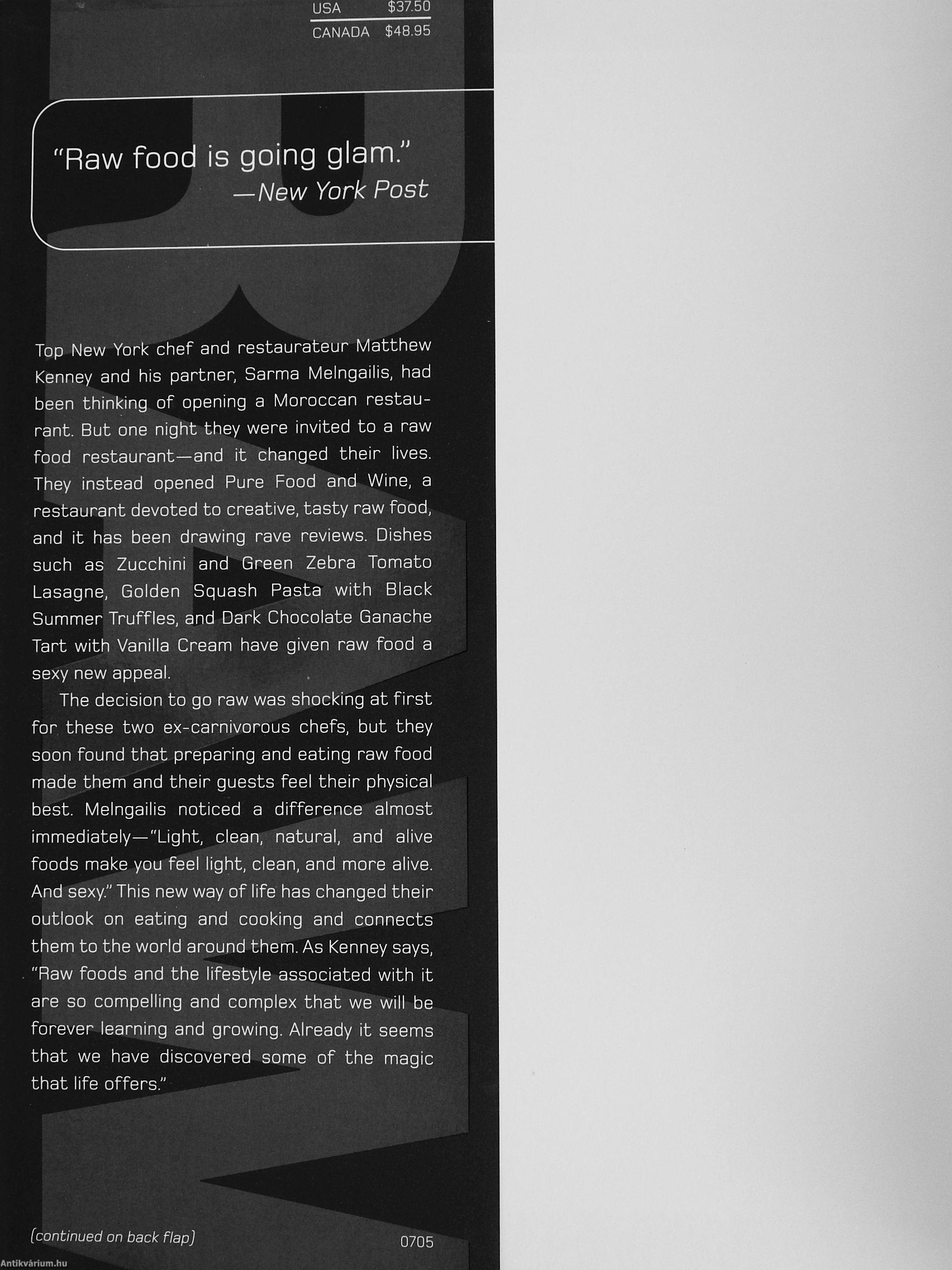 The decision to go raw was shocking at first for these two ex-carnivorous chefs, but they soon found that preparing and eating raw food made them and their guests feel their physical best. Melngailis noticed a difference almost immediately—"Light, clean, natural, and alive foods make you feel light, clean, and more alive. And sexy." This new way of life has changed their outlook on eating and cooking and connects them to the world around them. As Kenney says, "Raw foods and the lifestyle associated with it are so compelling and complex that we will be forever learning and growing. Already it seems that we have discovered some of the magic that life offers."