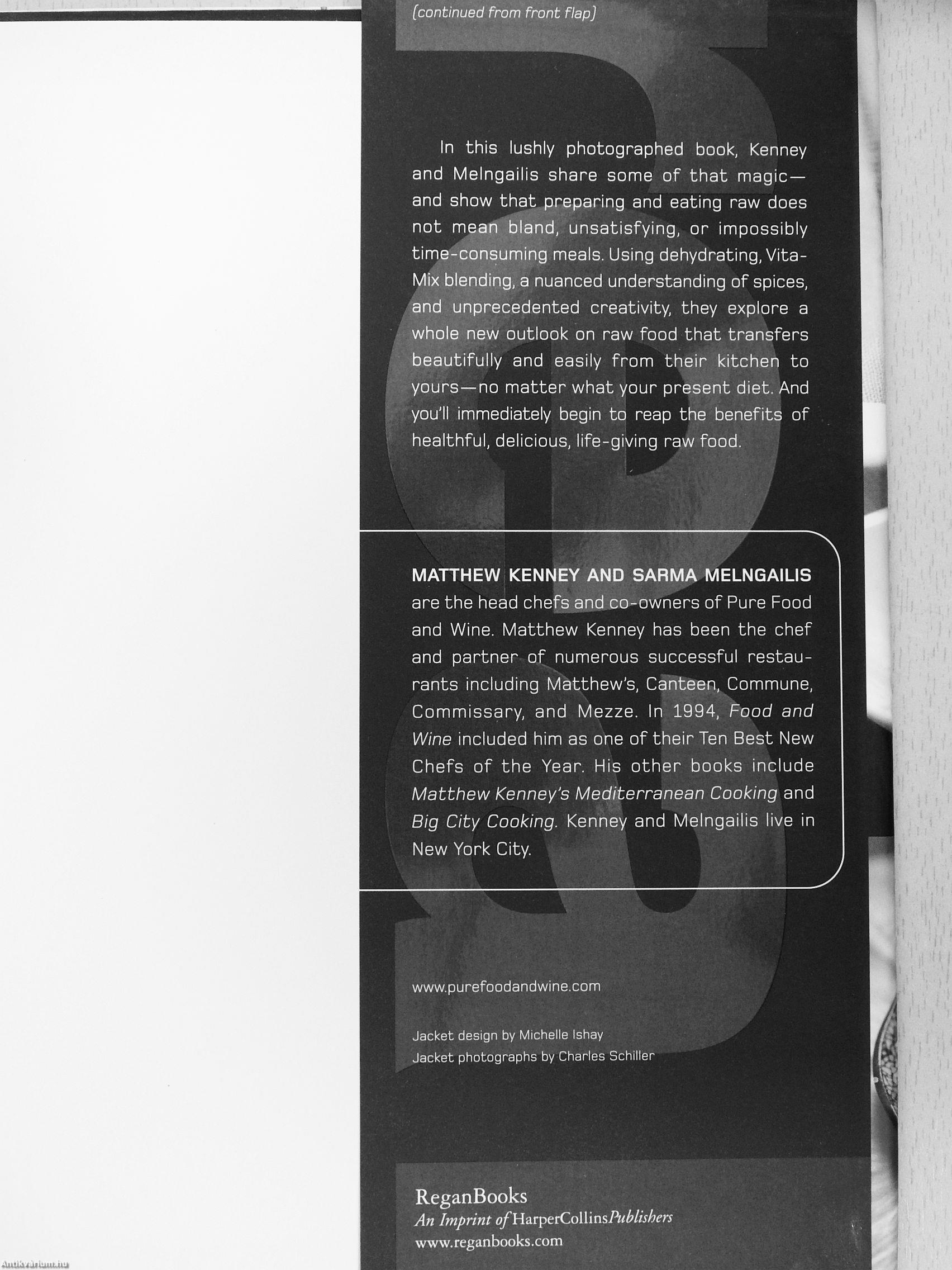 MATTHEW KENNEY AND SARMA MELNGAILIS are the head chefs and co-owners of Pure Food and Wine. Matthew Kenney has been the chef and partner of numerous successful restaurants including Matthew's, Canteen, Commune, Commissary, and Mezze. In 1994, Food and Wine included him as one of their Ten Best New Chefs of the Year. His other books Include Matthew Kenney's Mediterranean Cooking and Big City Cooking. Kenney and Melngailis live in New York City.