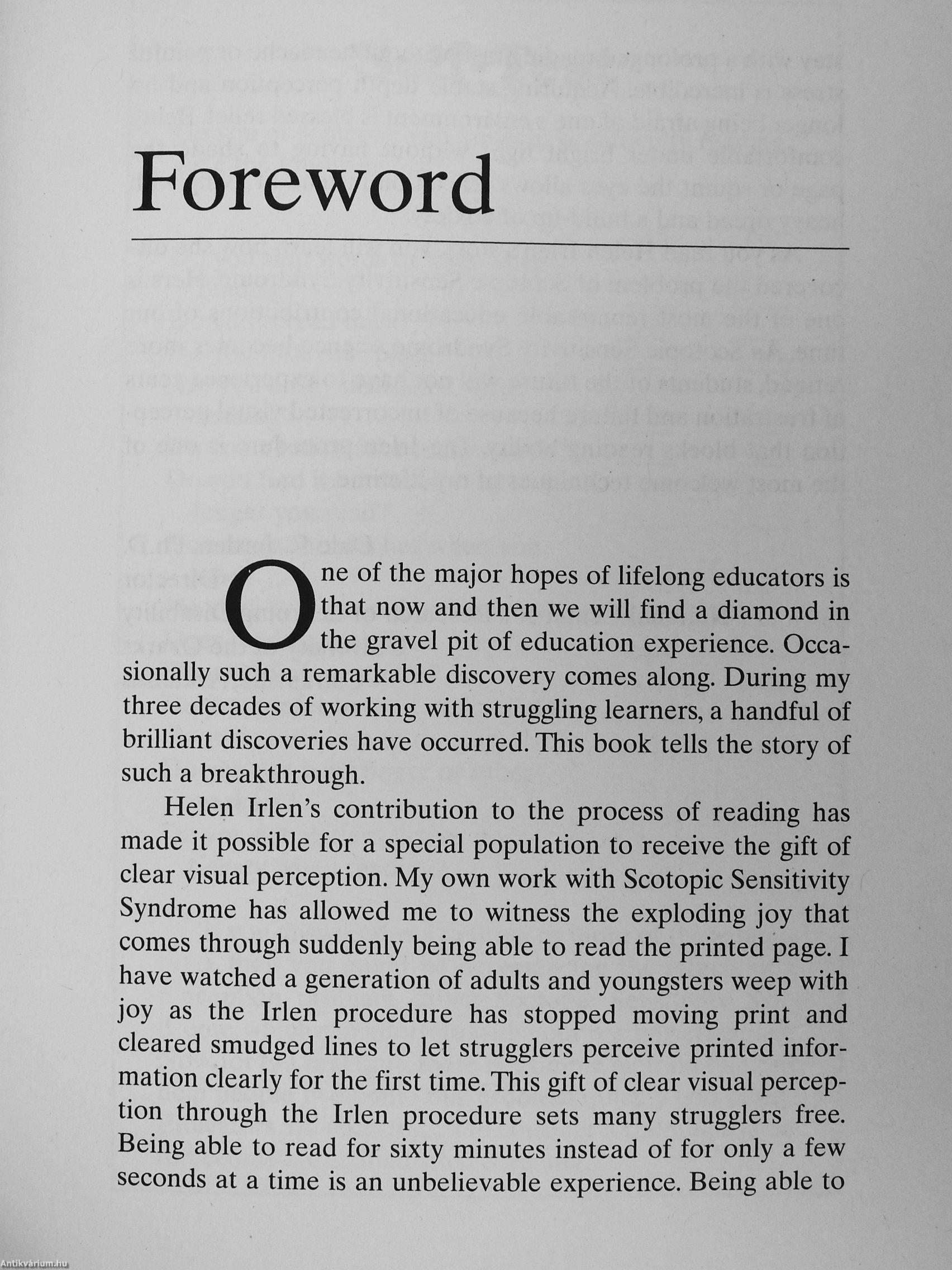 Helen Irlen is an internationally recognized educator, researcher, and scholar. The Irlen Method has been featured on 60 Minutes^ Good Morning America, ABC Worldwide News with Peter Jennings, and news programs in many other countries. There are Irlen Clinics in most U.S. states and throughout the world. More than eight thousand educators are now trained and certified as Irlen screeners in school systems in the United States, Canada, England, Australia, and New Zealand. To find a certified Irlen practitioner, visit www.Irlen.com.