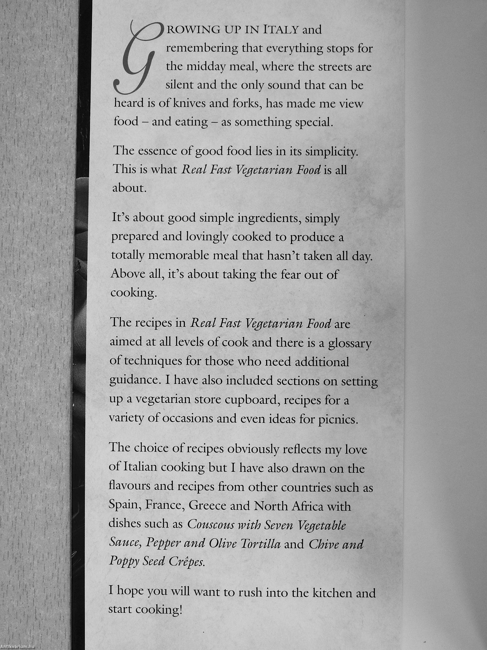 The recipes in Real Fast Vegetarian Food are aimed at all levels of cook and there is a glossary of techniques for those who need additional guidance. I have also included sections on setting up a vegetarian store cupboard, recipes for a variety of occasions and even ideas for picnics.