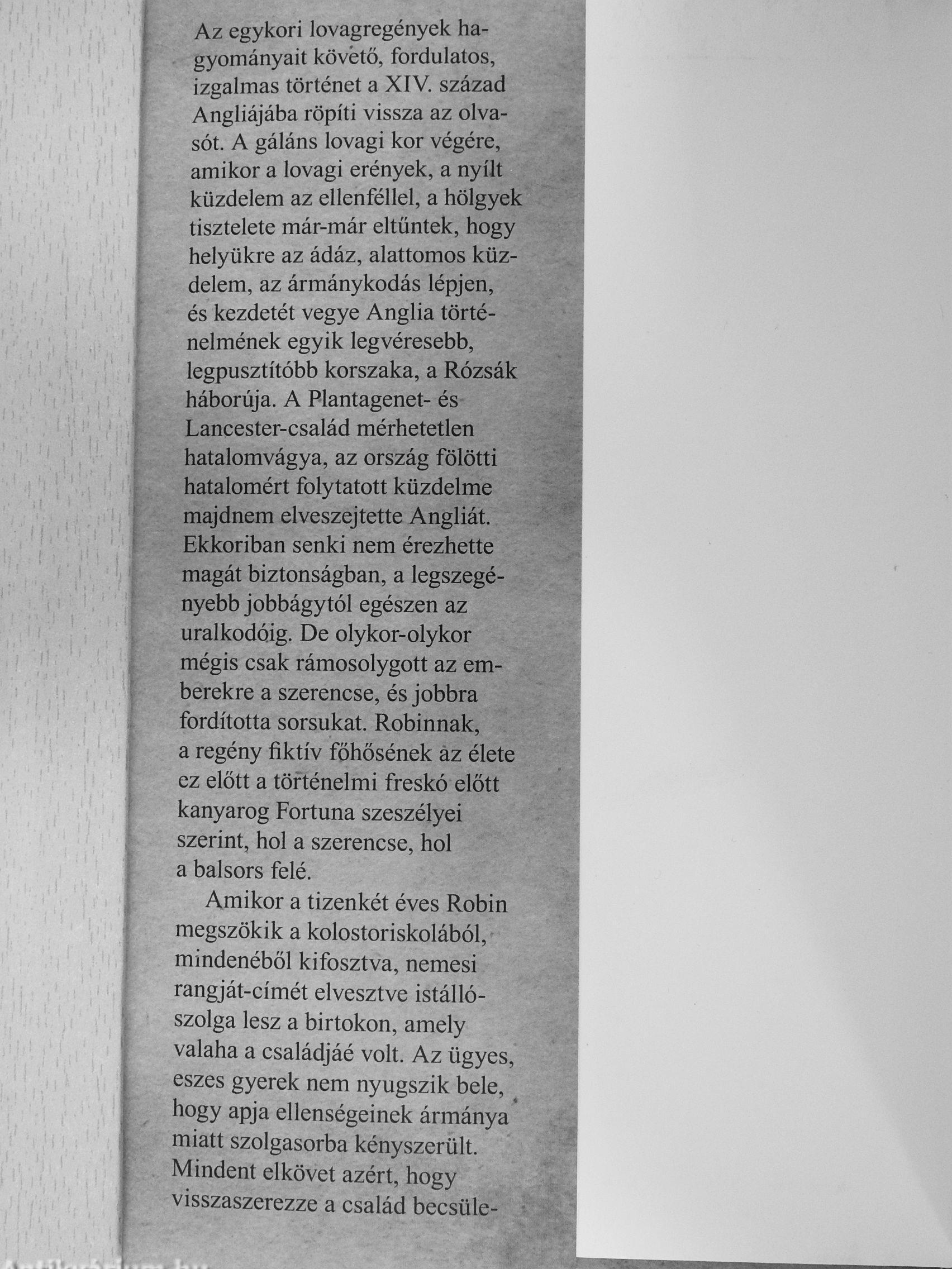 Az egykori lovagregények hagyományait követő, fordulatos, izgalmas történet a XIV. század Angliájába röpíti vissza az olvasót. A gáláns lovagi kor végére, amikor a lovagi erények, a nyílt küzdelem az ellenféllel, a hölgyek tisztelete már-már eltűntek, hogy helyükre az ádáz, alattomos küzdelem, az ármánykodás lépjen, és kezdetét vegye Anglia történelmének egyik legvéresebb, legpusztítóbb korszaka, a Rózsák háborúja. A Plantagenet- és Lancester-család mérhetetlen hatalomvágya, az ország fölötti hatalomért folytatott küzdelme majdnem elveszejtette Angliát. Ekkoriban senki nem érezhette magát biztonságban, a legszegényebb jobbágytól egészen az uralkodóig. De olykor-olykor mégis csak rámosolygott az emberekre a szerencse, és jobbra fordította sorsukat. Robinnak, a regény fiktív főhősének az élete ez előtt a történelmi freskó előtt kanyarog Fortuna szeszélyei szerint, hol a szerencse, hol a balsors felé.