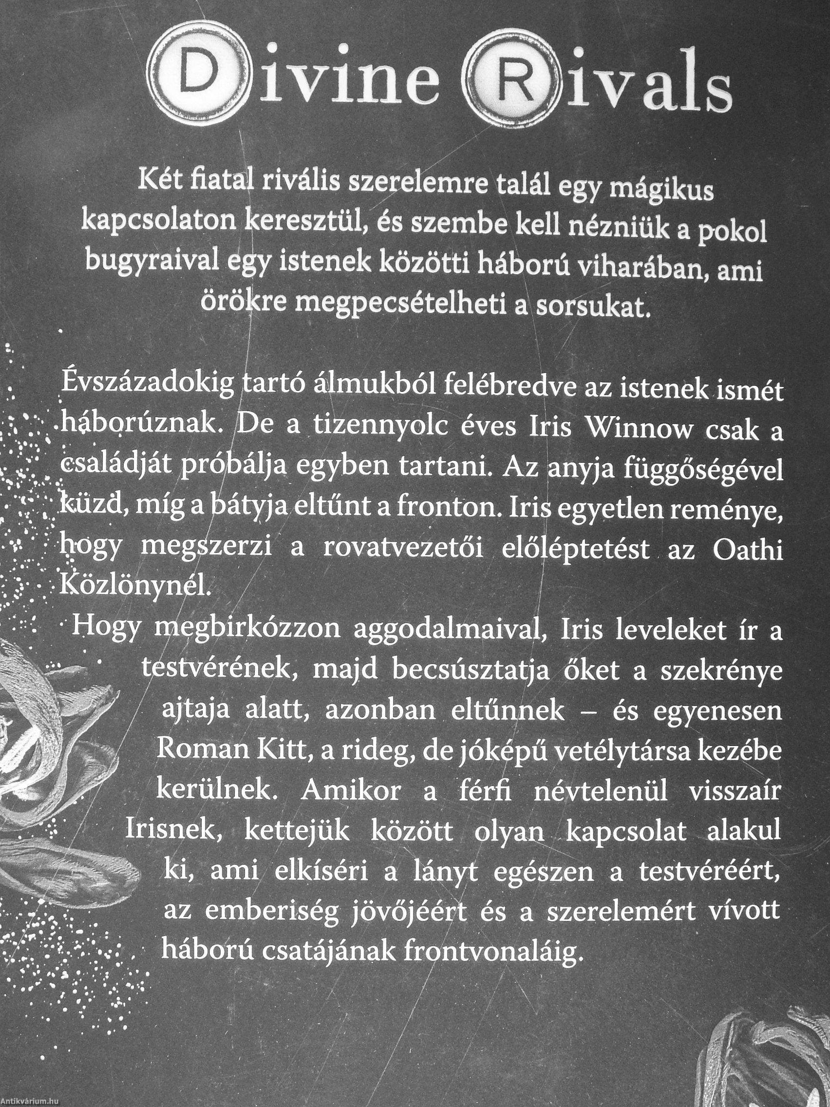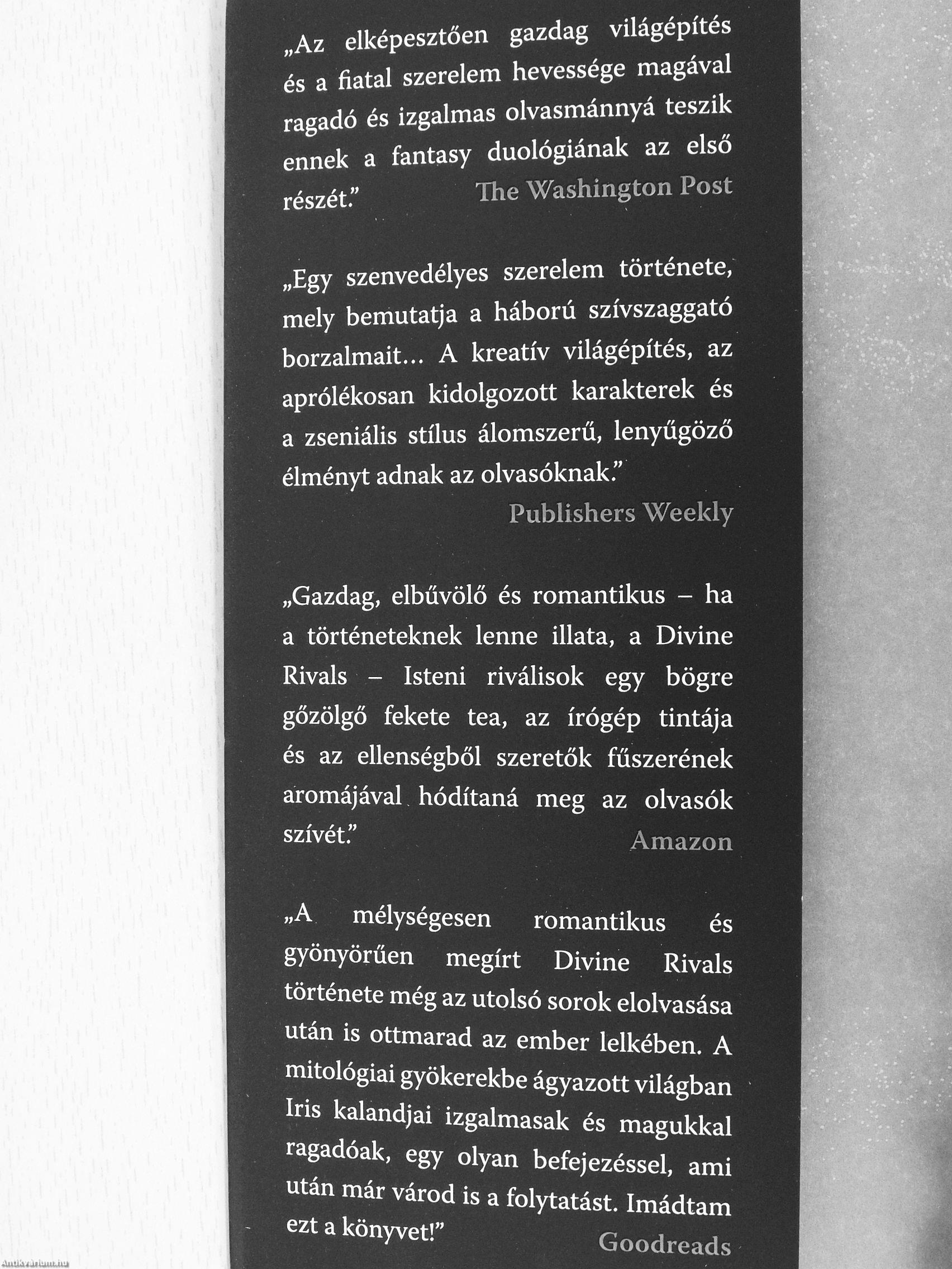 „A mélységesen romantikus és gyönyörűen megírt Divine Rivals története még az utolsó sorok elolvasása után is ottmarad az ember lelkében. A mitológiai gyökerekbe ágyazott világban Iris kalandjai izgalmasak és magukkal ragadóak. egy olyan befejezéssel, ami után már várod is a folytatást. Imádtam ezt a könyvet!" Goodreads
