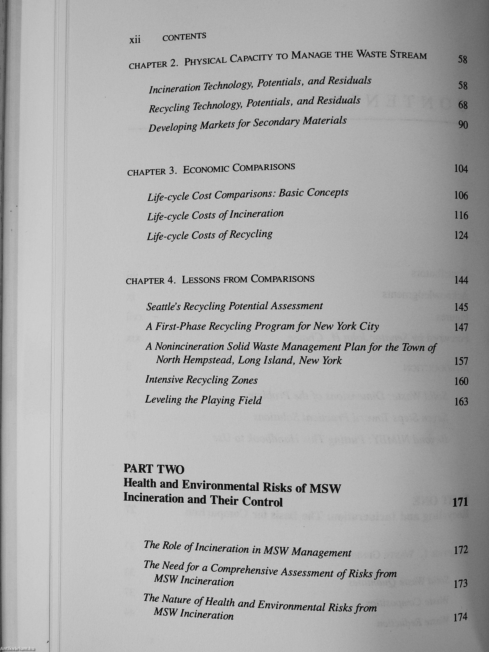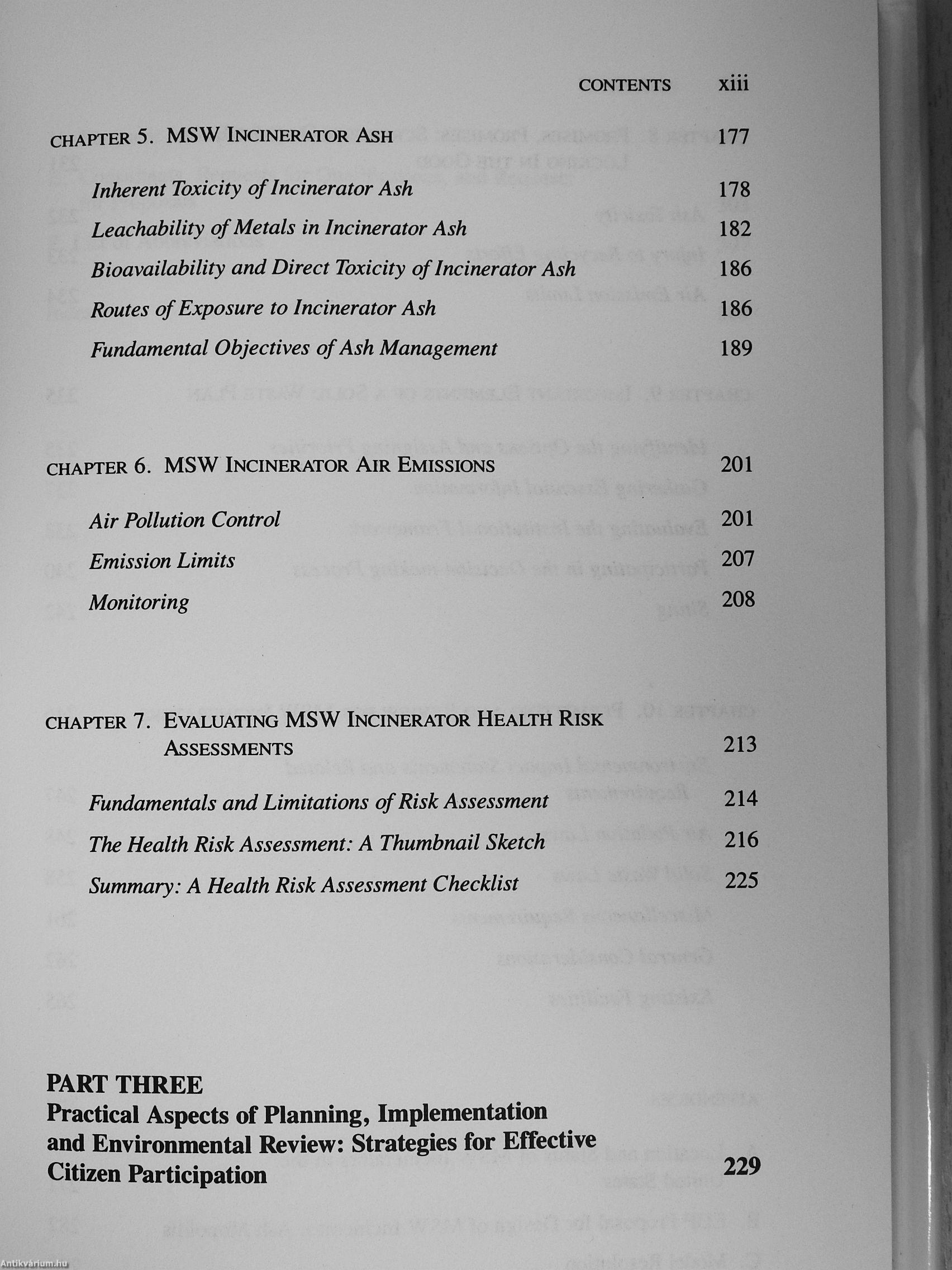 • An evaluation of the health and environmental impacts of incineration, including a critical review of the role of risk assessment in incinerator proposals and an extensive discussion of the measures needed to reduce incinerator risks.