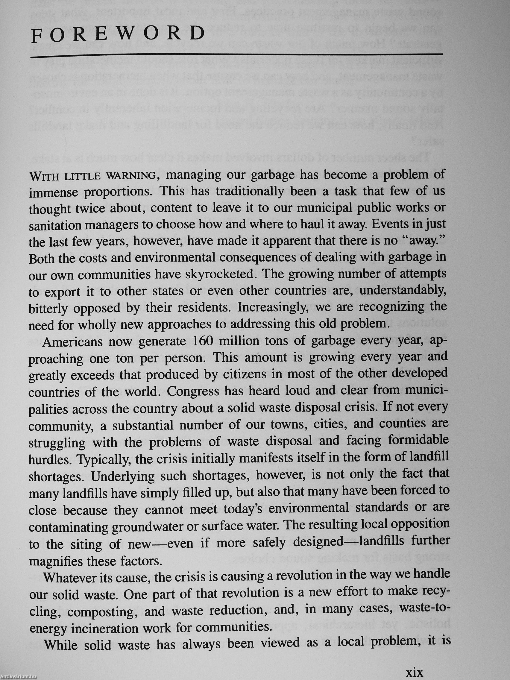 With httle warning, managing our garbage has become a problem of immense proportions. This has traditionally been a task that few of us thought twice about, content to leave it to our municipal public works or sanitation managers to choose how and where to haul it away. Events in just the last few years, however, have made it apparent that there is no "away." Both the costs and environmental consequences of dealing with garbage in our own communities have skyrocketed. The growing number of attempts to export it to other states or even other countries are, understandably, bitterly opposed by their residents. Increasingly, we are recognizing the need for wholly new approaches to addressing this old problem.