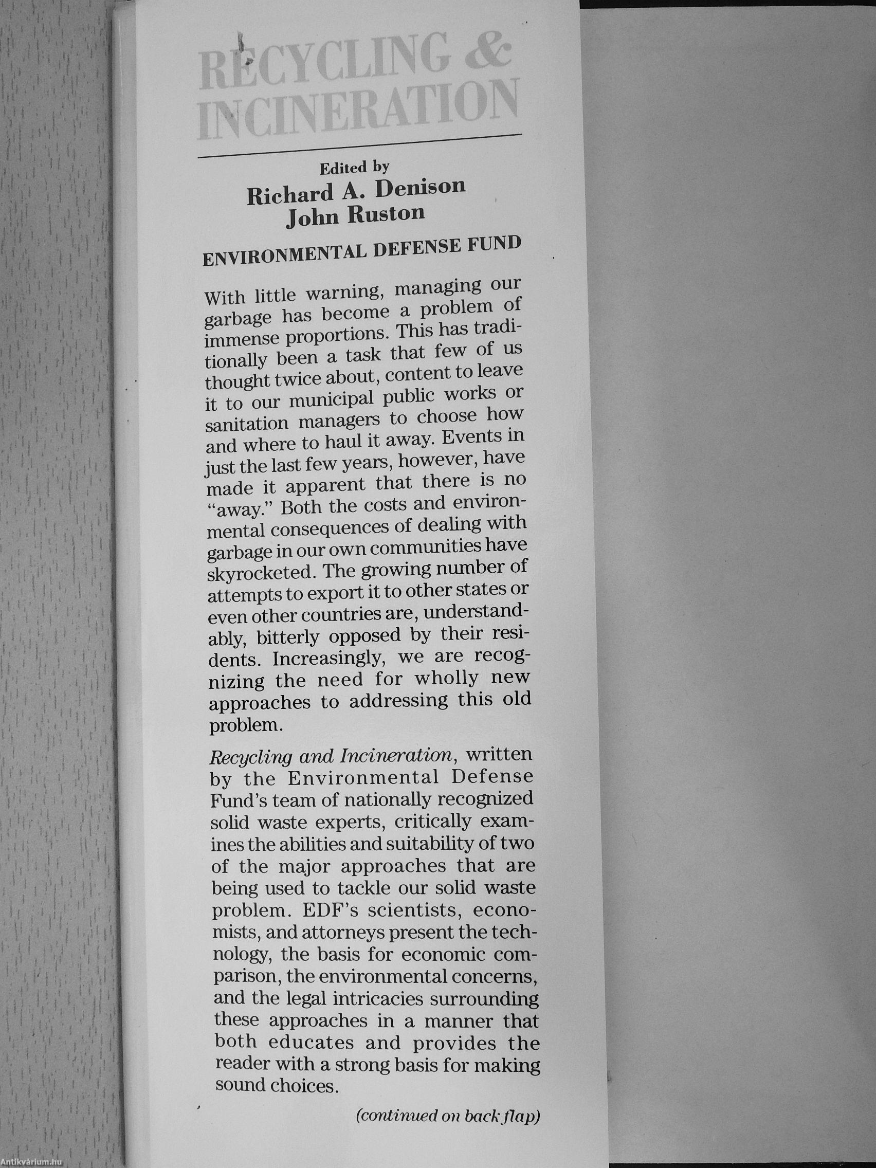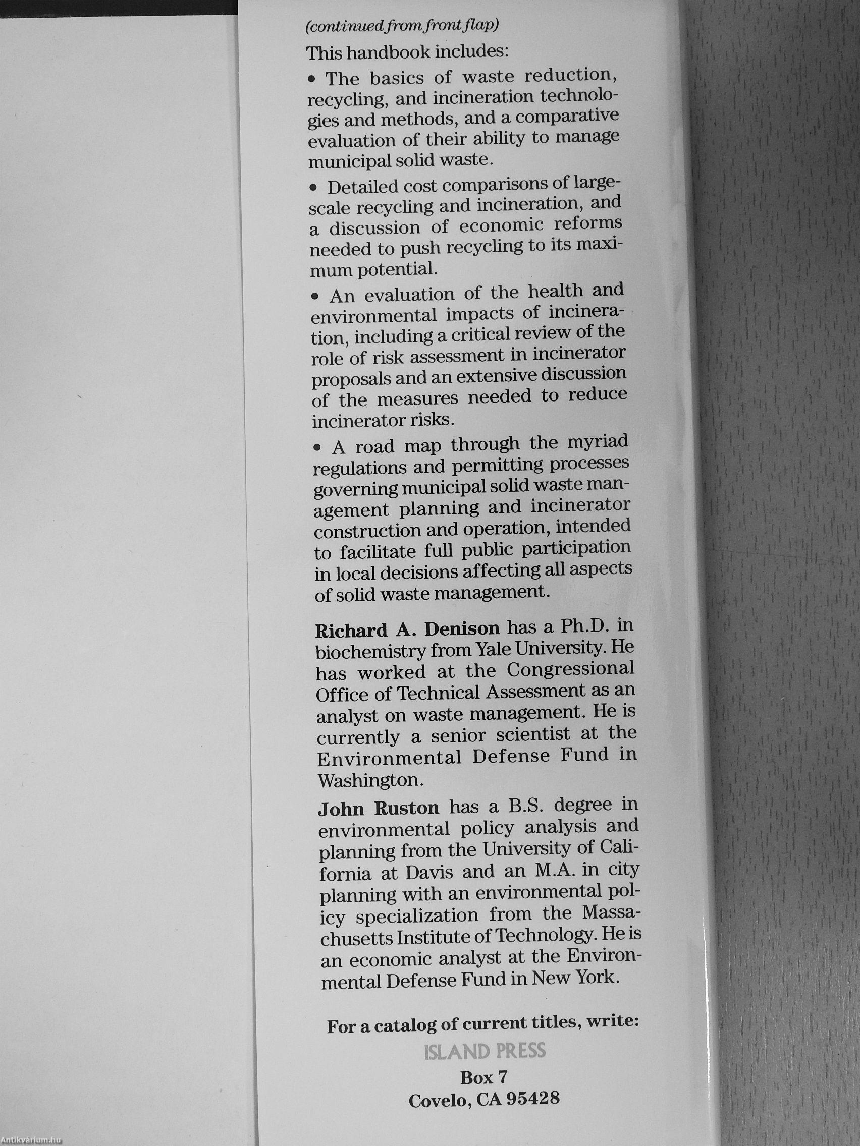 Recycling and Incineration, written by the Environmental Defense Fund's team of nationally recognized solid waste experts, critically examines the abilities and suitability of two of the major approaches that are being used to tackle our solid waste problem. EDF's scientists, economists, and attorneys present the technology, the basis for economic comparison, the environmental concerns, and the legal intricacies surrounding these approaches in a manner that both educates and provides the reader with a strong basis for making sound choices.