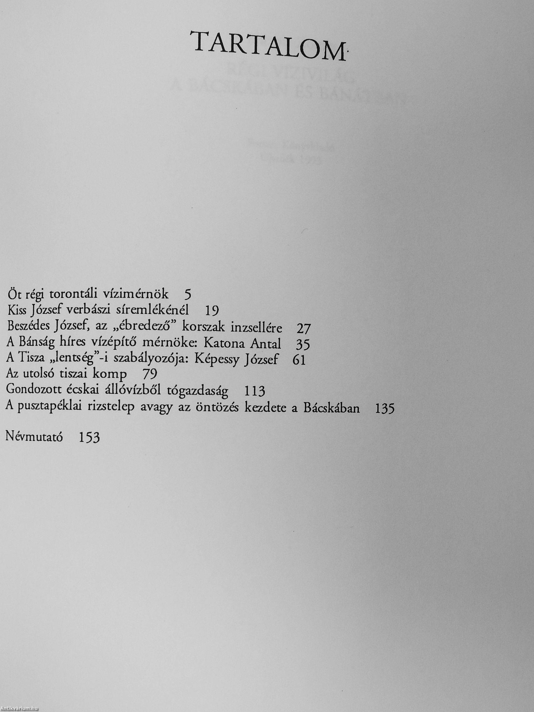 A képzőművészeti hagyományokból merítő Festők nyomában (1990) és a művelődéstörténeti írásait tartalmazó Betűk és képek című (1992) könyve után Kalapis Zoltán „vizes" szövegeit, a vízgazdálkodás, a vízi munkák tárgykörében született „riport-tanulmányait" gyűjtötte egybe. Az elkövetkezőkben a história, a hely- és gazdaságtörténet, a táj- és népismeret témaköréből való írásaiból, illetve „honismereti füzeteiből" ad majd válogatást.