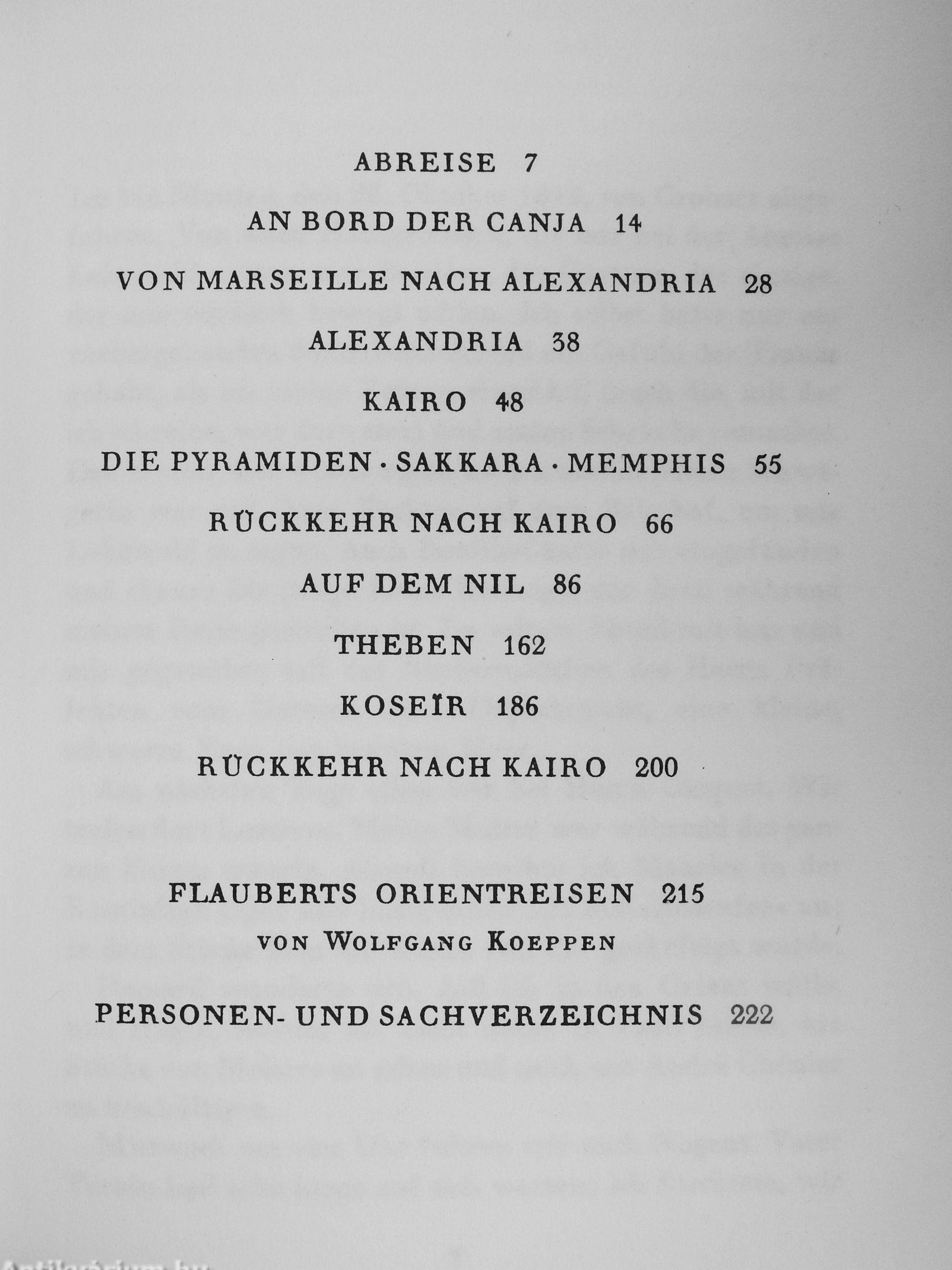 Er läßt sich gern von seinem Freund Maxim du Champ (einem der ersten bedeutenden Fotografen) zur Fahrt nach dem schwarzen Erdteil verfuhren, um dort in dem ihm fremden Leben unterzutauchen. Der große schöne Reiz des Ägyptischen Tagebuchs ist »das Unmittelbare, nicht nur die Wirklichkeit, die der Reporter mitbringt, sondern die Wahrheit, die sich einem Empfindsamen einprägt. Flaubert hat das Tagebuch gelassen, wie er es notiert hat. Bei diesem Schwerarbeiter des Stils, bei diesem Besessenen des vollendeten Satzes, der wohlausgewogenen Seite, ein erstaunlicher Vorgang. Aber der Meister, der er war, wußte zu gut, daß die Aufzeichnungen während der Reise in all ihrer Impression und Flüchtigkeit Stil hatten und daß jede Bearbeitung ihnen etwas nehmen würde: die Gunst des Augenblicks« (Koeppen). Flaubert notiert: »Ich trage die Melancholie der barbarischen Völker in mir, mit ihrem Wandertrieb und ihrer angeborenen Unlust am Leben, die sie ihre Länder verlassen ließ, als würden sie dadurch ihrer selbst ledig«. Die Reise nilaufwärts bis zu den Kolossalmonumenten von Abu Simbel dauert Wochen. Zuweilen begegnet man einer Ouß-abwärts fahrenden Canja (Hausboot) mit einem Engländer. »Melancholischer Eindruck: einer kreuzt des anderen Weg, ohne ein Wort zu sagen. Am Uferrand Stelzvögel in langer Reihe; wenn man am sandigen Ufer aussteigt, sieht man die zahllosen Spuren ihrer langen, dünnen Füße. Am Himmel Scharen von Vögeln, die sich wie eine ungeheure, losgelöste Peitschenschnur entfalten; das zieht durch die Luft wie