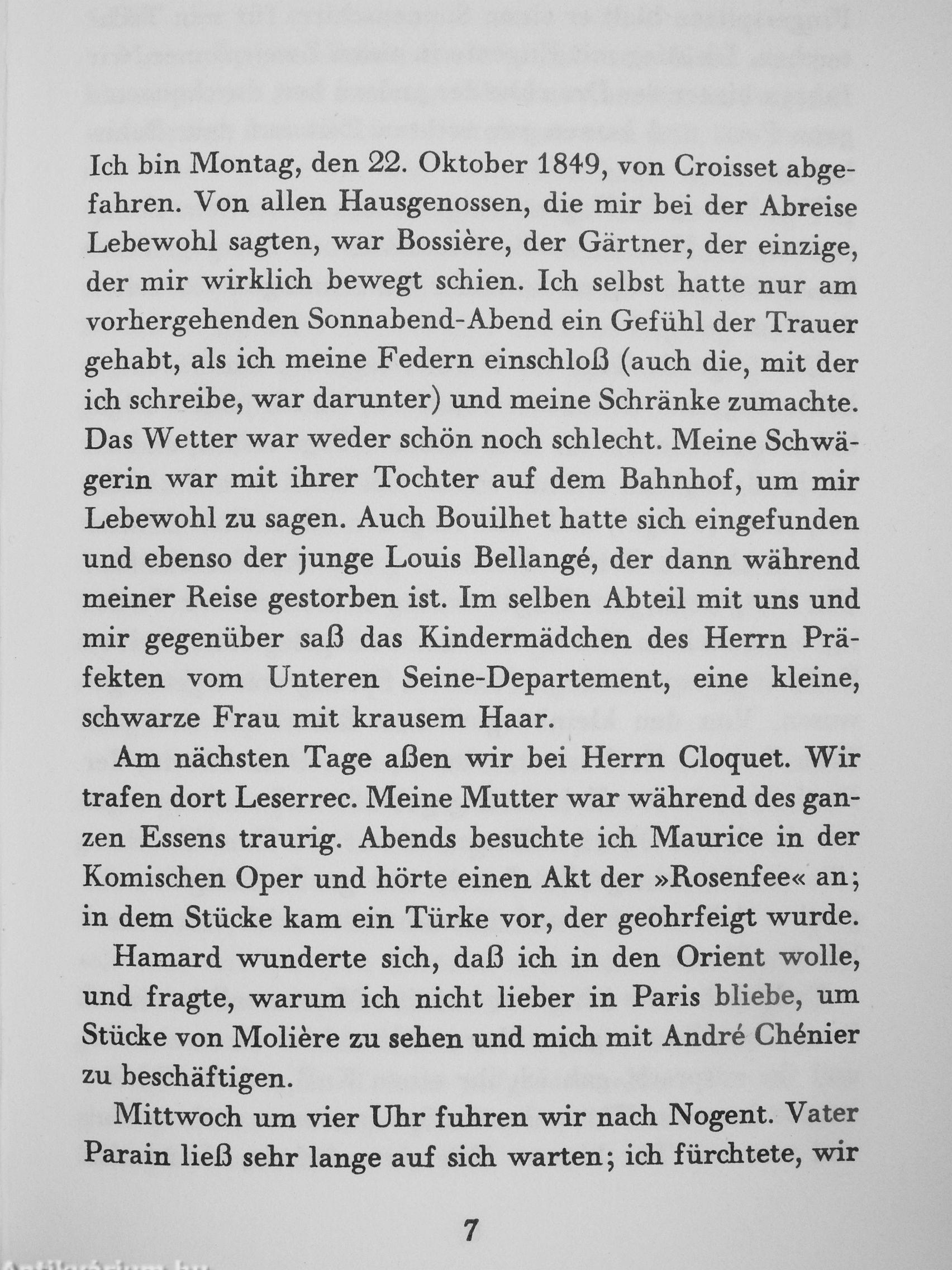 Dieser urwüchsige Normanne, der saftigen Genüssen nicht abhold ist, begibt sich nach der Rückkehr von seiner Orientreise in mönchische Zurückgezogenheit, umjenen Stil zu finden, der Eindrücke, Formen, Farben, Begebenheiten in Sprache zu verwandeln und zu bewahren vermag, jene Sprachform, die ihn zum Meister und zum großen Erzähler machte.