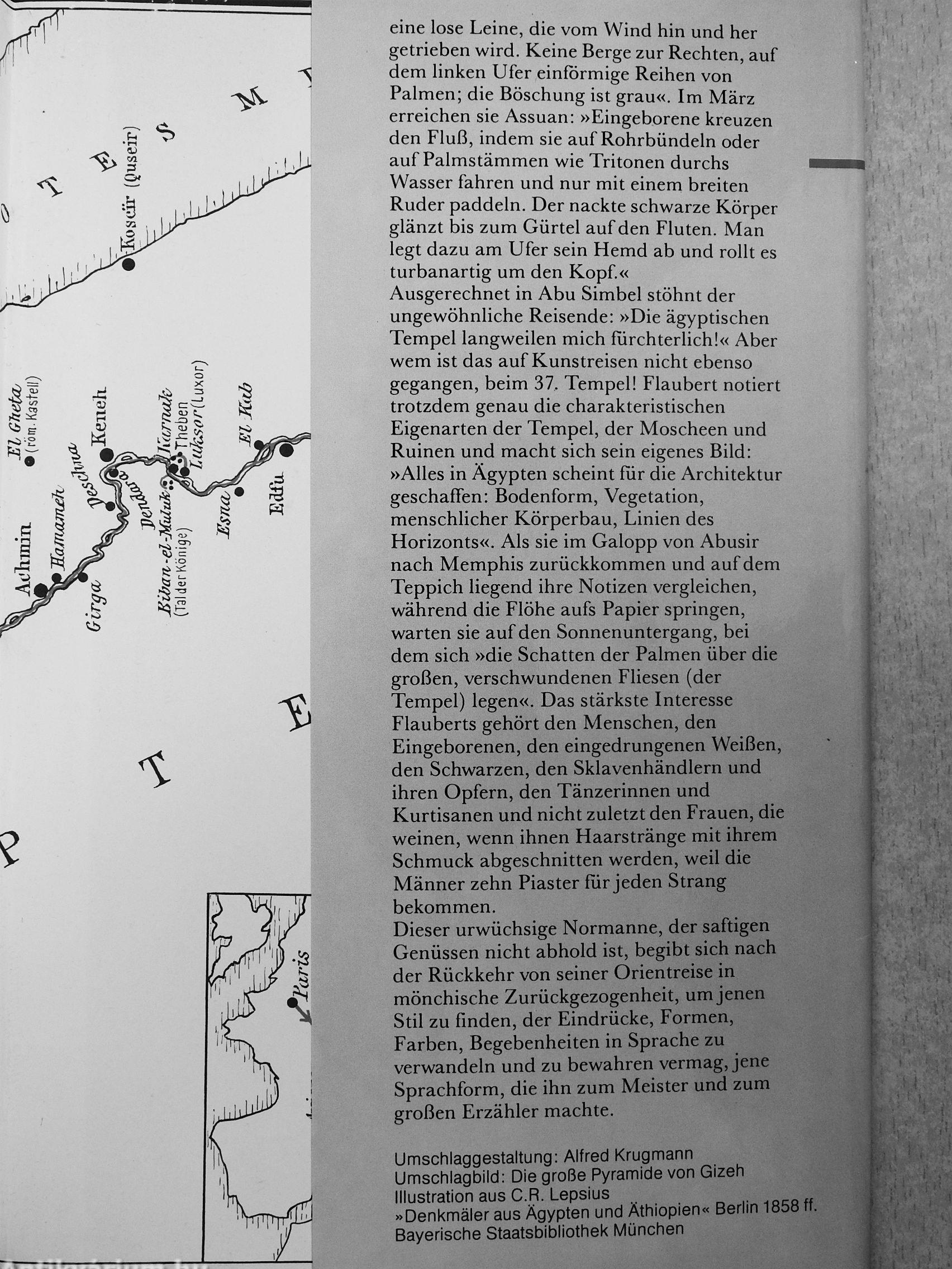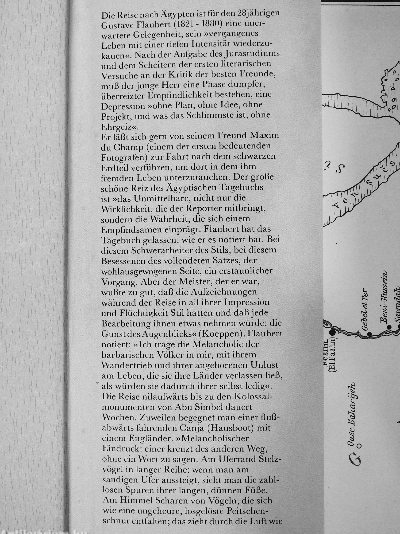 Er läßt sich gern von seinem Freund Maxim du Champ (einem der ersten bedeutenden Fotografen) zur Fahrt nach dem schwarzen Erdteil verfuhren, um dort in dem ihm fremden Leben unterzutauchen. Der große schöne Reiz des Ägyptischen Tagebuchs ist »das Unmittelbare, nicht nur die Wirklichkeit, die der Reporter mitbringt, sondern die Wahrheit, die sich einem Empfindsamen einprägt. Flaubert hat das Tagebuch gelassen, wie er es notiert hat. Bei diesem Schwerarbeiter des Stils, bei diesem Besessenen des vollendeten Satzes, der...